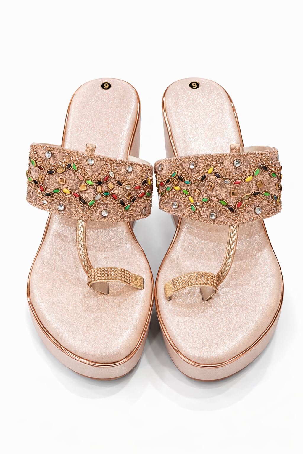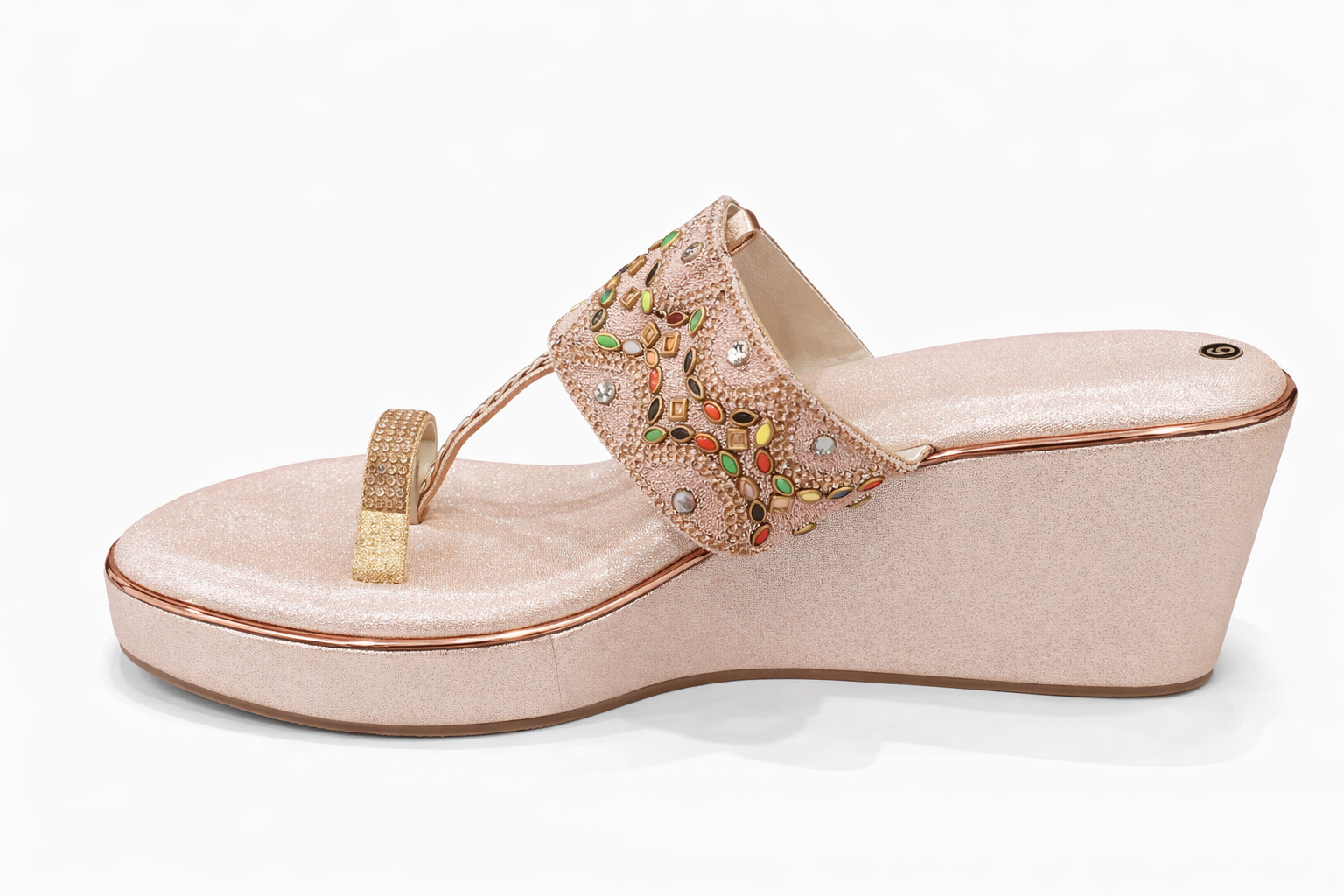 Elevate your festive and everyday ethnic style with these elegant ladies’ wedge sandals, beautifully crafted in a soft blush-pink tone. The wide upper strap is richly embellished with multi-colour stones, crystal accents, and fine bead detailing, creating a vibrant yet refined look. A braided T-strap with a shimmering toe ring adds a touch of traditional charm while ensuring a secure and comfortable fit.Designed for all-day wear, these sandals feature a cushioned, glitter-finish footbed and a sturdy wedge heel that provides excellent support and balance. Finished with subtle rose-gold edging, they are perfect for weddings, festive occasions, parties, and special gatherings. Pair them effortlessly with sarees, lehengas, kurtis, or Indo-western outfits.