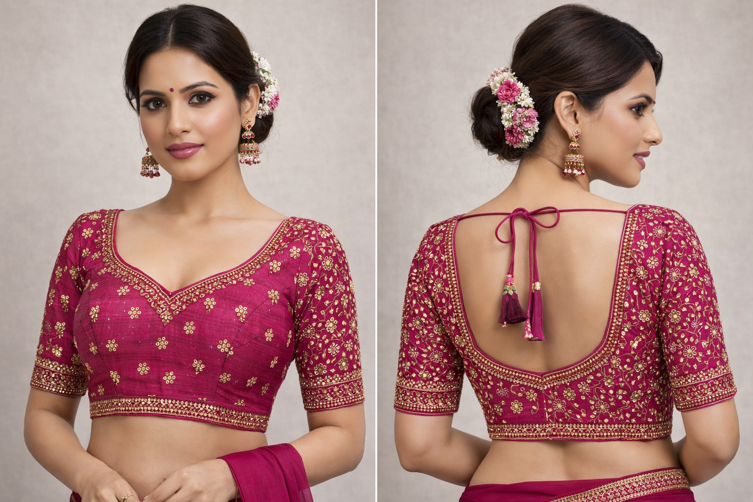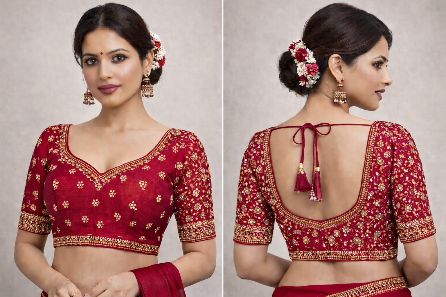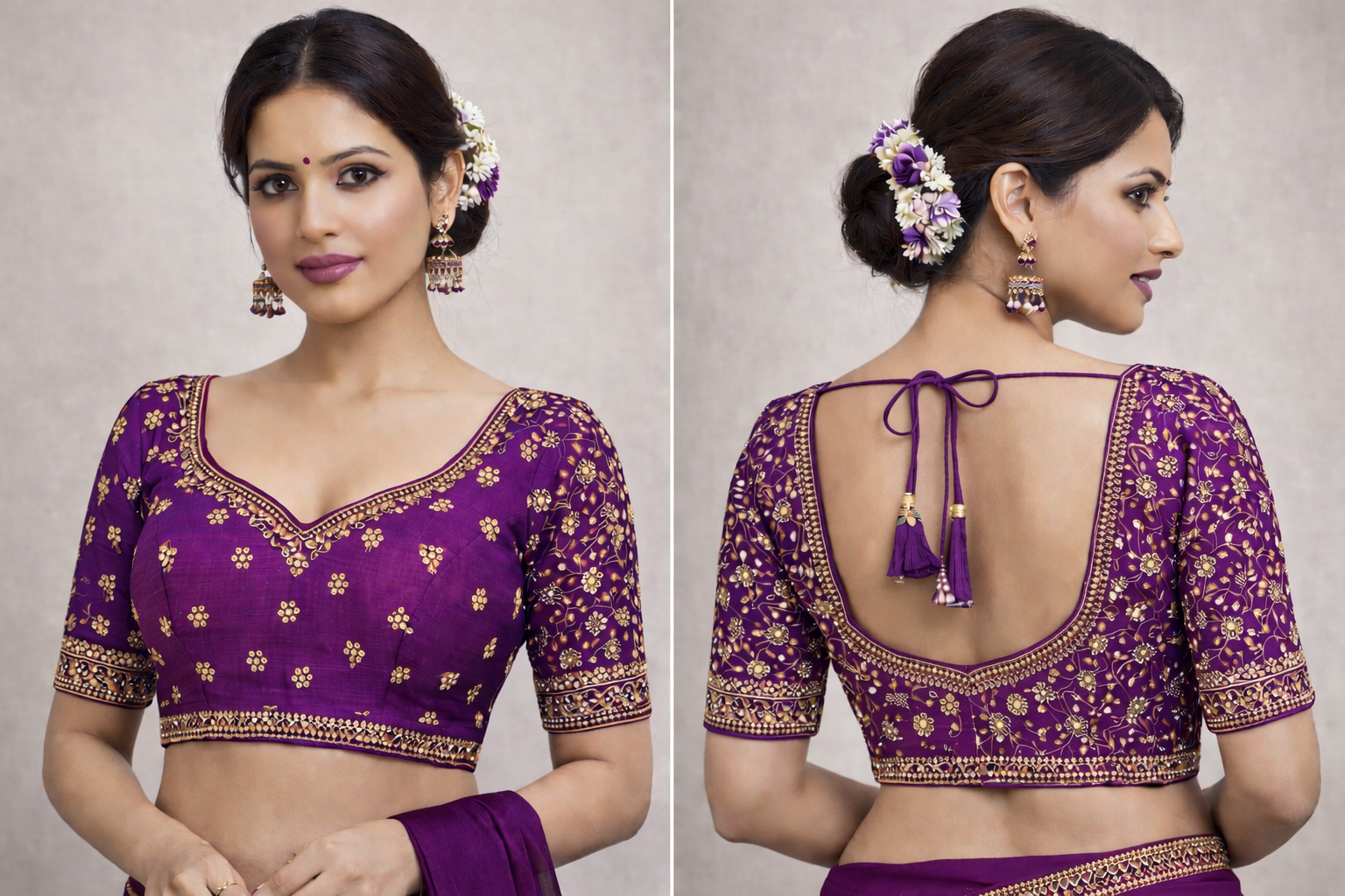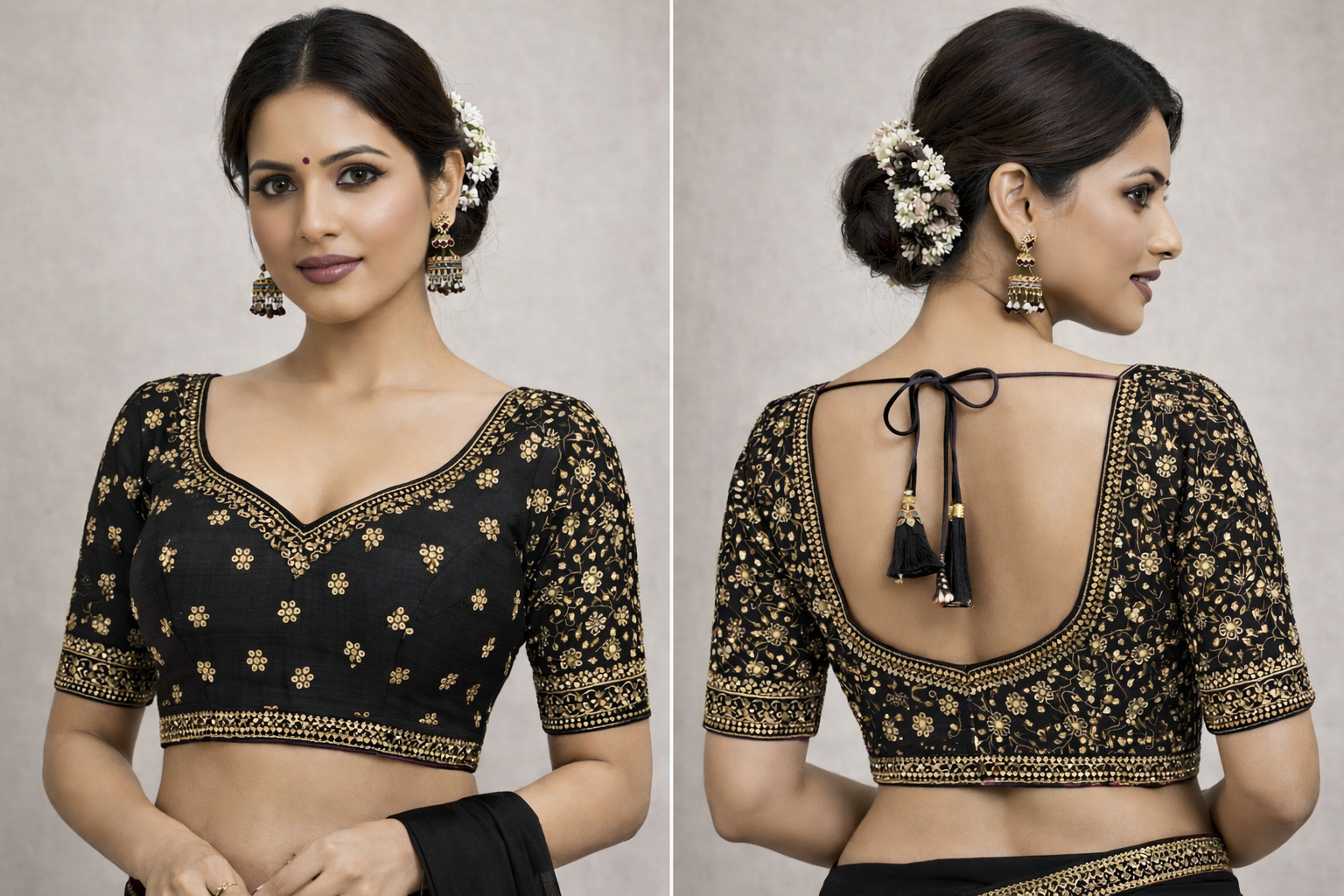 Elevate your ethnic look with this exquisitely crafted designer saree blouse, featuring rich all-over gold embroidery on a premium fabric base. Designed to blend tradition with elegance, this blouse showcases intricate floral motifs that add a luxurious finish, perfect for festive and wedding wear.The front highlights a graceful sweetheart neckline with fine zari detailing, while the back features a deep U-cut design secured with adjustable dori ties and elegant tassels, offering both style and comfort. The elbow-length sleeves are beautifully embroidered, completing the regal look.