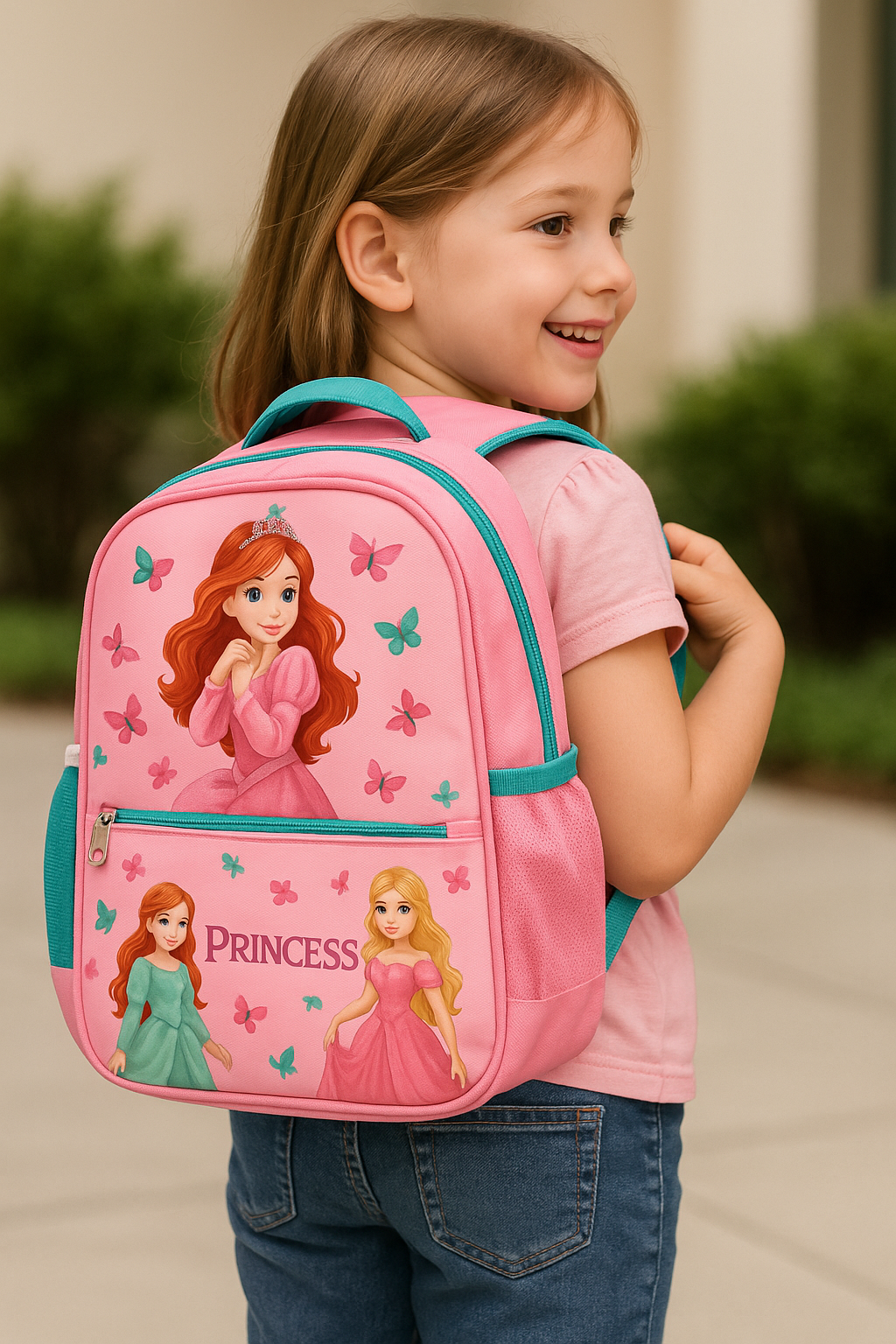 Featuring bright pink tones, teal accents, and charming original princess illustrations surrounded by butterflies, this bag brings a fairytale touch to everyday school use.