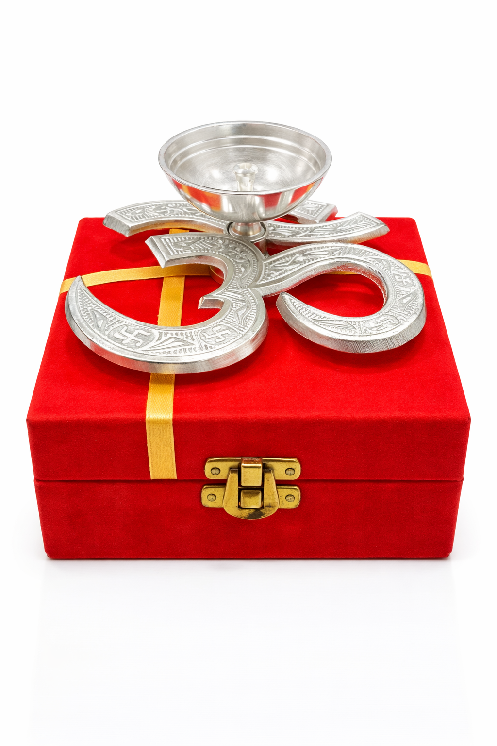 Celebrate faith and elegance with this beautifully crafted Silver Om Designer Diya, presented in a premium red velvet gift box.The diya features a polished silver bowl mounted on an intricately engraved Om symbol base, symbolising peace, positivity, and divine energy. The detailed carvings add a traditional touch, while the smooth reflective finish gives it a refined, premium appeal.Placed on a rich red velvet box with a gold ribbon and classic gold clasp, this piece is perfect for gifting and festive occasions. The luxurious presentation makes it ready for:
