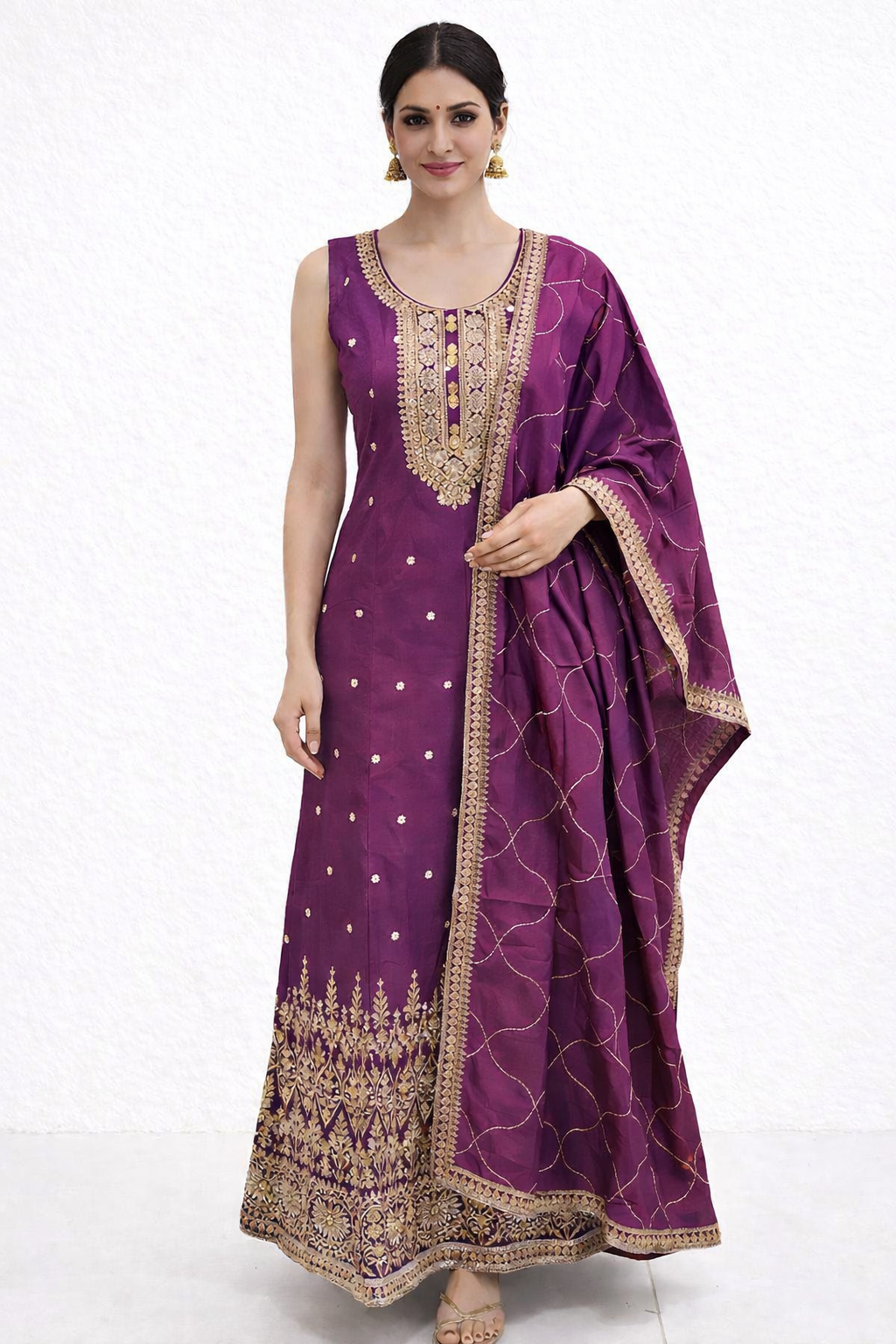 Make a graceful statement with this sleeveless embroidered gown set, designed for timeless festive elegance. Crafted from a rich, flowy fabric, the gown is beautifully enhanced with intricate gold embroidery along the neckline, centre panel, and hem, creating a refined and luxurious look.Paired with a matching dupatta, detailed with delicate all-over threadwork and a finely embroidered gold border, this ensemble offers effortless sophistication. The sleeveless silhouette adds comfort while maintaining a polished ethnic finish.Perfect for weddings, festive celebrations, poojas, and special occasions, this gown set blends classic craftsmanship with modern style.