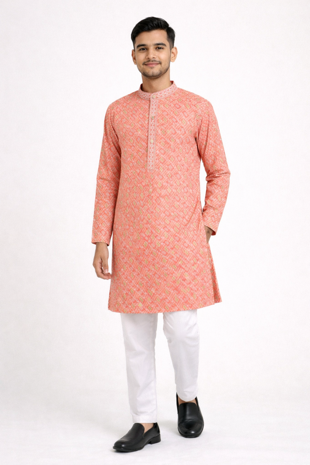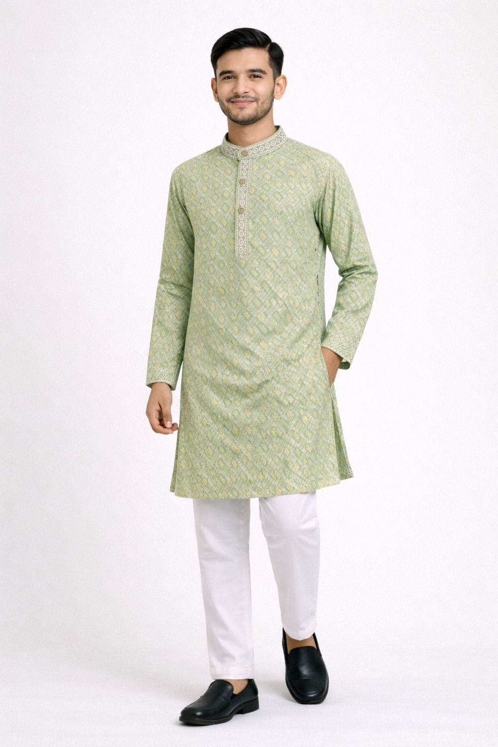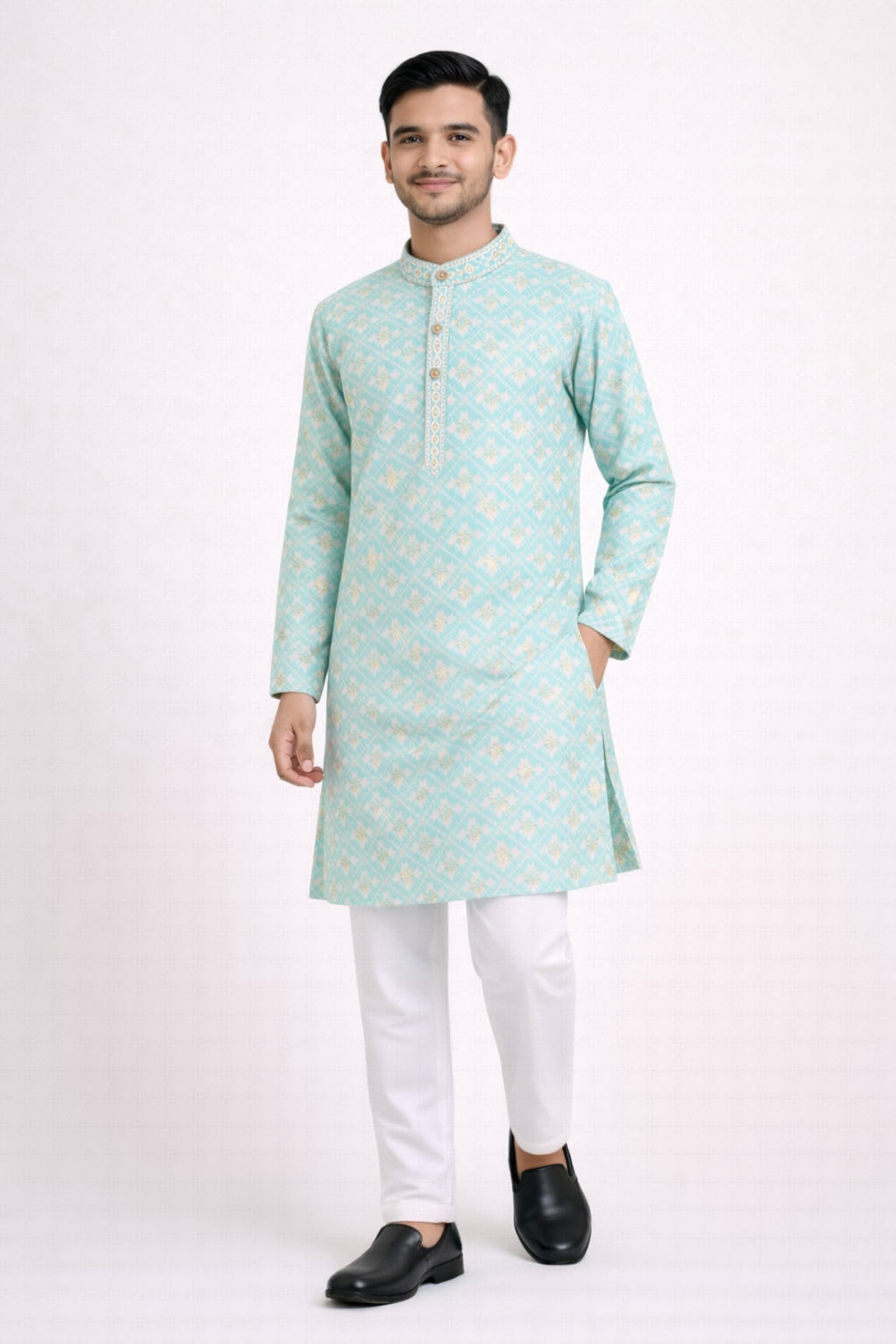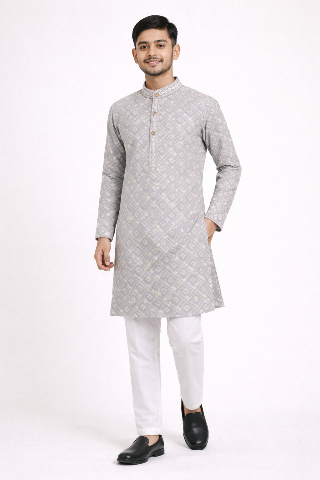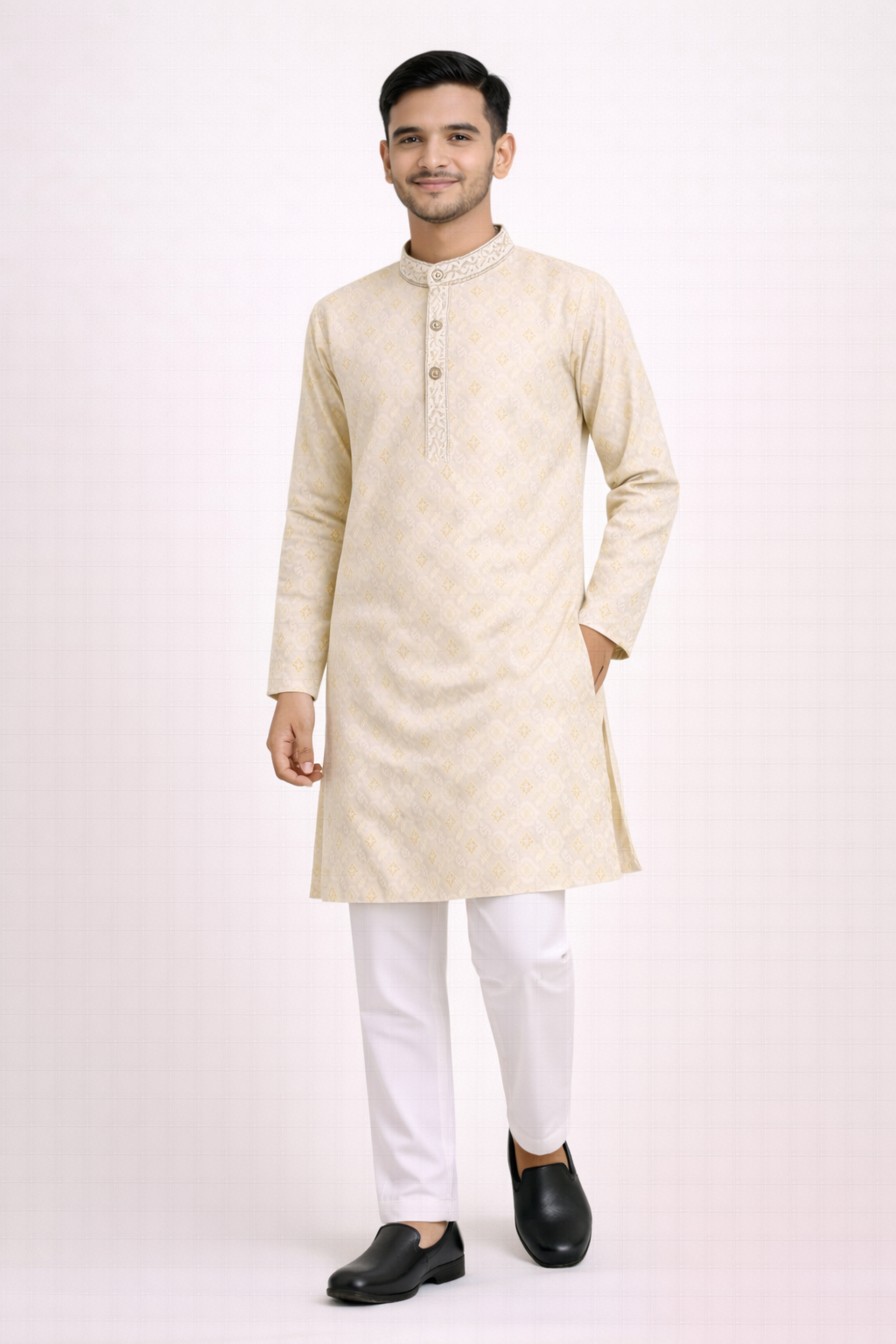 Elevate your festive and traditional wardrobe with this elegant off-white kurta set, designed for a refined and timeless look. Crafted from premium fabric, the kurta features subtle all-over woven motifs enhanced with delicate sequin detailing, adding a soft festive shimmer without overpowering the design.The mandarin collar and embroidered placket lend a classic ethnic touch, while the straight silhouette ensures a comfortable and flattering fit. Paired with crisp white trousers and styled with formal shoes, this kurta set is perfect for weddings, festive celebrations, religious functions, and special occasions