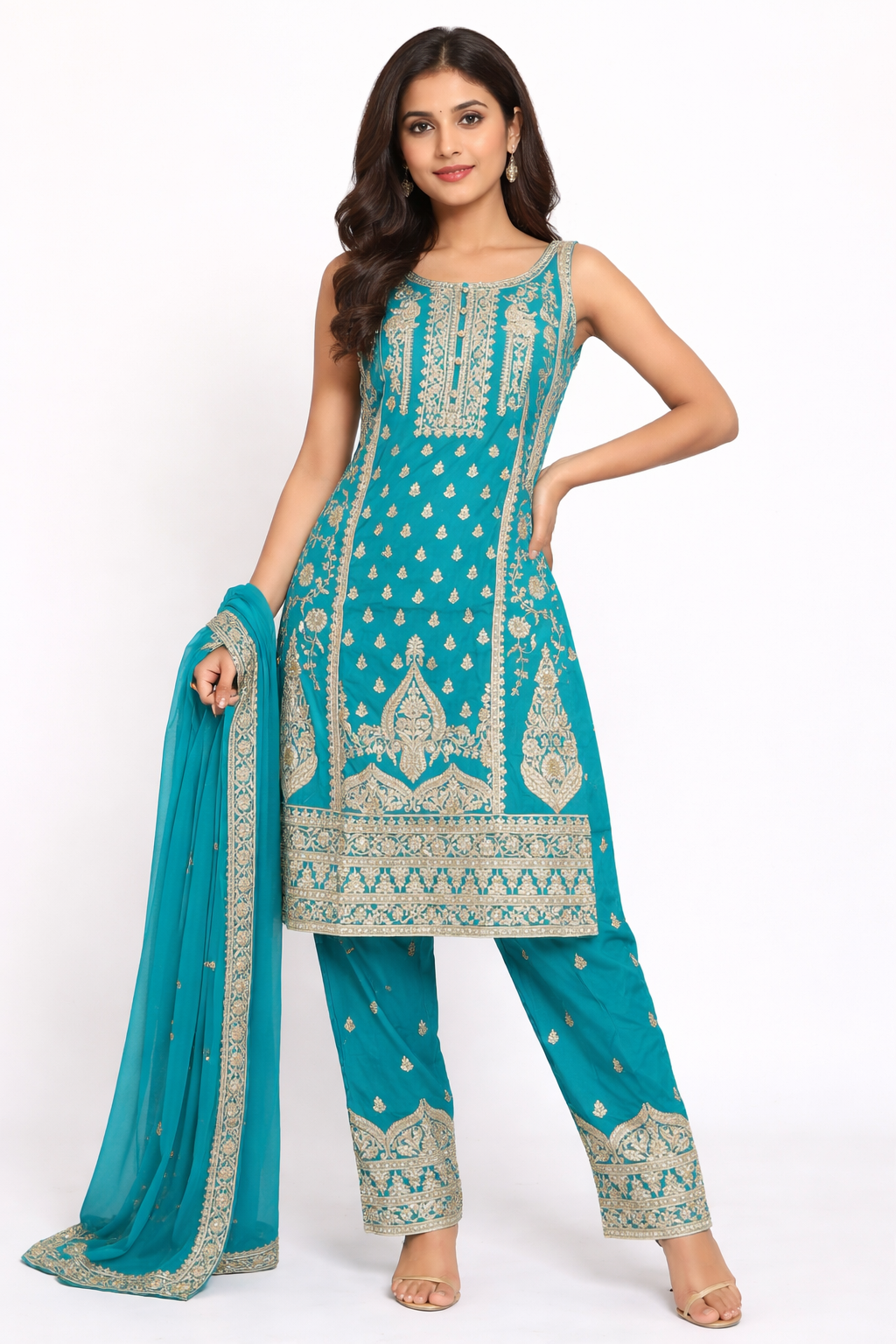 Make a graceful statement with this elegant Straight Kameez Set, crafted for festive and special occasions. The rich rani pink base is beautifully enhanced with intricate gold embroidery featuring traditional floral and paisley motifs. The straight-cut silhouette offers a flattering, timeless look, perfect for both day and evening wear.The kameez is paired with matching embroidered pants that complement the overall design, while the soft dupatta with a detailed gold border adds a refined finishing touch. This ensemble blends classic Indian craftsmanship with modern elegance, making it an ideal choice for weddings, festivals, parties, and celebrations.