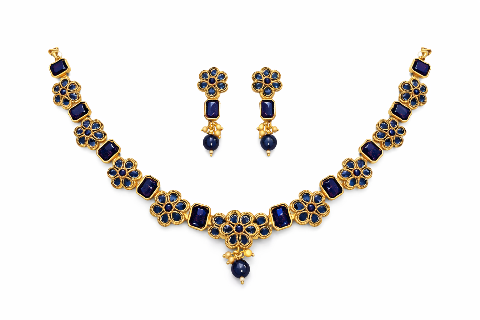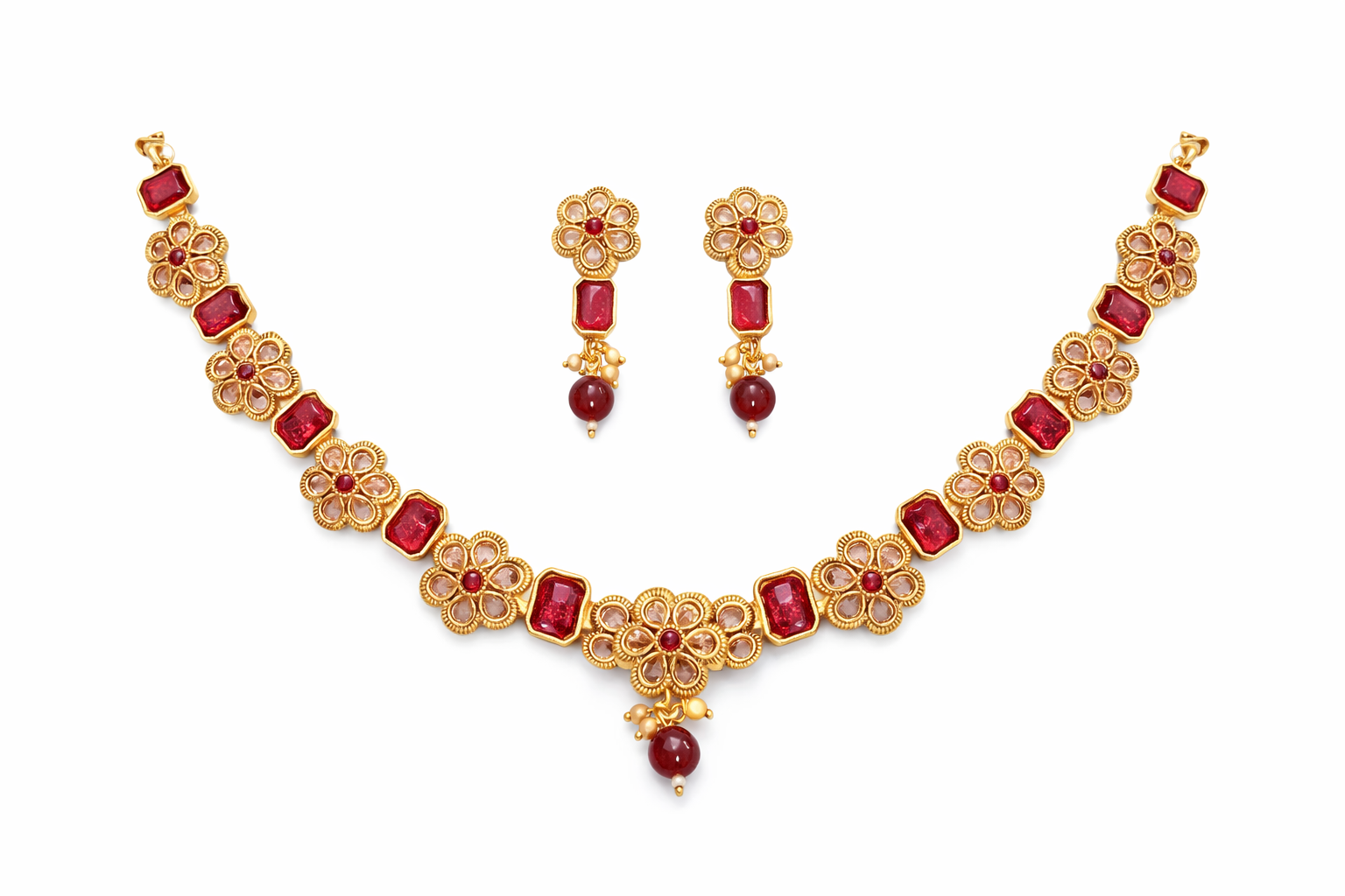 Add timeless grace to your festive and bridal look with this exquisitely crafted Kundan necklace set. Designed in a classic gold-tone finish, the necklace features a beautiful combination of floral motifs and rectangular ruby-tone stones, highlighted with shimmering Kundan detailing. The centre drop is elegantly finished with a rich bead accent, adding a touch of royal charm..The matching earrings mirror the necklace design perfectly, creating a coordinated and sophisticated set that enhances both traditional and contemporary outfits. Ideal for weddings, receptions, festive celebrations, and special occasions.