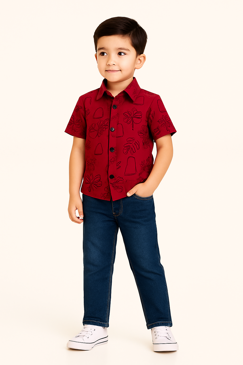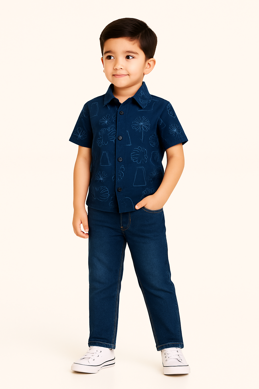 Smart and comfortable boys’ outfit featuring a soft printed collared shirt paired with blue denim — available in both long pants and shorts. Perfect for daily wear, outings and family events. Fabric is soft, breathable and easy to maintain. Sizes available from 4 to 10 years.
