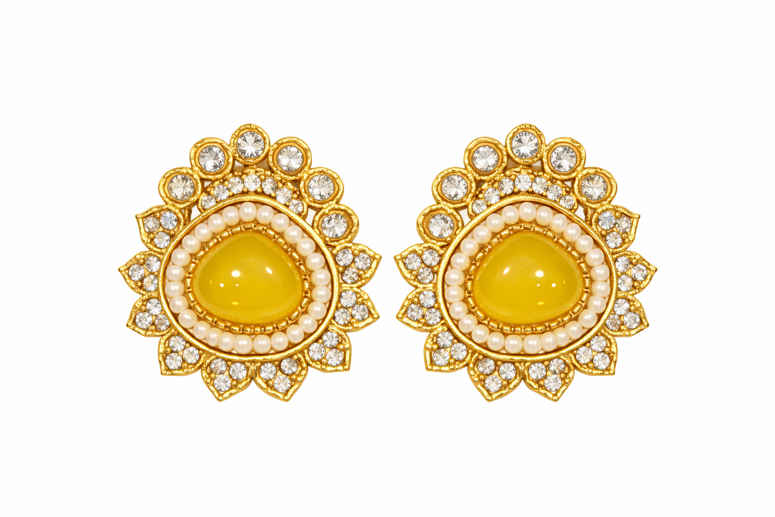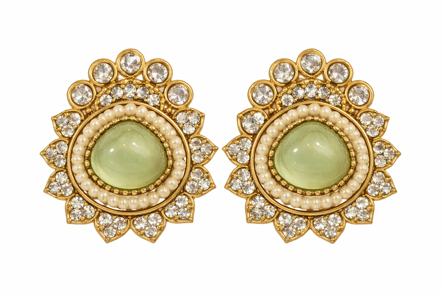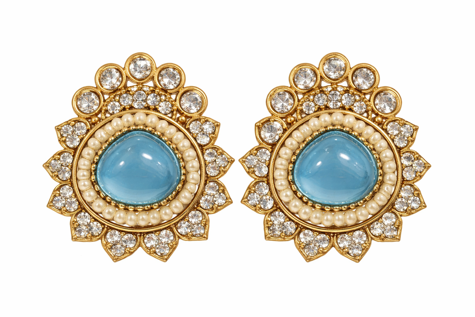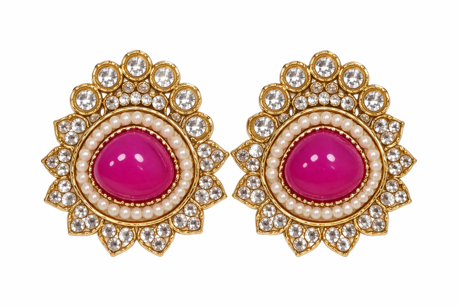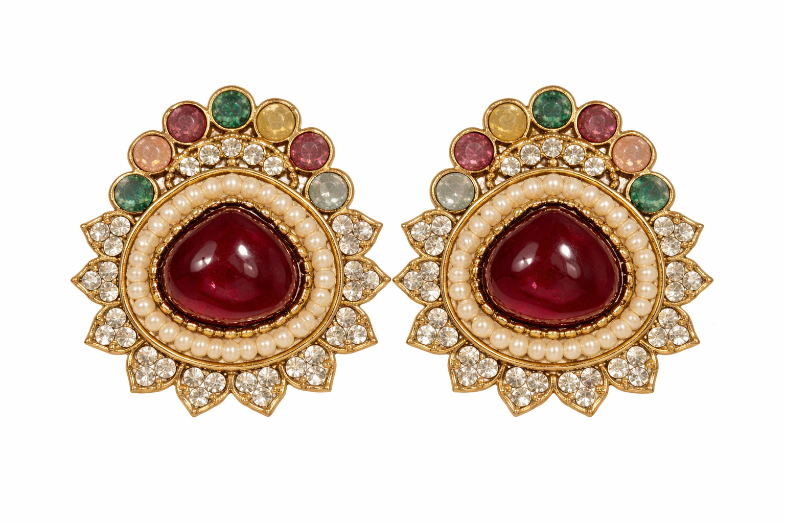 Product Details:• Design: Floral stud style• Center Stone: Teardrop cabochon (available in multiple colors)• Embellishment: Pearl ring with crystal detailing• Finish: Gold-tone polish• Style: Ethnic / Festive / Party wear