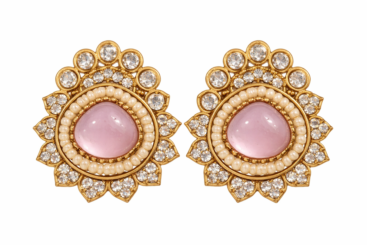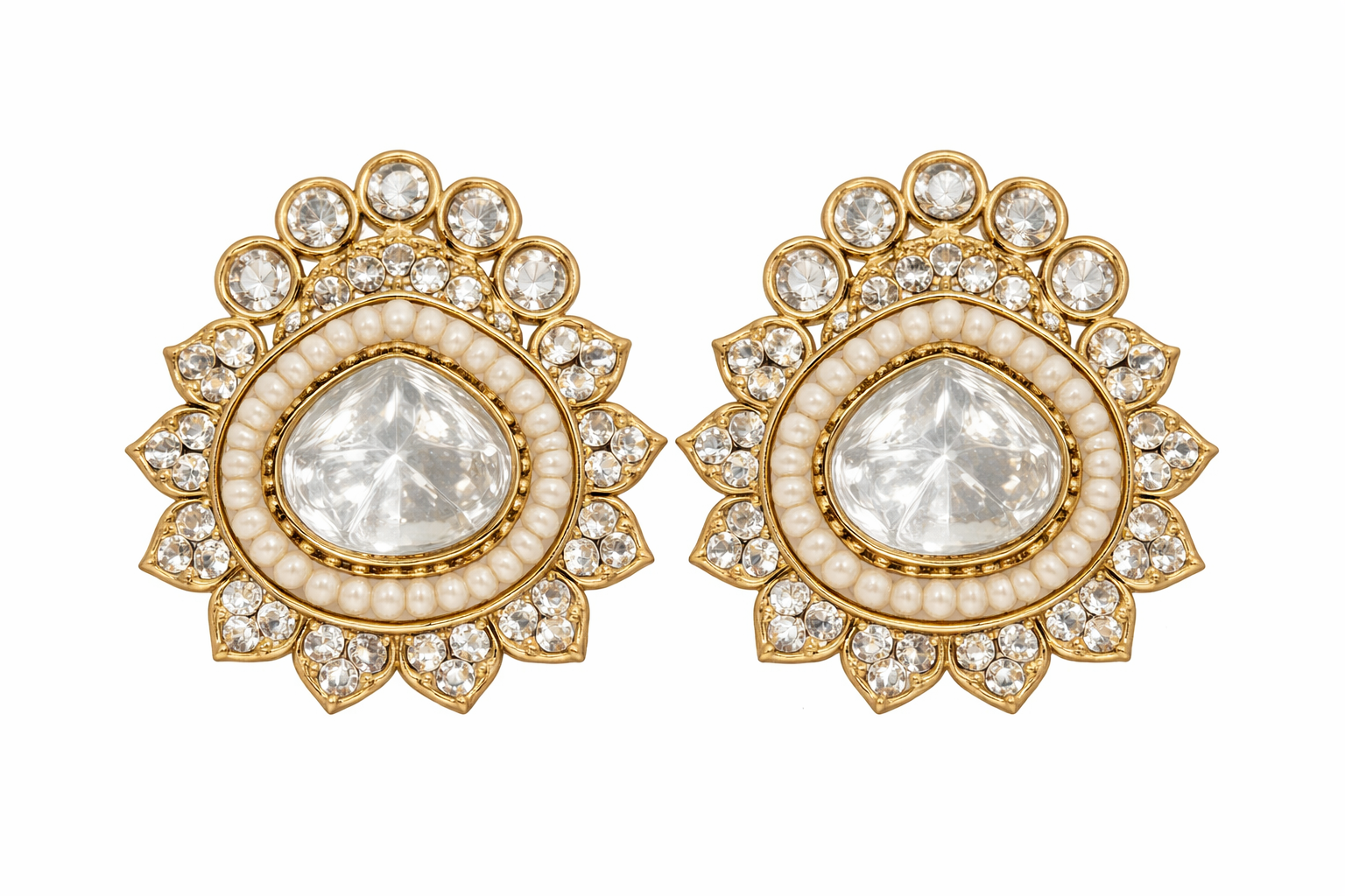 These beautifully crafted stud earrings feature a timeless floral design, centered with a stunning teardrop-shaped stone that adds a touch of refined elegance. The centerpiece is surrounded by a delicate ring of pearl detailing, enhancing its classic charm, while the outer layer is adorned with sparkling crystals arranged in a radiant floral pattern.