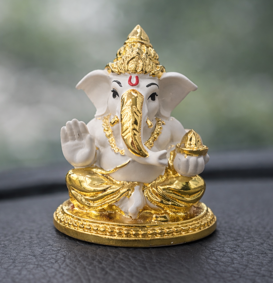 A beautifully crafted small Lord Ganesha idol designed perfectly for car dashboards. This elegant piece features a pure white body with rich gold detailing on the crown, trunk, jewelry, and base, giving it a premium and divine look. Lord Ganesha is seated gracefully with his right hand raised in blessing (Abhaya Mudra) and a golden modak in his left hand, symbolizing prosperity and success.