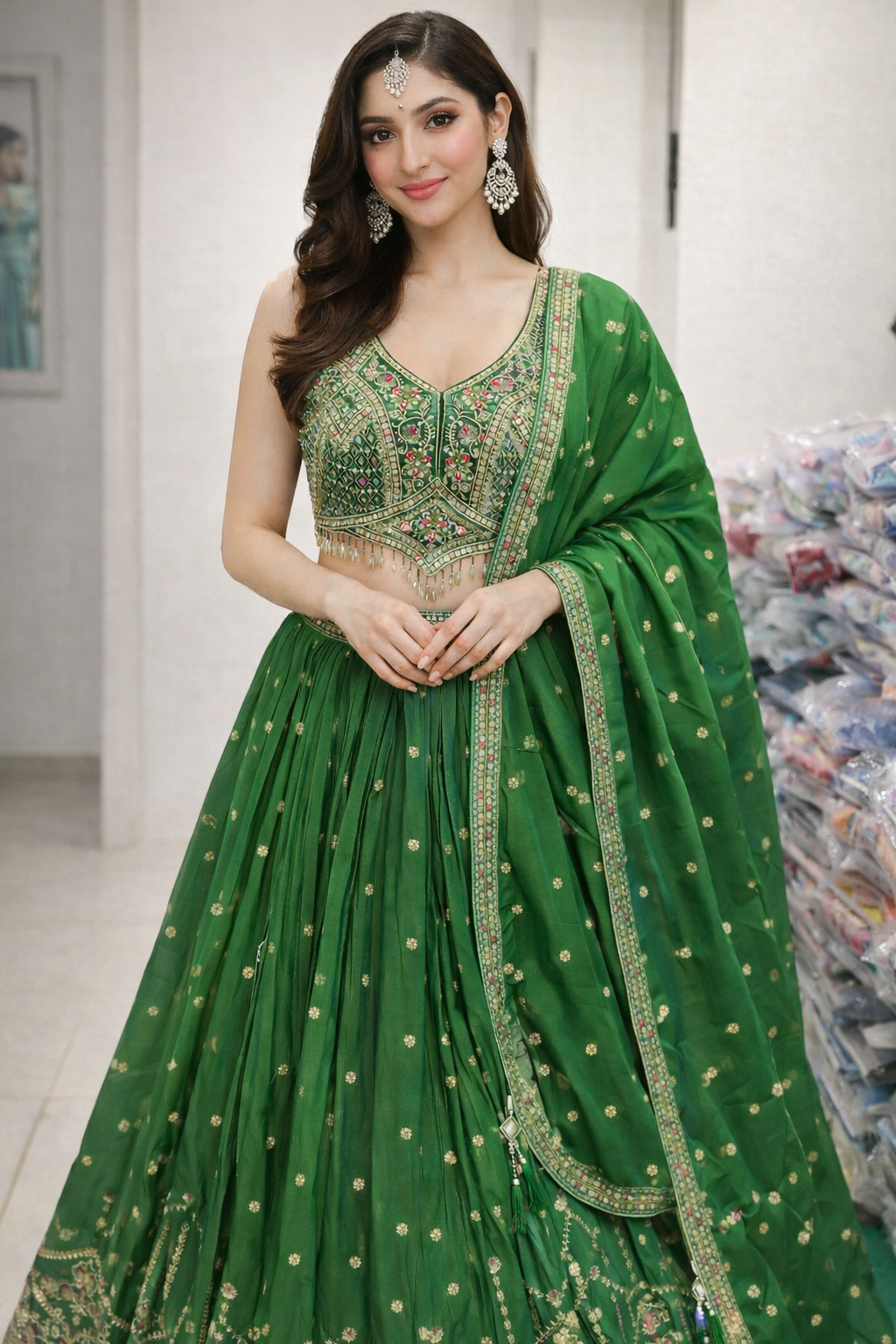 Elevate your festive and wedding wardrobe with this exquisite lehenga suit, designed to make a graceful statement. Crafted in a rich, elegant hue, the ensemble features a heavily embroidered sleeveless blouse adorned with intricate zari, resham, and sequin work, enhanced with delicate bead hangings at the hem for a luxurious finish.The flowing lehenga skirt is beautifully pleated and embellished with subtle butti motifs, finished with a richly embroidered border that adds depth and grandeur. Complementing the look is a matching dupatta, detailed with fine embroidery and scattered motifs, completing the ensemble with timeless elegance.Perfect for weddings, receptions, festive celebrations, and special occasions, this lehenga suit blends traditional craftsmanship with a refined modern silhouette, making it an ideal choice for those who love premium ethnic wear.