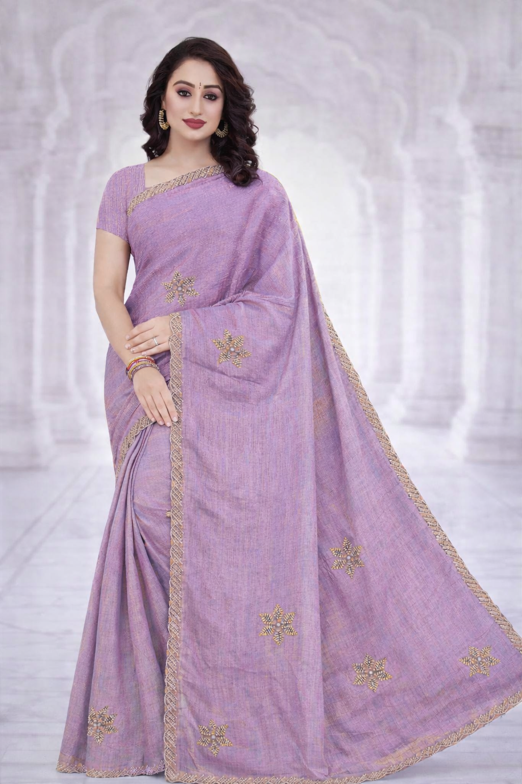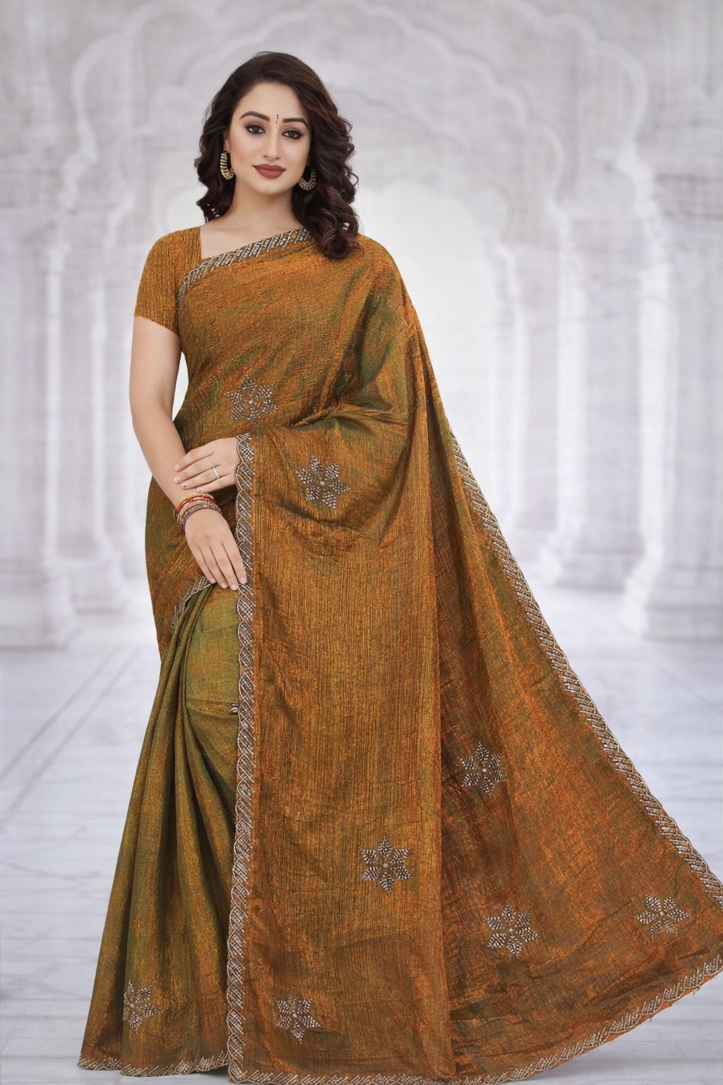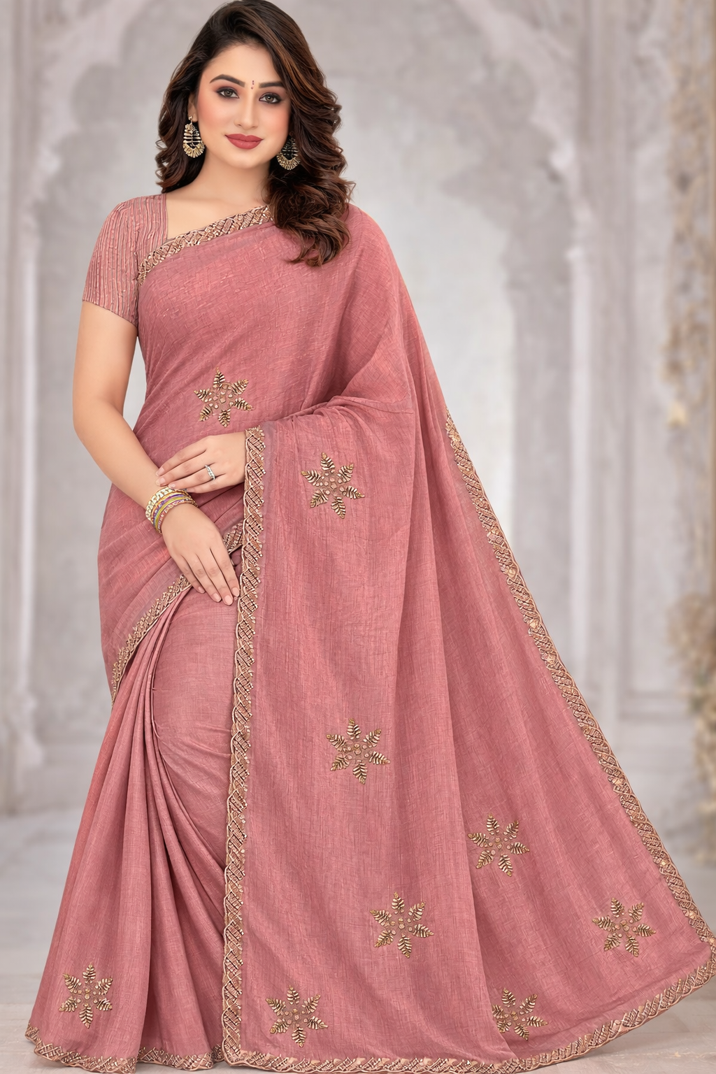 Paired with a matching blouse featuring textured detailing on the sleeves, the ensemble creates a perfectly balanced festive look. The soft tone makes it a versatile choice for weddings, festive gatherings, parties, and special occasions.