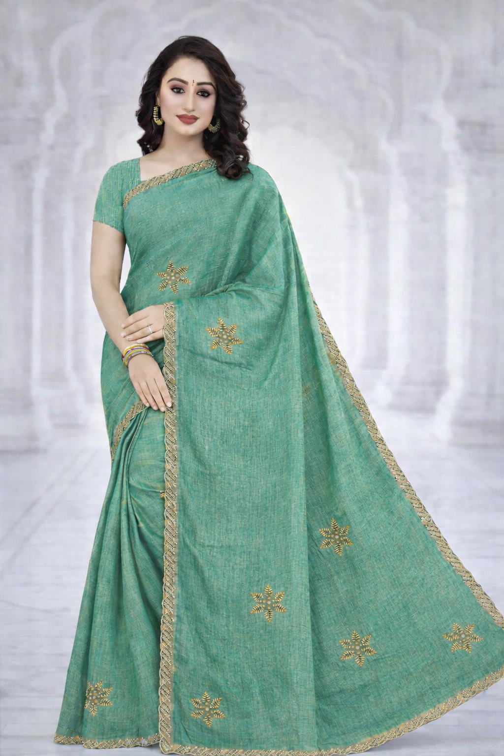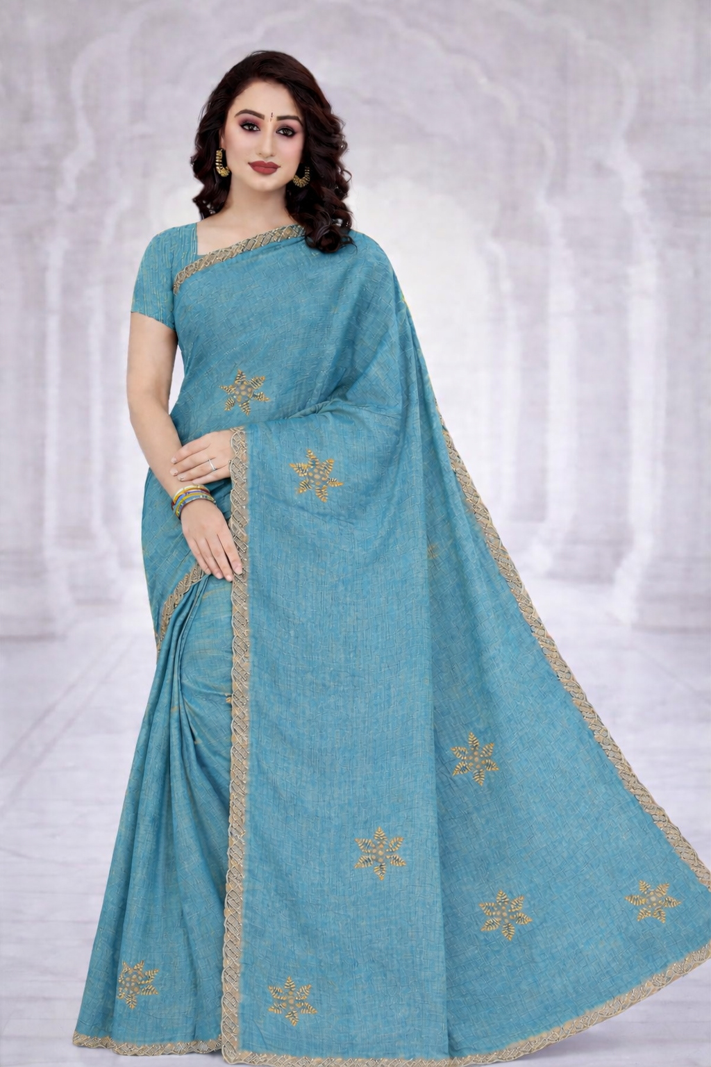 The saree features delicate gold embroidered floral motifs scattered across the body, adding a subtle touch of luxury. A finely detailed gold border runs along the edges, enhancing the overall richness of the design while maintaining a graceful and minimal aesthetic.