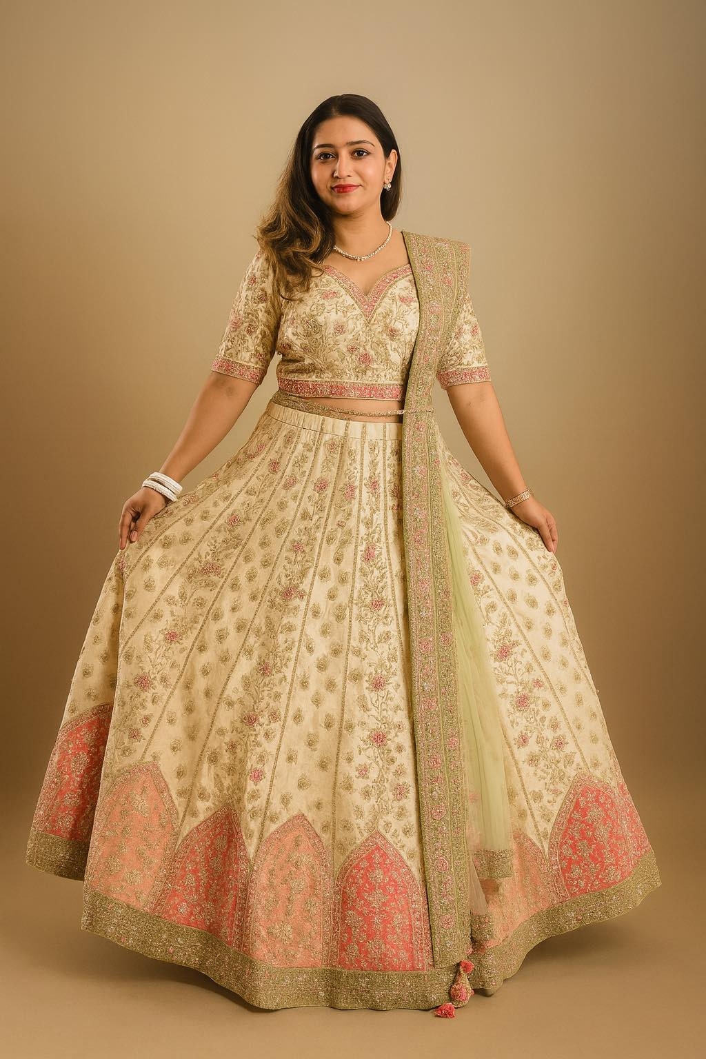 To add a personal touch to the outfit, customizable sleeves can be added. This allows the bride to choose the sleeve length and style that suits her preferences and complements her overall look. Whether she prefers full sleeves, half sleeves, or even sleeveless, the customizable sleeves option ensures that the lehenga suit is tailored to her liking.