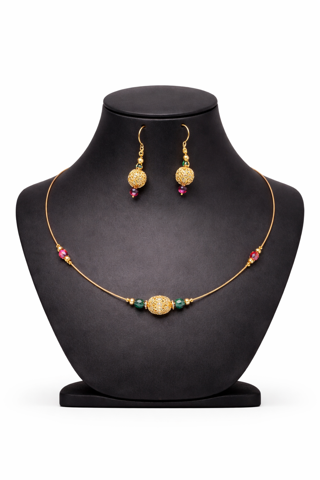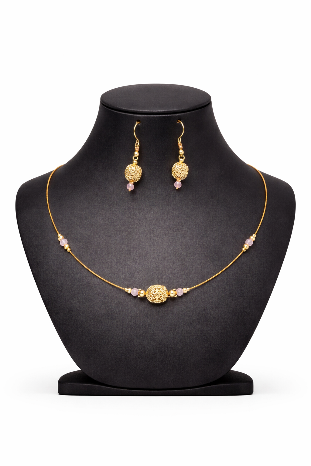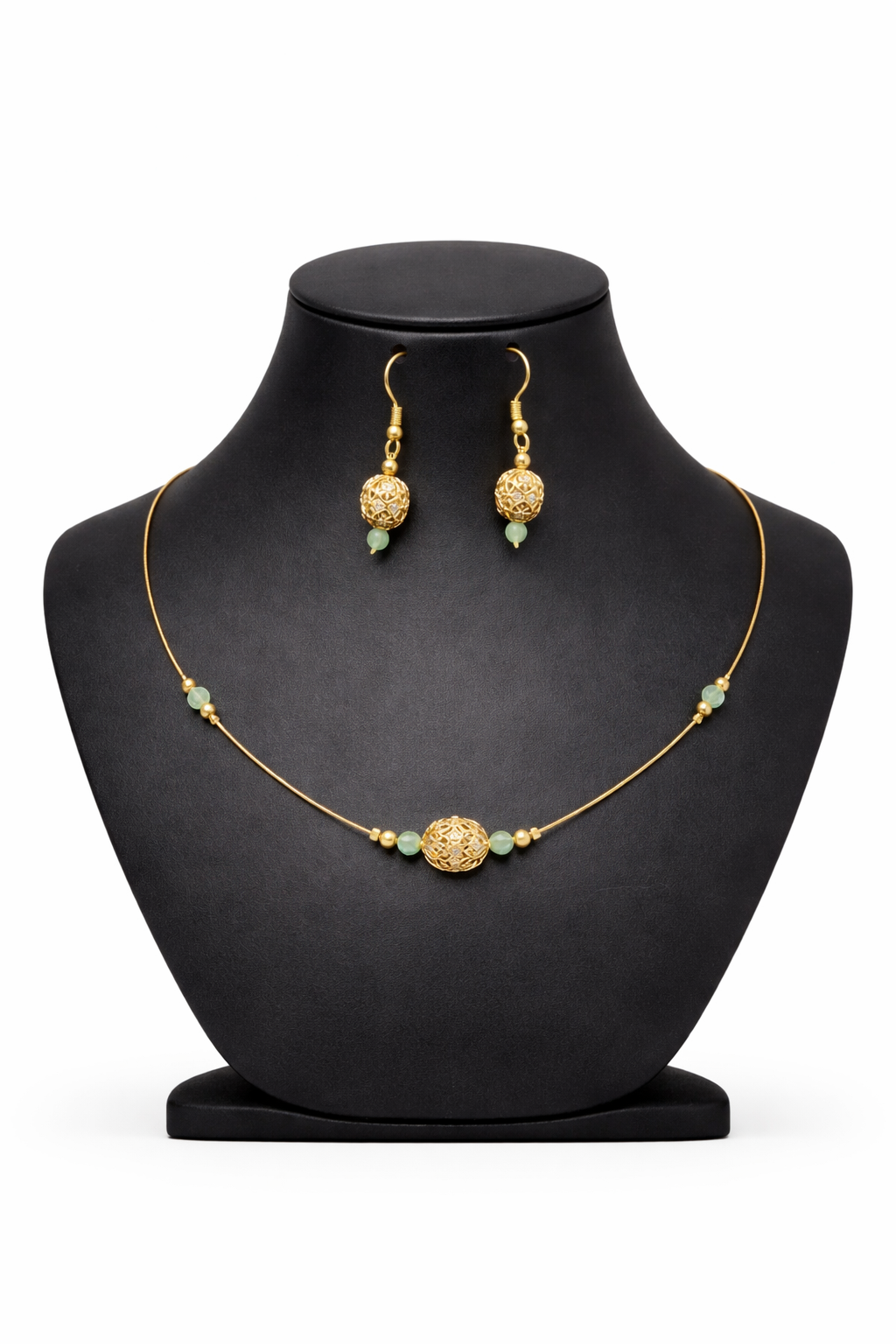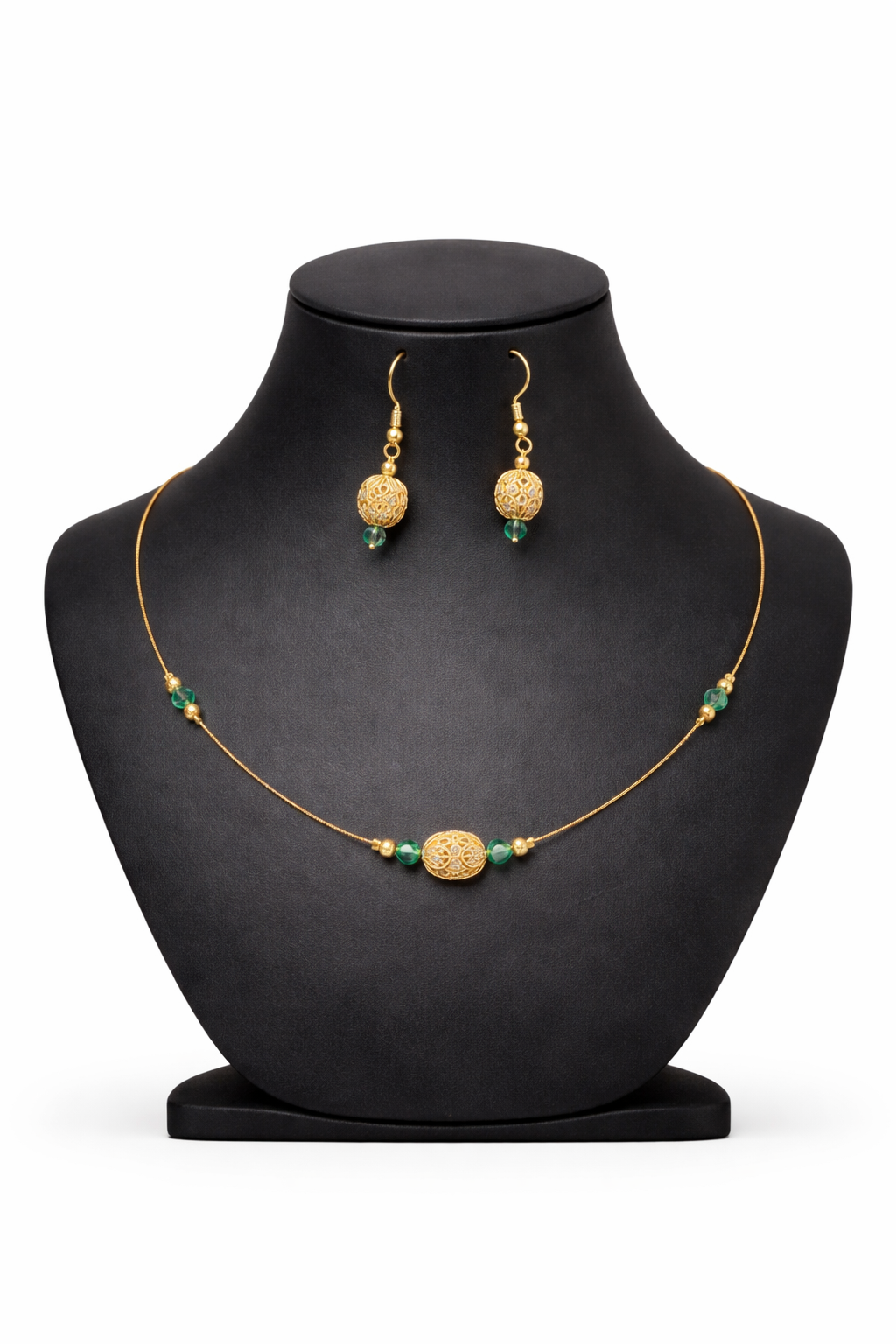 The centerpiece showcases an intricately designed gold bead, adding a soft focal point while maintaining a lightweight and graceful feel. The matching drop earrings mirror the same craftsmanship, completing the set with perfect harmony.Ideal for both daily wear and light festive occasions, this set blends simplicity with timeless charm.