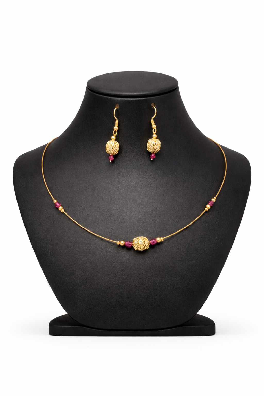 Refined, minimal, and effortlessly elegant — this delicate gold necklace set is designed for everyday sophistication. Featuring a sleek gold chain adorned with finely crafted textured beads and subtle maroon stone accents, this piece brings a touch of understated luxury to your look.