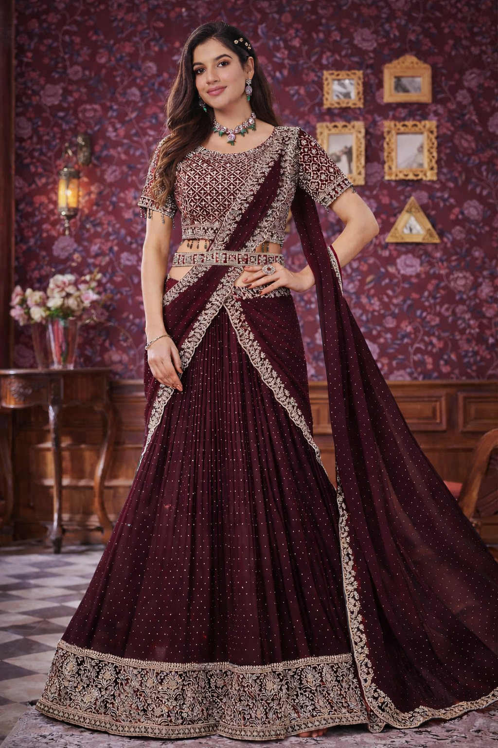 Exude elegance and modern tradition with this stunning colour choli lehenga saree, designed to give the perfect fusion of saree drape and lehenga flair. Rich in colour and craftsmanship, this ensemble is ideal for festive and special occasions.The beautifully embroidered short-sleeve choli features intricate geometric and floral motifs, enhanced with fine detailing for a regal finish. The lehenga skirt flows gracefully with soft pleats, highlighted by delicate all-over embellishments and a richly embroidered hem. Styled with a matching wine dupatta draped in a saree-inspired manner, this outfit creates a sophisticated, contemporary silhouette.Perfect for weddings, receptions, festive gatherings, and evening celebrations, this choli lehenga saree offers effortless glamour with comfort.