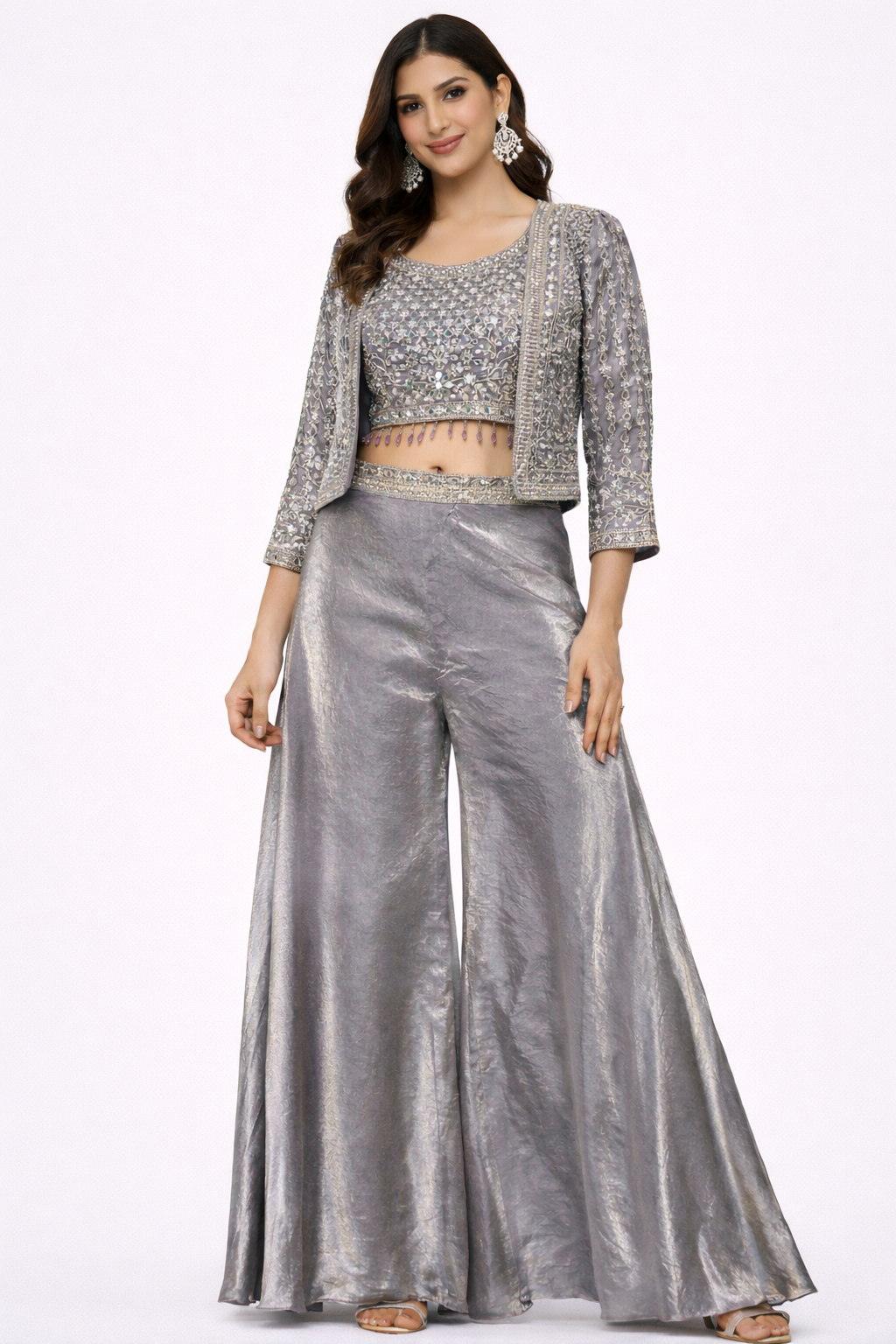 Choli Jacket Style Flare Palazzo Suit Add a touch of modern elegance to your festive wardrobe with this sophisticated choli jacket style flare palazzo suit in a chic tone. The ensemble features a beautifully embroidered cropped choli paired with an open-front jacket, both adorned with intricate silver threadwork and delicate sequin detailing that creates a refined shimmer. .The contemporary silhouette blends traditional craftsmanship with a fashion-forward appeal.The matching flared palazzo pants offer a graceful fall and effortless movement, completing the look with understated luxury. Perfect for cocktail events, receptions, festive evenings, and wedding functions, this outfit is designed for women who love elegant yet statement-making styles.