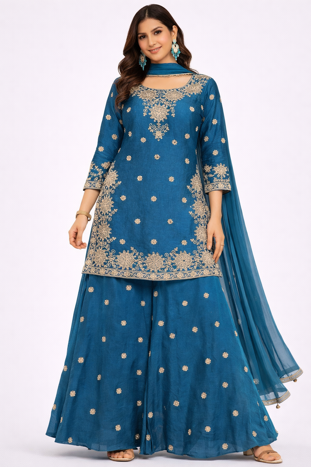 Bright, graceful, and effortlessly elegant, this flare palazzo suit is designed to make a statement at every festive occasion. The kurta features intricate gold embroidery around the neckline and hem, complemented by delicate butti work scattered across the fabric for a refined, luxurious look. The rich hue adds vibrance while maintaining a timeless ethnic appeal.The matching flared palazzo pants create a flowy silhouette with elegant movement, enhanced by coordinated embroidery motifs that complete the ensemble beautifully. Finished with a lightweight sheer dupatta in a matching tone, this outfit is perfect for weddings, festive gatherings, and special celebrations.