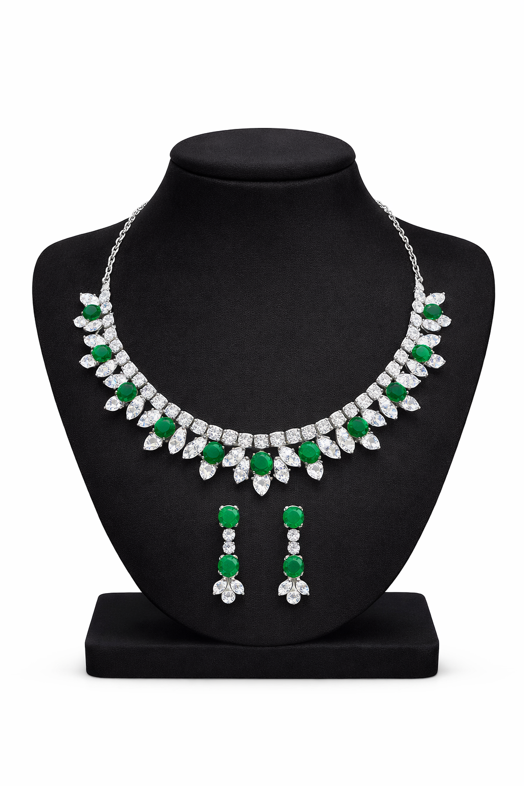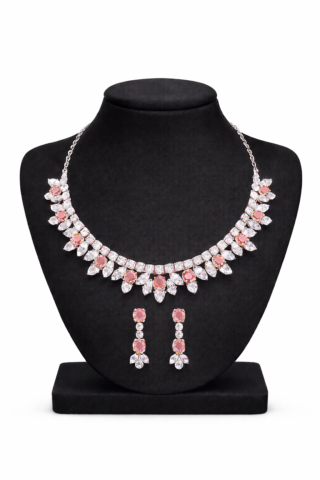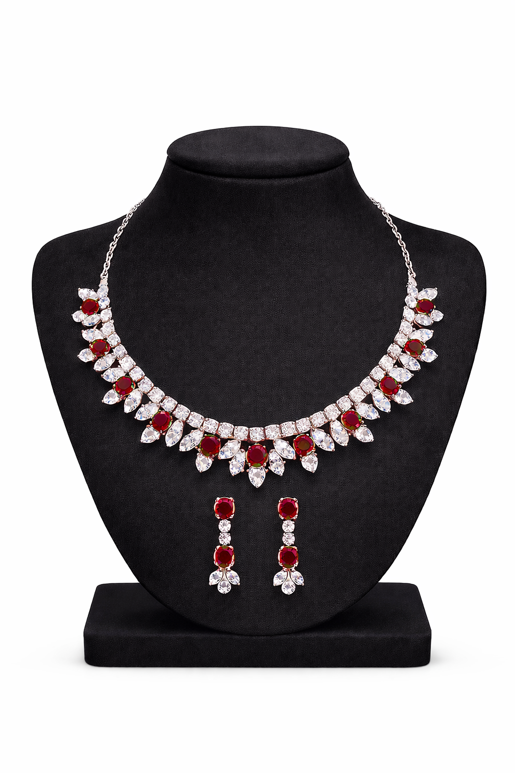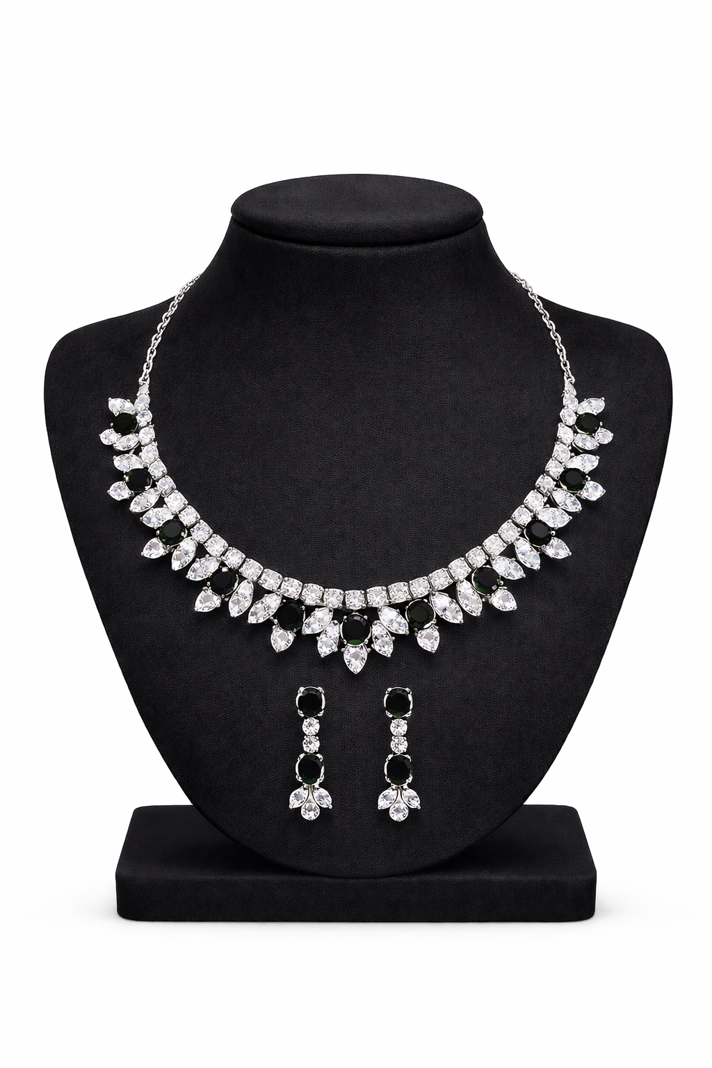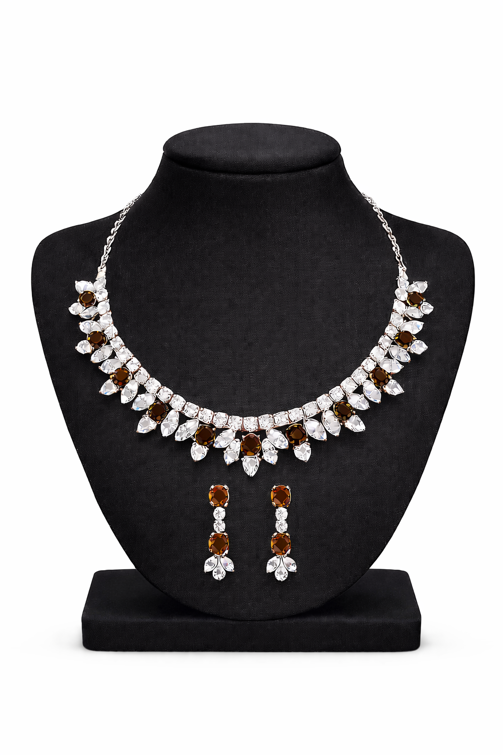 This elegant necklace set features rich oval-cut stones beautifully paired with sparkling clear cubic zirconia, arranged in a graceful floral pattern. Crafted in a sleek silver-tone finish, the necklace sits perfectly on the neckline and is complemented by matching drop earrings for a refined and sophisticated look.