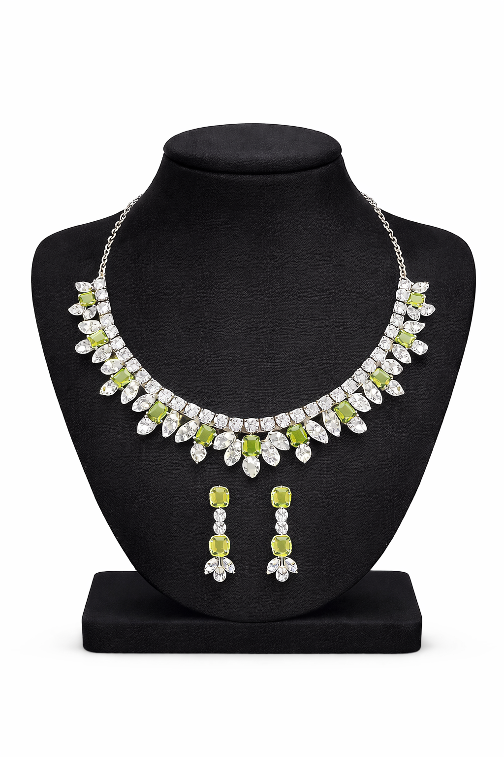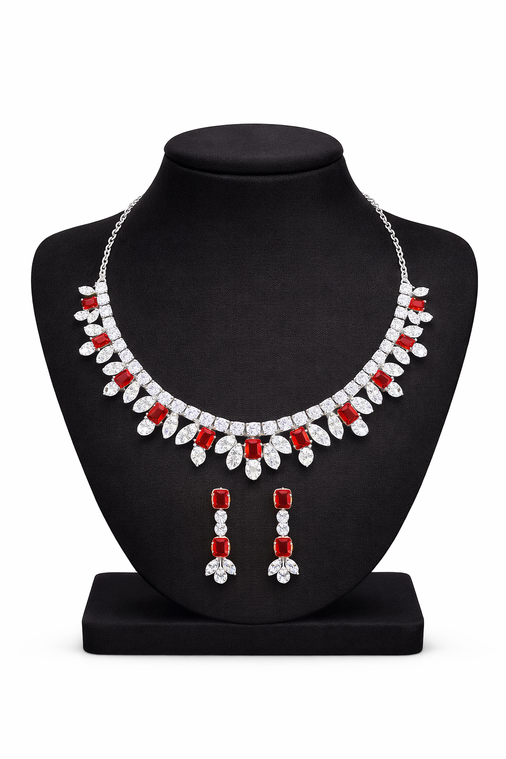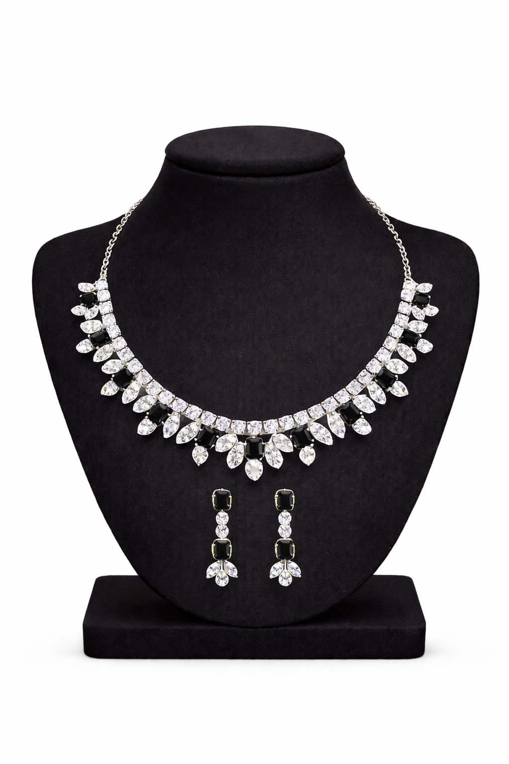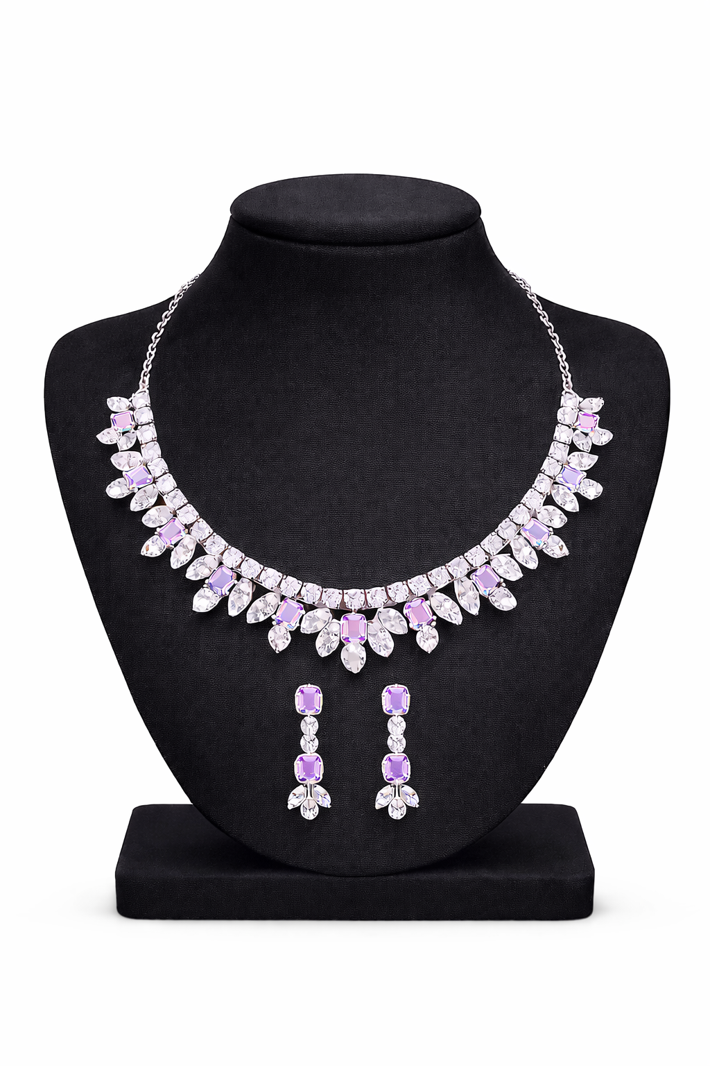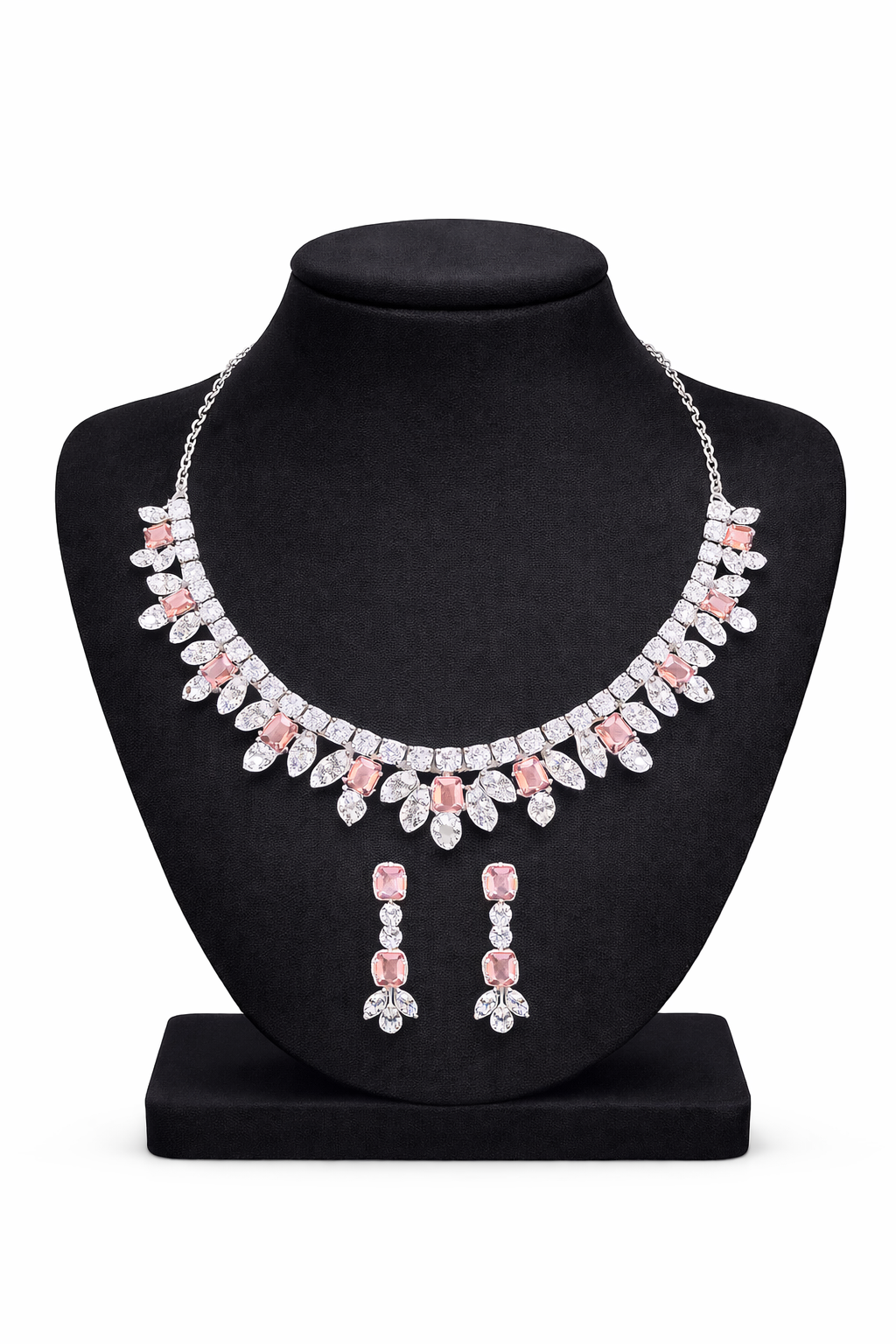 This elegant necklace set is beautifully crafted with stones paired with sparkling clear cubic zirconia, arranged in a graceful floral pattern. Finished in a sleek silver-tone setting, the necklace sits perfectly on the neckline and is complemented by matching drop earrings for a refined and sophisticated look.