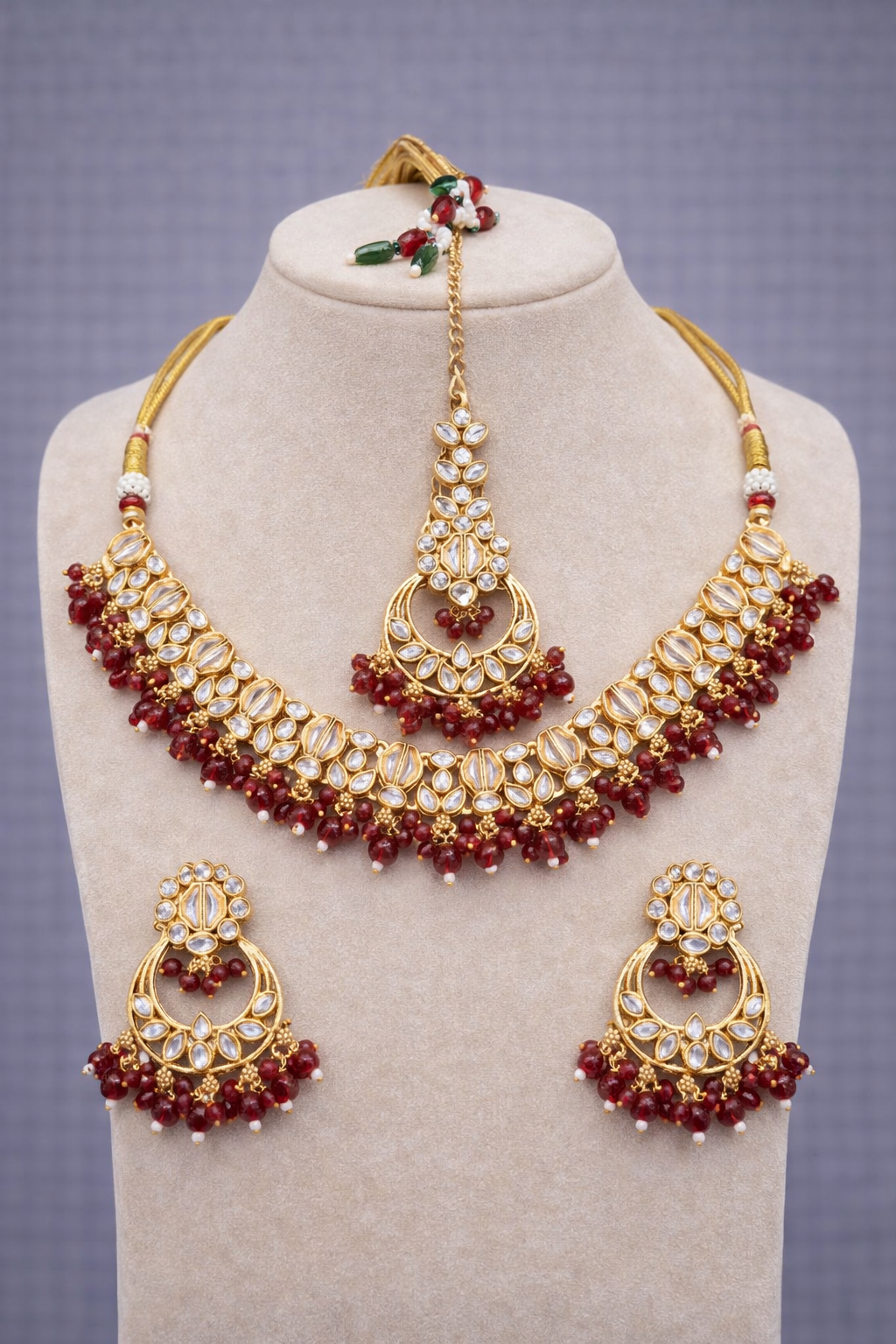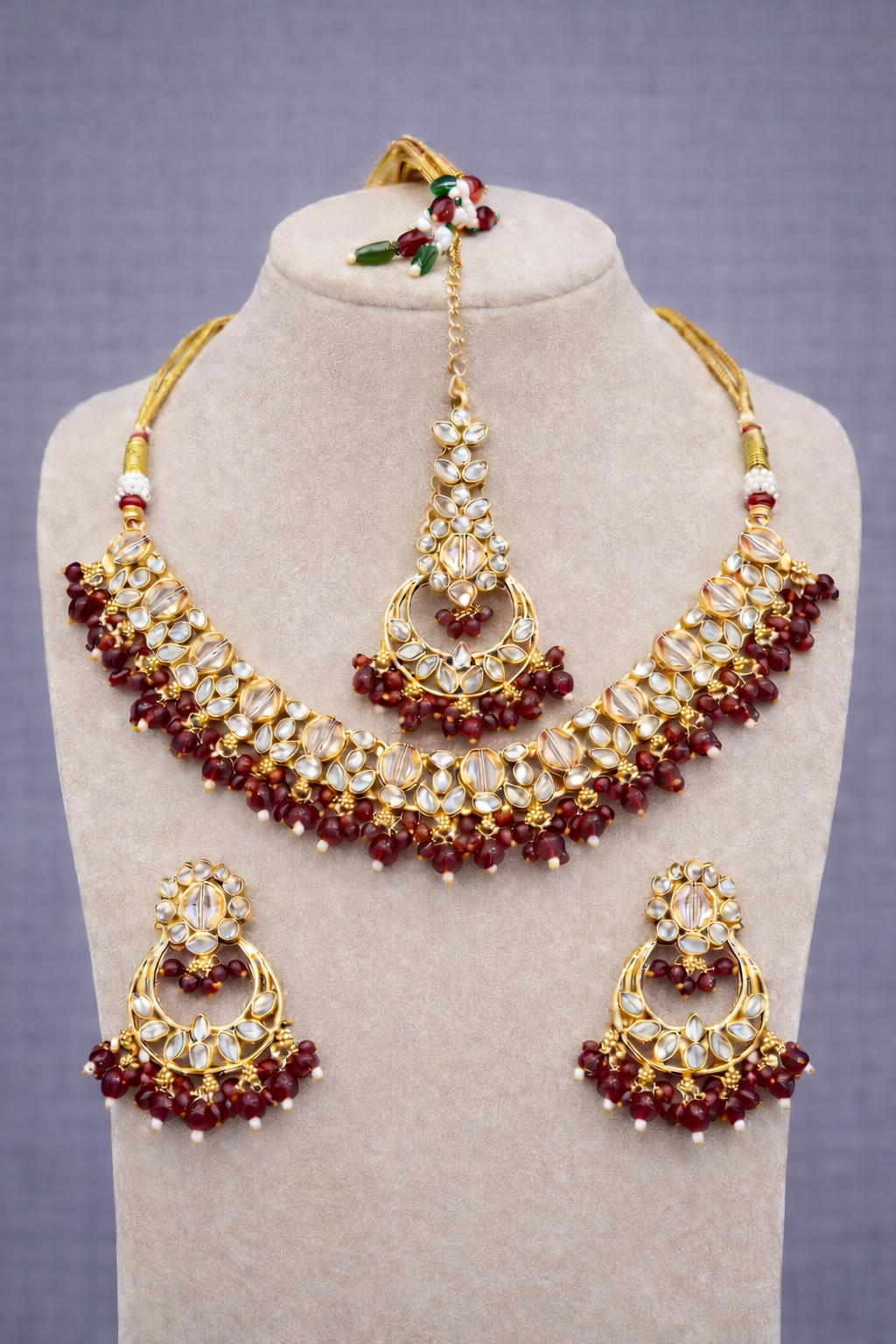 A stunning gold-tone kundan necklace set featuring rich wine-colored bead detailing, paired with matching earrings and maang tikka. Crafted with sparkling clear kundan stones and intricate traditional workmanship, the necklace is beautifully finished with elegant wine bead drops that add depth and luxury to the design. Perfect for weddings, receptions, and festive occasions, this set complements sarees, lehengas, and bridal ensembles, making it an ideal choice for a regal and graceful look.
