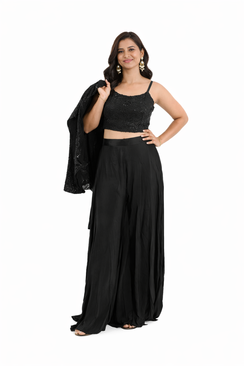 Ishika Choli Jacket Plazo Georgette Suit Readymade comfortable georgette fabric Beautifully enhanced with beads, Thread and tiki work Comes with optional long sleeves fabric.The Ishika Choli Jacket Plazo Suit is a fashionable traditional style suit crafted from Georgette fabric with intricate Tiki embroidery. The sharara fit ensures a perfect mix of comfort and style. Its beautiful design makes it suitable for any elegant occasion or formal event.
