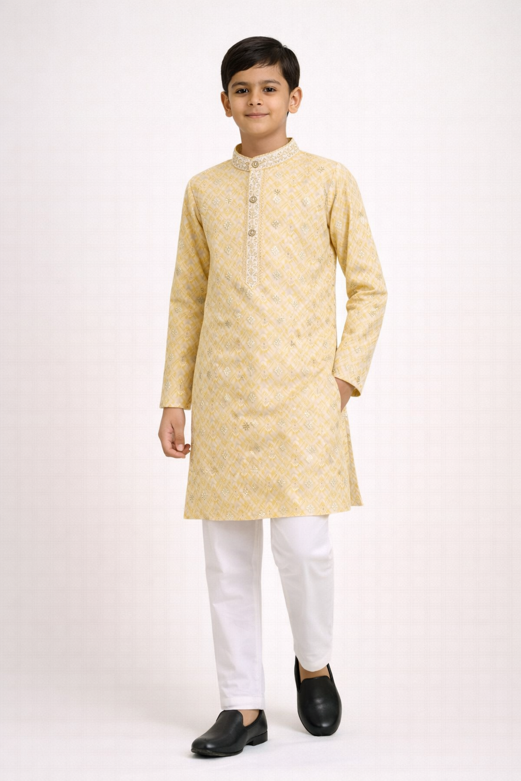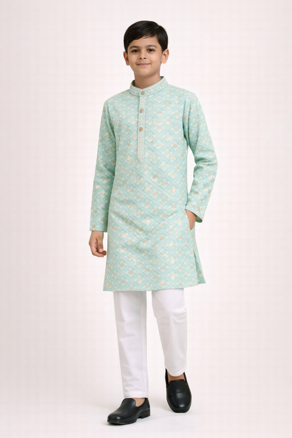 Bring fresh festive charm to your child’s ethnic wardrobe with this elegant kurta set. Designed in a soothing pastel tone, the kurta features delicate all-over traditional motifs with subtle gold accents, creating a graceful and refined look.Styled with a mandarin collar and detailed front placket, this kurta offers a classic ethnic silhouette while ensuring all-day comfort. Paired with crisp white pants and formal shoes, it is perfect for weddings, festivals, religious occasions, and family celebrations.