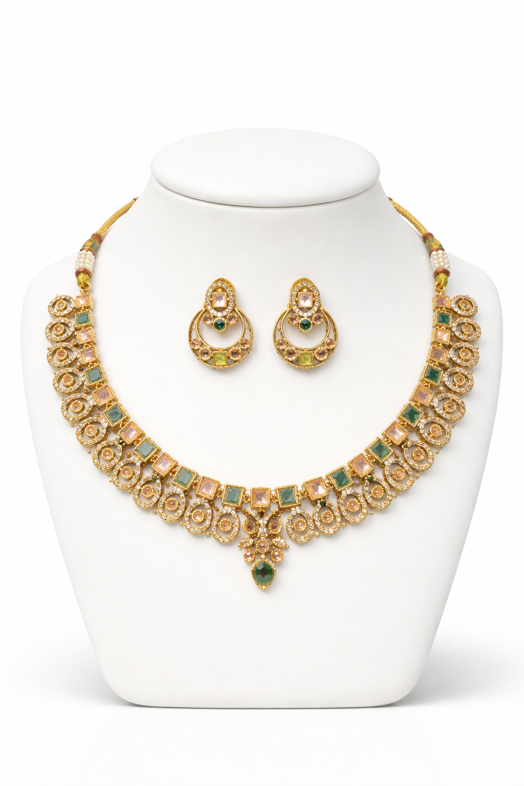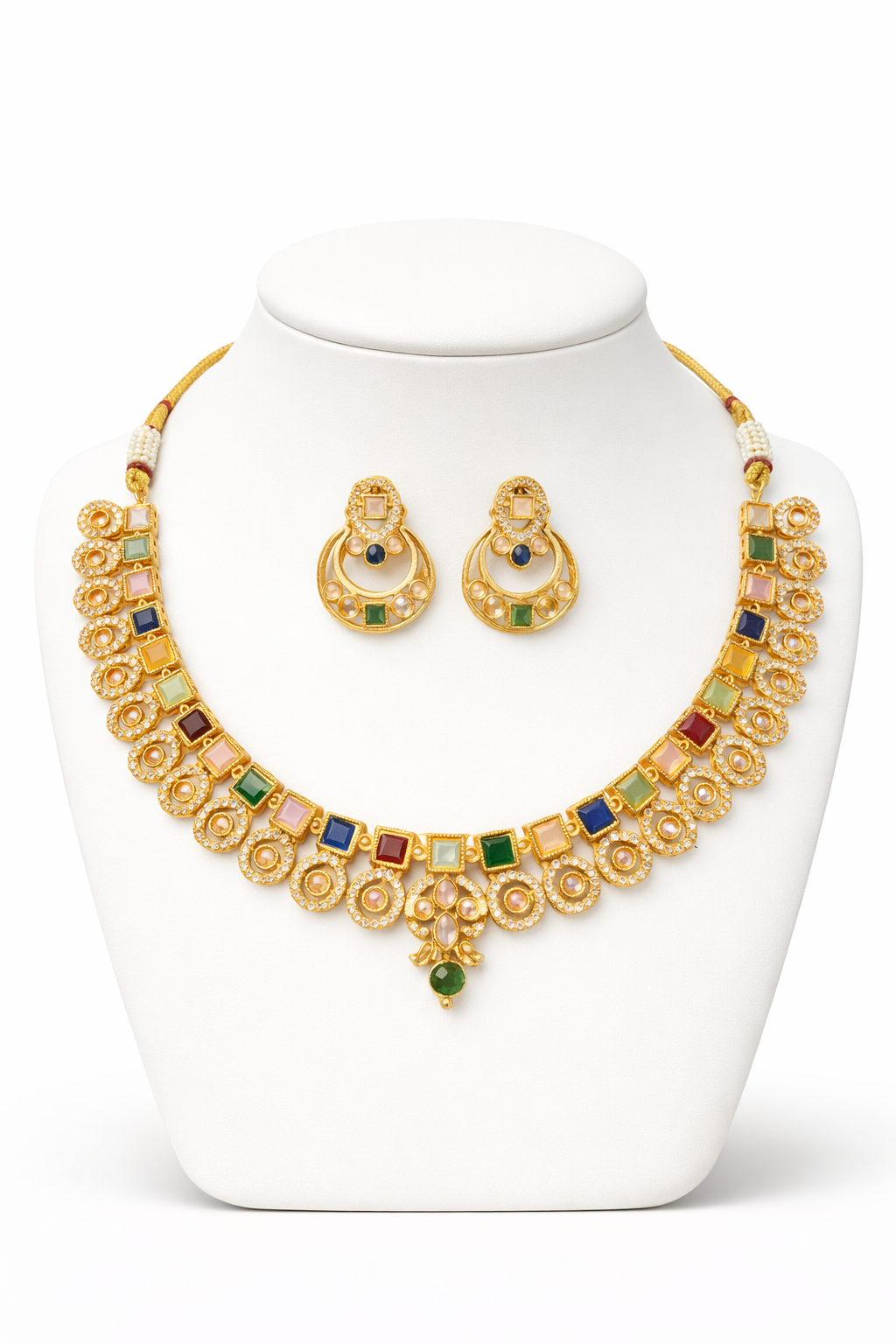 This exquisite necklace set features a beautifully crafted gold-tone design adorned with alternating pastel and jewel-toned square stones, complemented by delicate circular kundan detailing. The necklace is finished with a traditional adjustable dori for a perfect fit and paired with matching crescent-shaped earrings that echo the same intricate stonework. A graceful drop accent at the centre adds a refined festive touch, making this set ideal for weddings, celebrations, and traditional occasions.Set Includes: