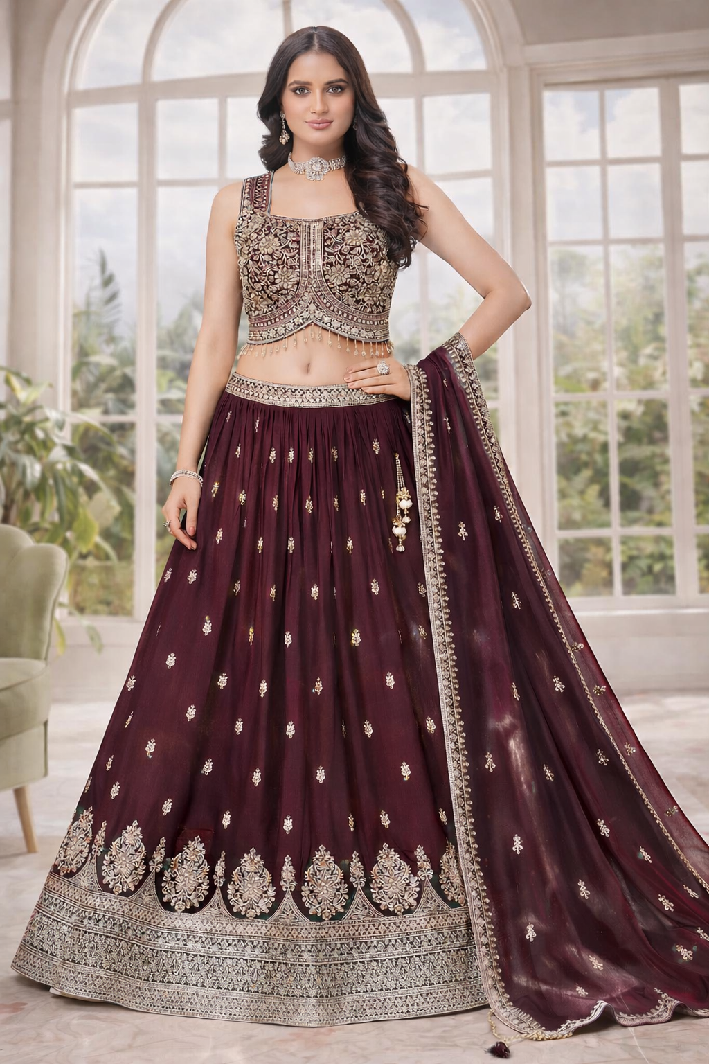 Elevate your festive wardrobe with this stunning lehenga suit, designed for timeless elegance and graceful charm. The deep hue combined with intricate embroidery creates a sophisticated look that is perfect for grand celebrations.The beautifully crafted sleeveless blouse features detailed silver and gold embroidery, adding richness and structure to the outfit. The flowing lehenga is adorned with delicate motifs throughout and finished with a heavily embroidered hemline, enhancing its luxurious appeal. A matching dupatta with fine embroidered edging completes the ensemble flawlessly.Ideal for weddings, receptions, festive occasions, and evening celebrations, this lehenga suit offers a perfect blend of tradition and modern style Embroidered sleeveless blouseFlared lehenga skirt with detailed borderMatching dupatta with elegant edging