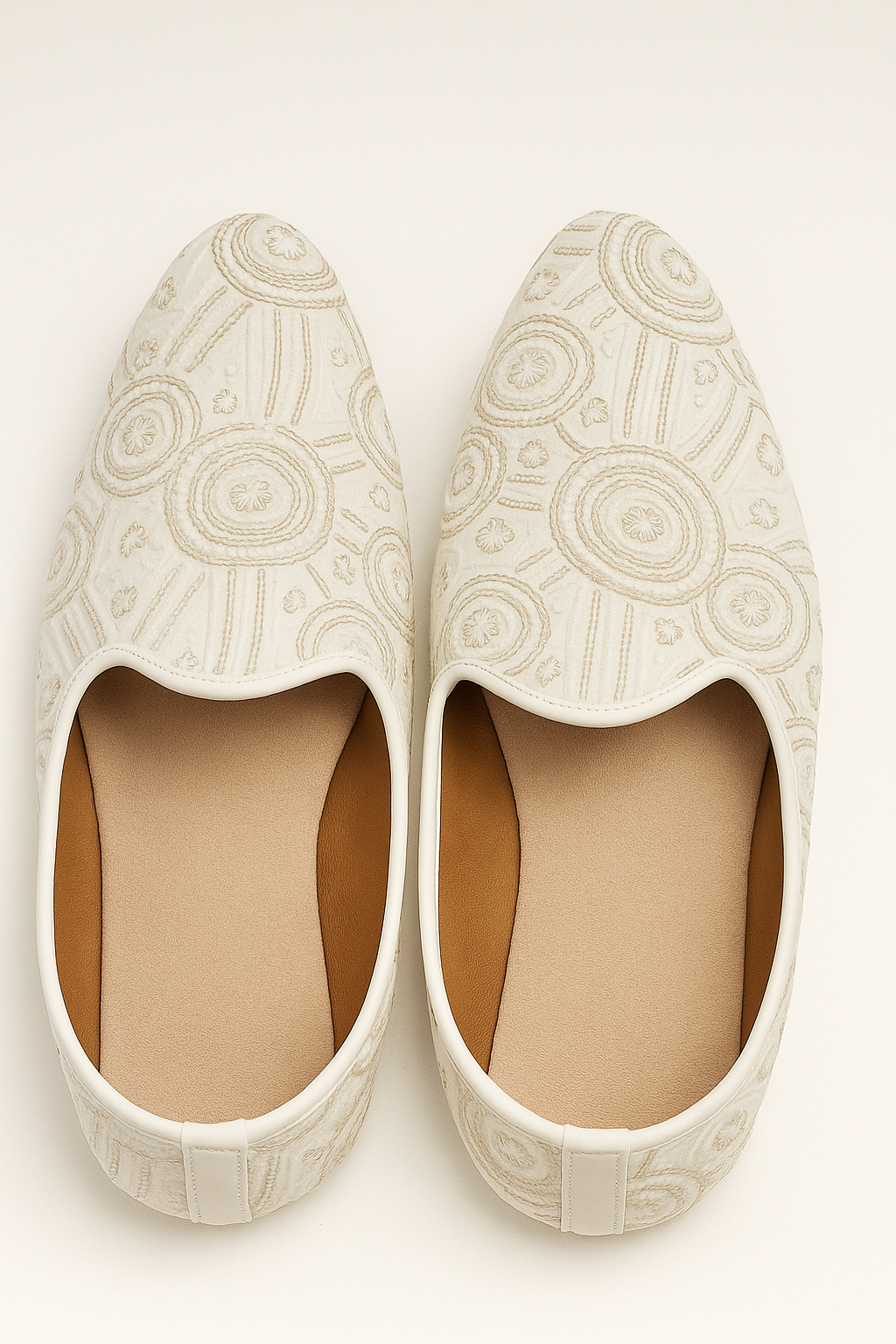 Elevate your traditional style with this exquisitely handcrafted ivory mojdi, designed with intricate circular embroidery that offers a rich and artistic look. The detailed threadwork forms a beautiful pattern across the upper, giving the pair a premium finish perfect for any festive or formal occasion.