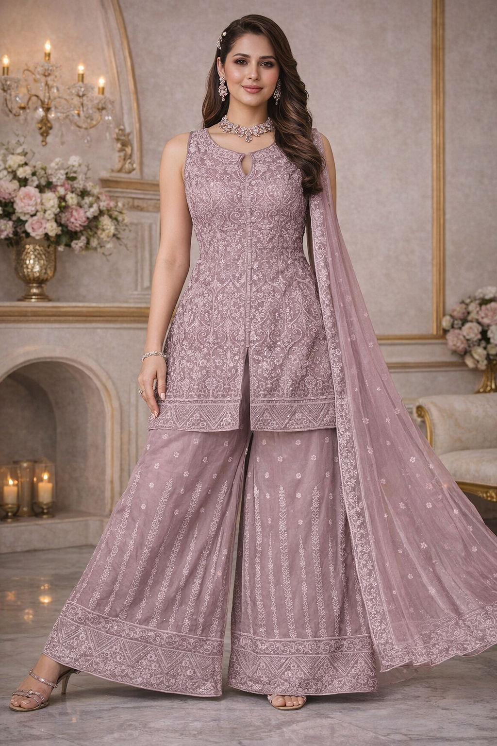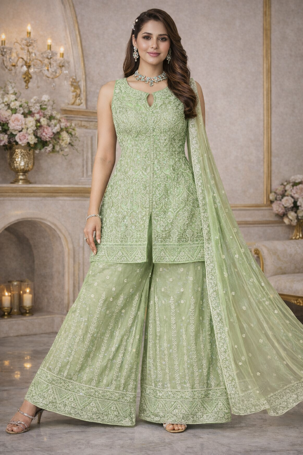 Refresh your festive wardrobe with this graceful flare palazzo suit, designed for effortless elegance and comfort. The soothing pastel tone combined with delicate embroidery makes this ensemble a perfect choice for daytime celebrations and special occasions.The sleeveless embroidered kurti features intricate all-over motifs with fine detailing, giving it a refined and feminine look. Paired with flowy flare palazzo pants adorned with matching embroidery, the outfit offers beautiful movement and comfort. The soft, lightweight dupatta with subtle detailing completes the look with understated charm.Ideal for festive gatherings, weddings, parties, and elegant daytime events, this palazzo suit blends modern styling with traditional craftsmanship.