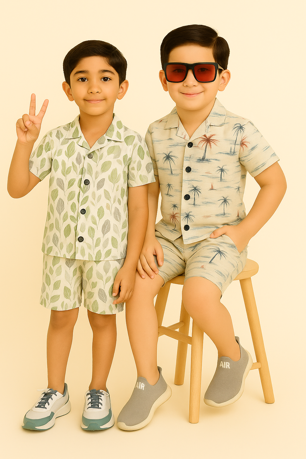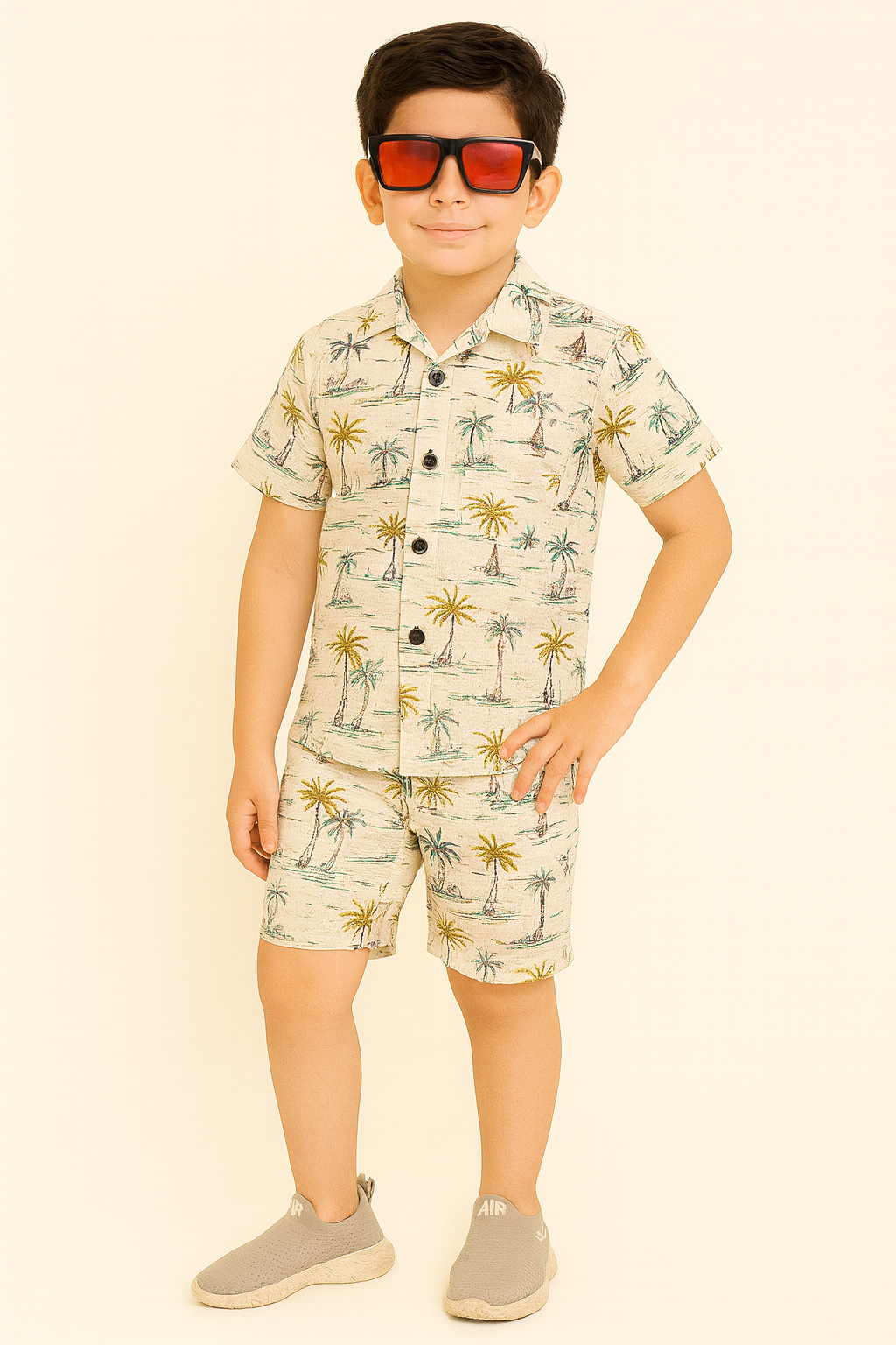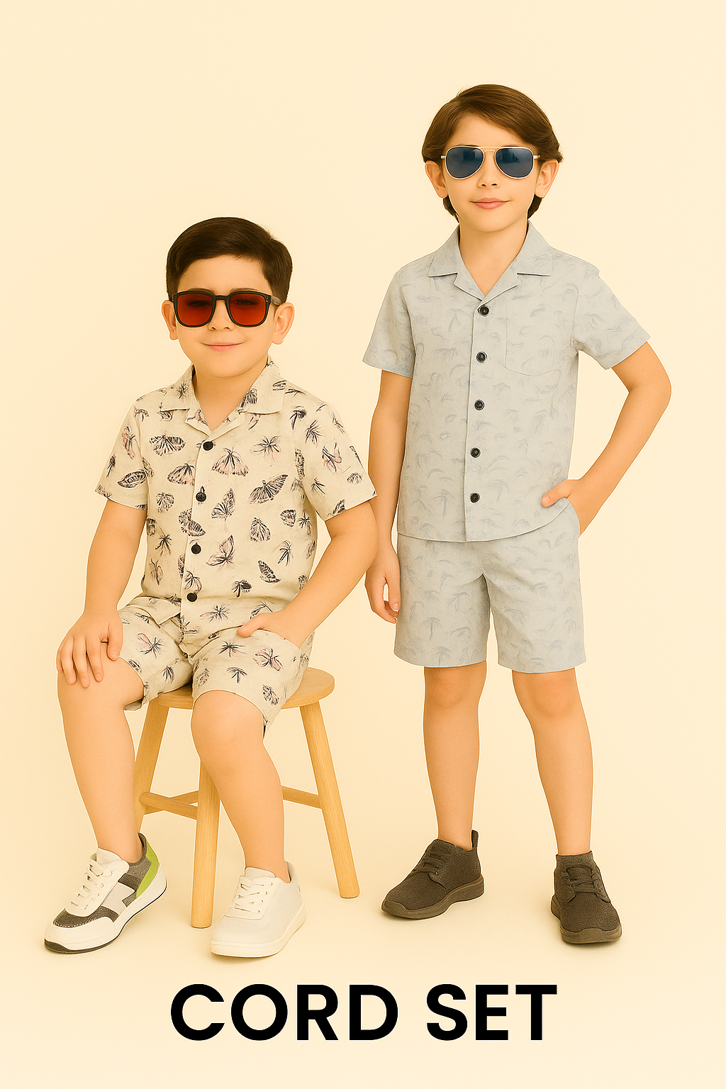A stylish and comfortable boys’ cord set perfect for everyday wear and outdoor fun. This coordinated outfit includes a button-down shirt and matching shorts, featuring tropical leaf and palm tree prints that give a fresh holiday vibe. Made with soft, lightweight, and breathable fabric, it keeps kids cool and active all day long. Ideal for summer outings, birthday parties, vacations, or casual family events.