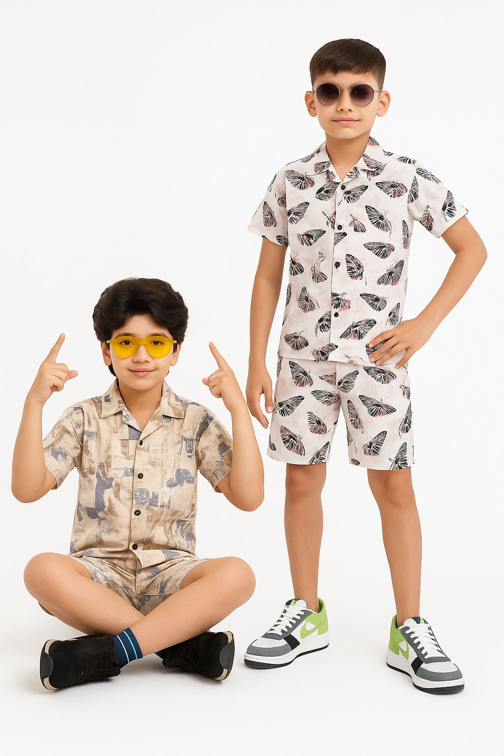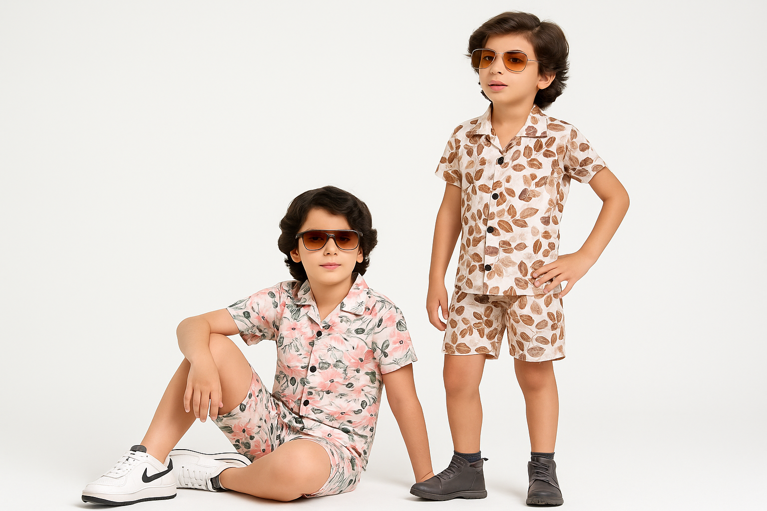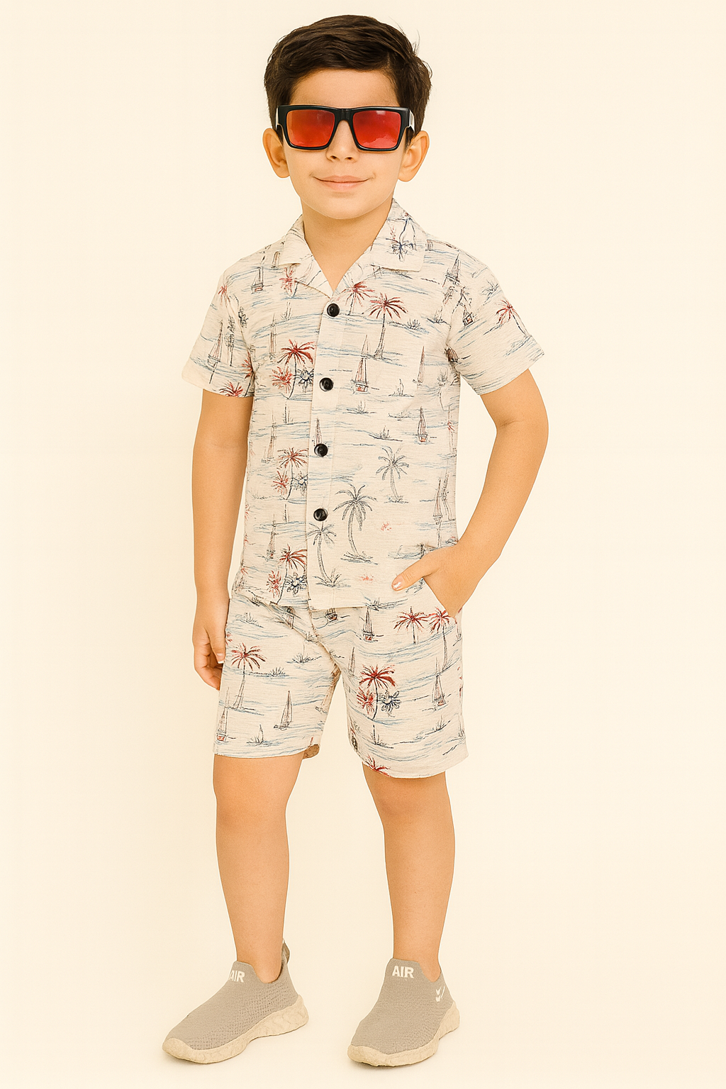A stylish and comfortable boys’ cord set perfect for everyday wear and outdoor fun. This coordinated outfit includes a button-down shirt and matching shorts, featuring tropical leaf and palm tree prints that give a fresh holiday vibe. Made with soft, lightweight, and breathable fabric, it keeps kids cool and active all day long. Ideal for summer outings, birthday parties, vacations, or casual family events.