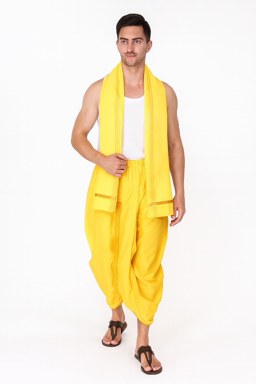 Step into timeless elegance with this Men’s Traditional Red Dhoti Set, designed for a classic yet sophisticated ethnic look. Crafted from premium silk-blend fabric, the outfit features a rich red dhoti with a gold zari border, paired with a matching short-sleeve top for comfort and modern styling. Completing the ensemble is a coordinated dupatta edged with golden trim, adding a regal touch to your festive or ceremonial attire.Perfect for weddings, cultural functions, temple visits, or festive celebrations, this dhoti set offers a perfect blend of tradition and refinement.Color: Deep Red with Gold BorderFabric: Silk-blend for a soft, lustrous finishIncludes: Dhoti, Top, and DupattaOccasion: Traditional ceremonies, festivals, and weddingsFit: Comfortable drape with elegant stylingStyle Tip:Pair with ethnic sandals or mojris and gold accessories for a complete festive look.