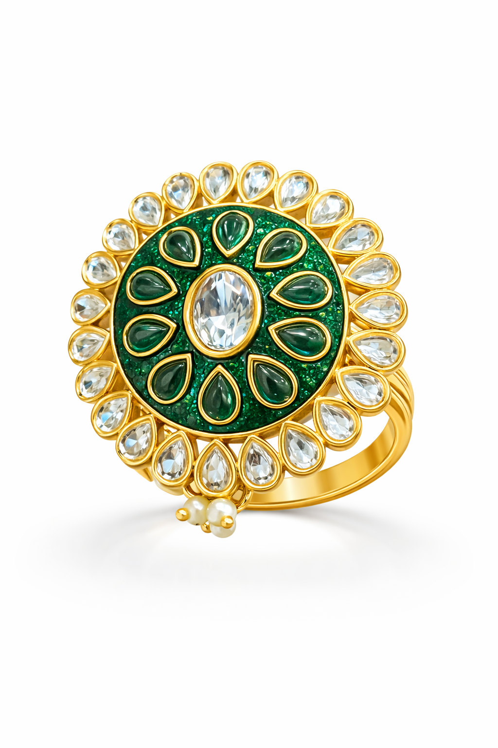 Add a touch of regal elegance to your look with this stunning red kundan statement finger ring. Crafted in a luxurious gold-tone finish, the ring features a beautifully detailed circular floral design. A sparkling clear centre stone is surrounded by rich ruby-red teardrop stones, set against a textured red enamel base and finished with a halo of clear kundan stones for extra brilliance. A delicate pearl drop adds a traditional charm to the design.Perfect for weddings, festive occasions, parties, and traditional celebrations, this adjustable ring pairs effortlessly with sarees, lehengas, and ethnic ensembles, making it a standout accessory.