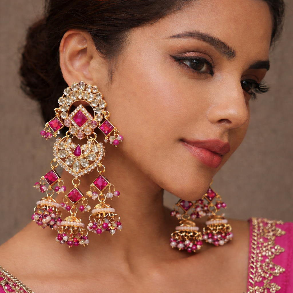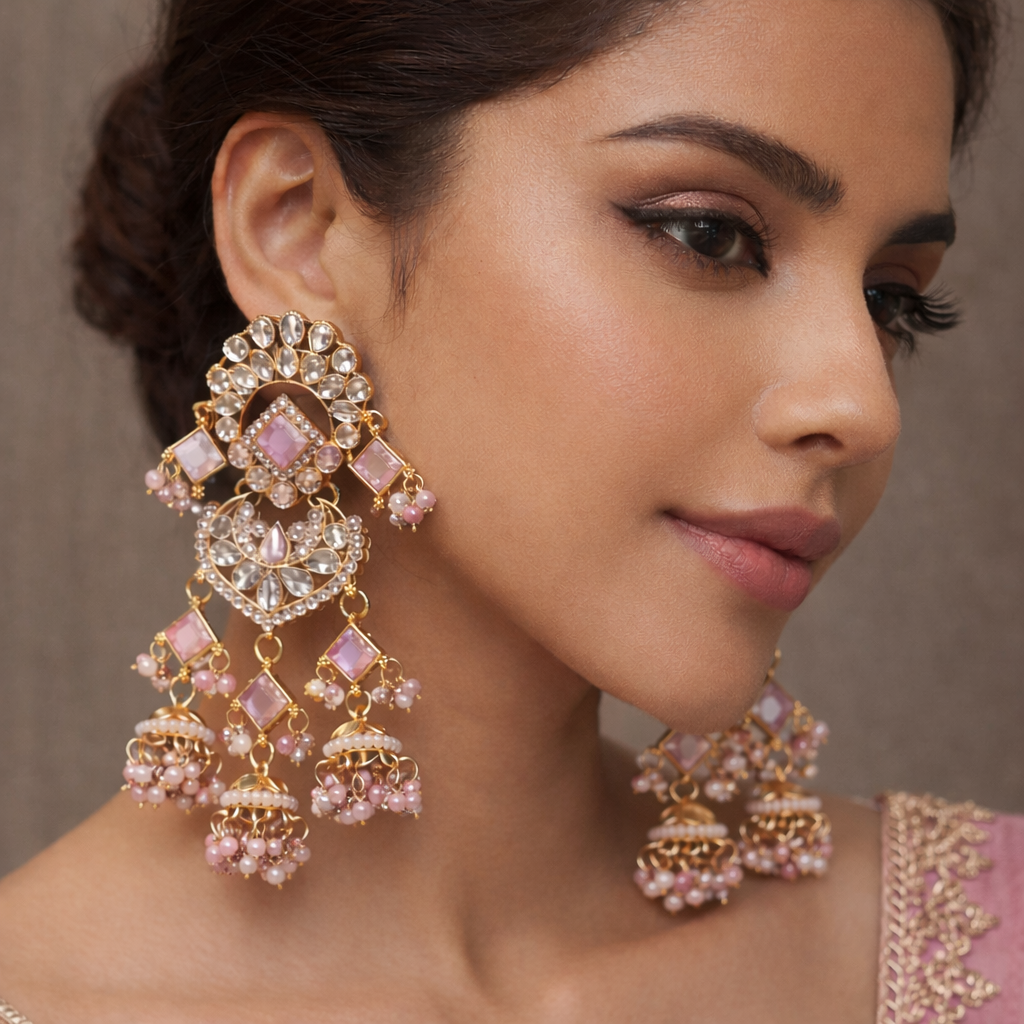 The intricate geometric motifs are enhanced with fine kundan-style detailing, creating a regal look perfect for weddings, festive occasions, and special celebrations. The cascading jhumka drops add graceful movement, bringing a soft, feminine charm to every turn.