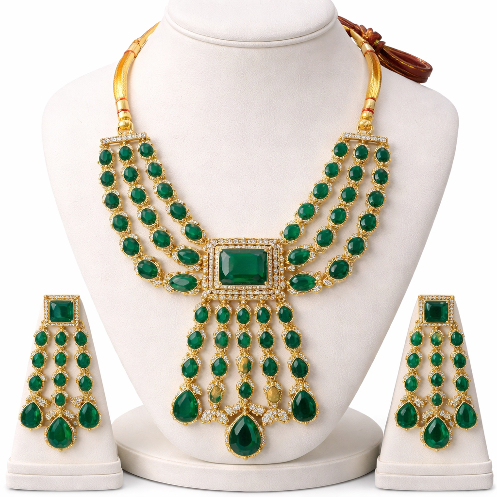 Elevate your look with this exquisite emerald green necklace set, designed to make a bold yet elegant statement. Crafted in a rich gold-tone finish, the necklace features multiple layers of oval-cut green stones, beautifully complemented by sparkling crystal accents. The centerpiece showcases a striking rectangular stone, enhanced with intricate detailing and cascading drop elements for a regal finish.Paired with matching chandelier earrings, this set offers a perfect balance of tradition and luxury—ideal for weddings, festive occasions, and grand celebrations.• Premium gold-tone finish• Rich emerald green stones with crystal embellishments• Statement multi-layered necklace design• Matching long earrings included• Adjustable dori for perfect fit