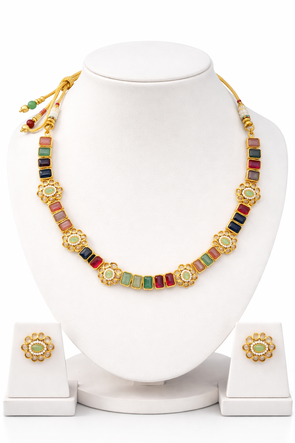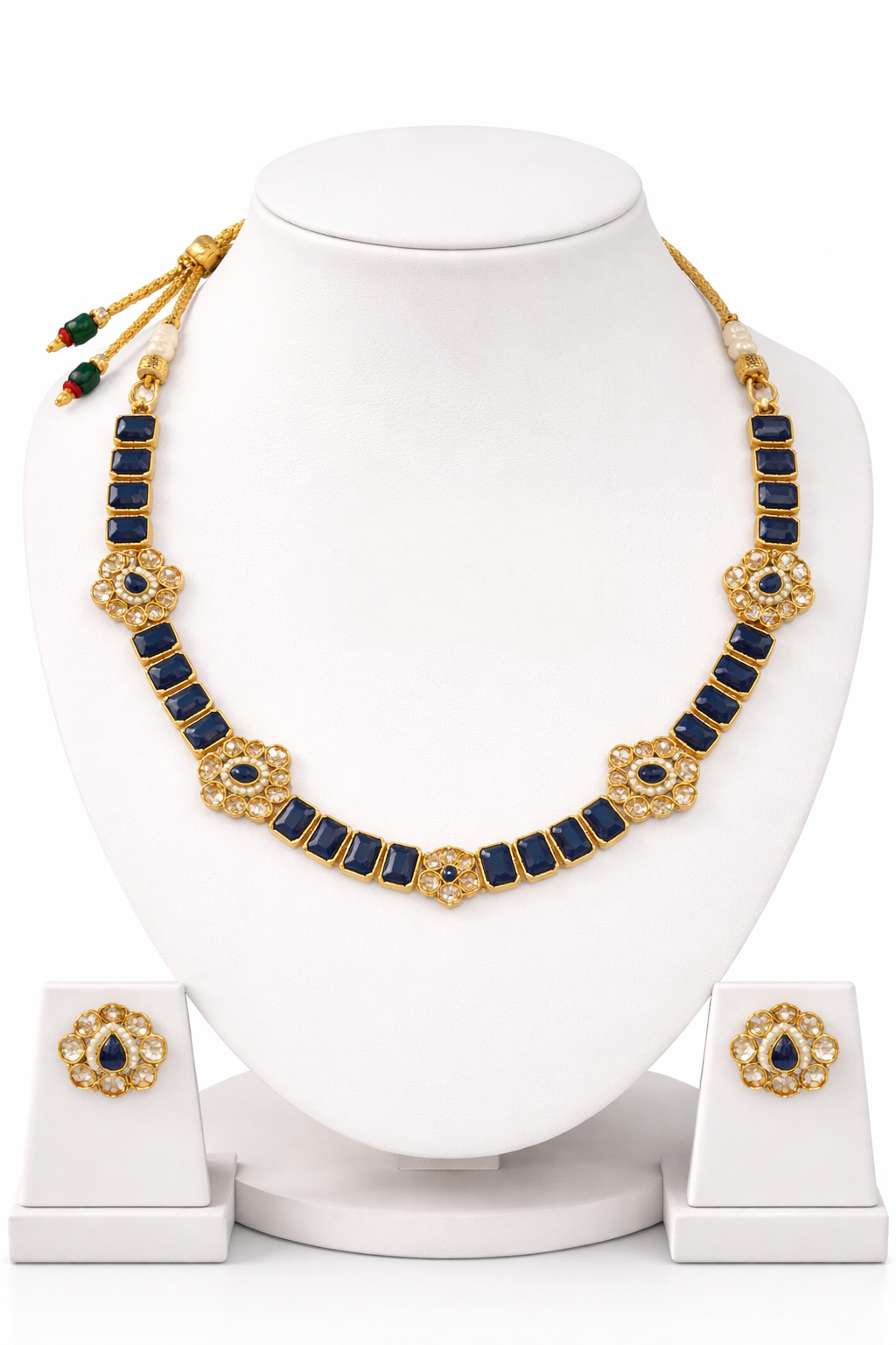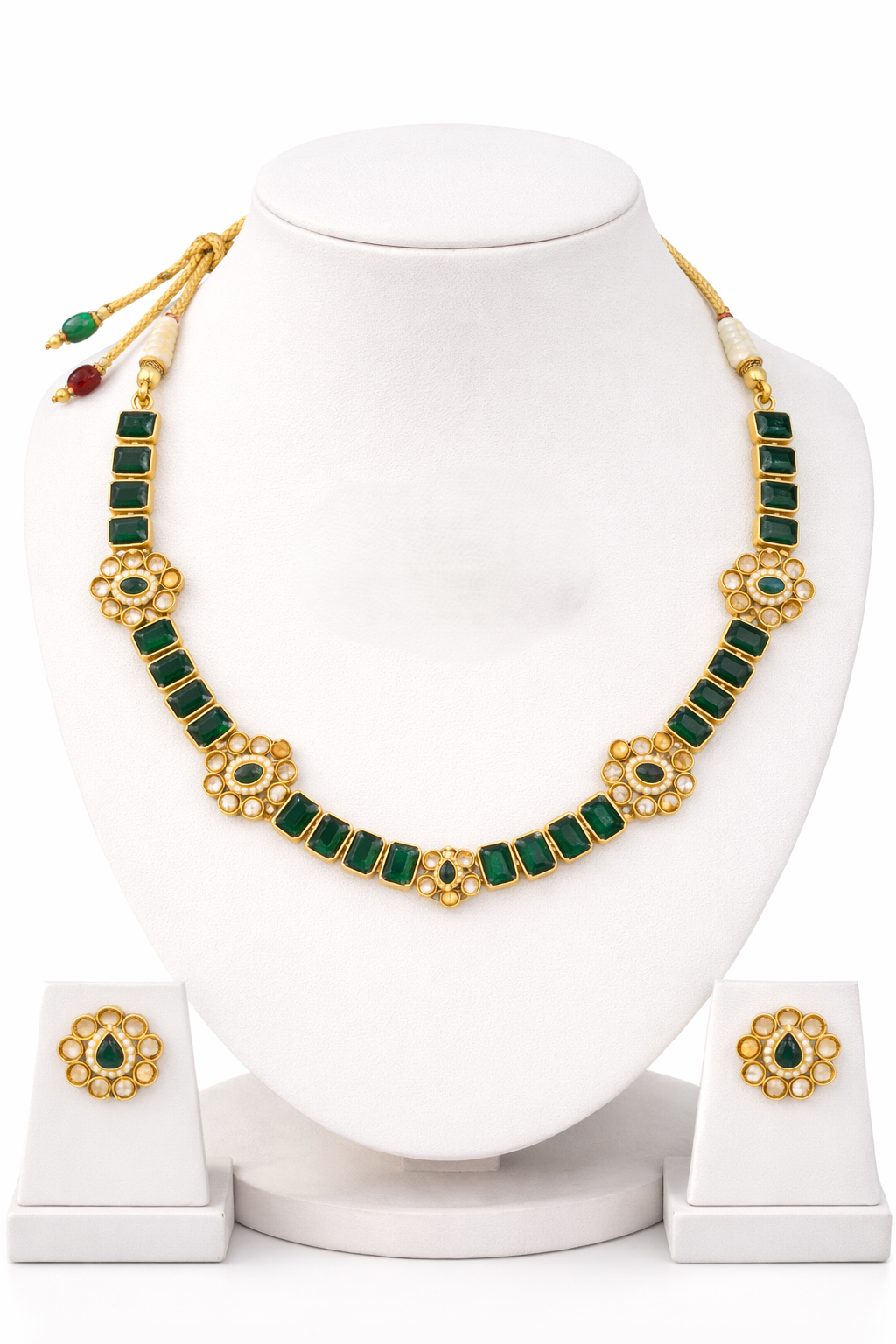 Paired with matching stud earrings, this set completes a timeless look that works effortlessly with sarees, lehengas, and kameez outfits.• Premium gold-tone traditional necklace set• Deep emerald green rectangular stones• Intricate floral detailing with fine stonework• Adjustable dori (thread) closure for perfect fit• Matching statement stud earrings included• Lightweight and comfortable for extended wear