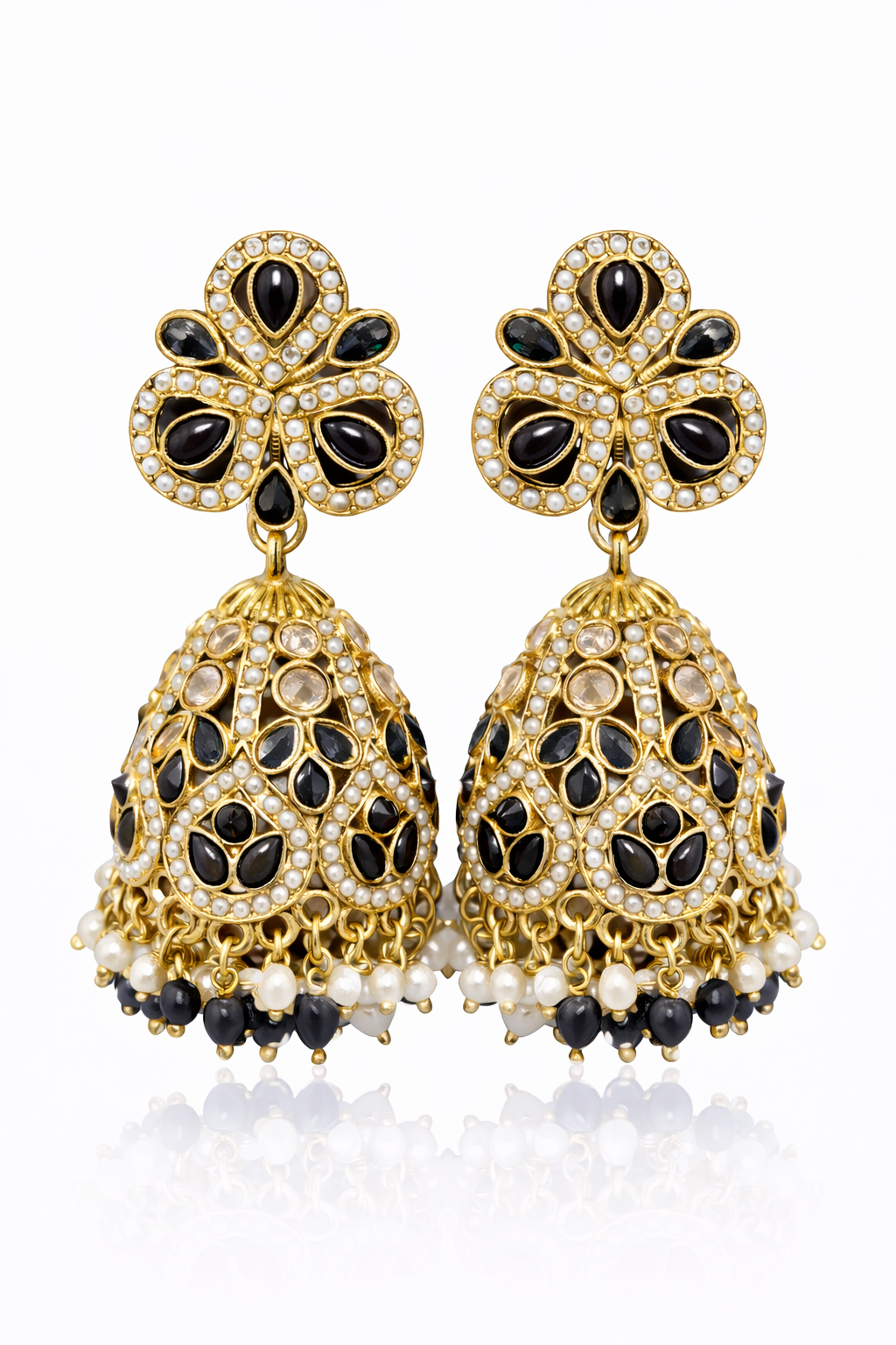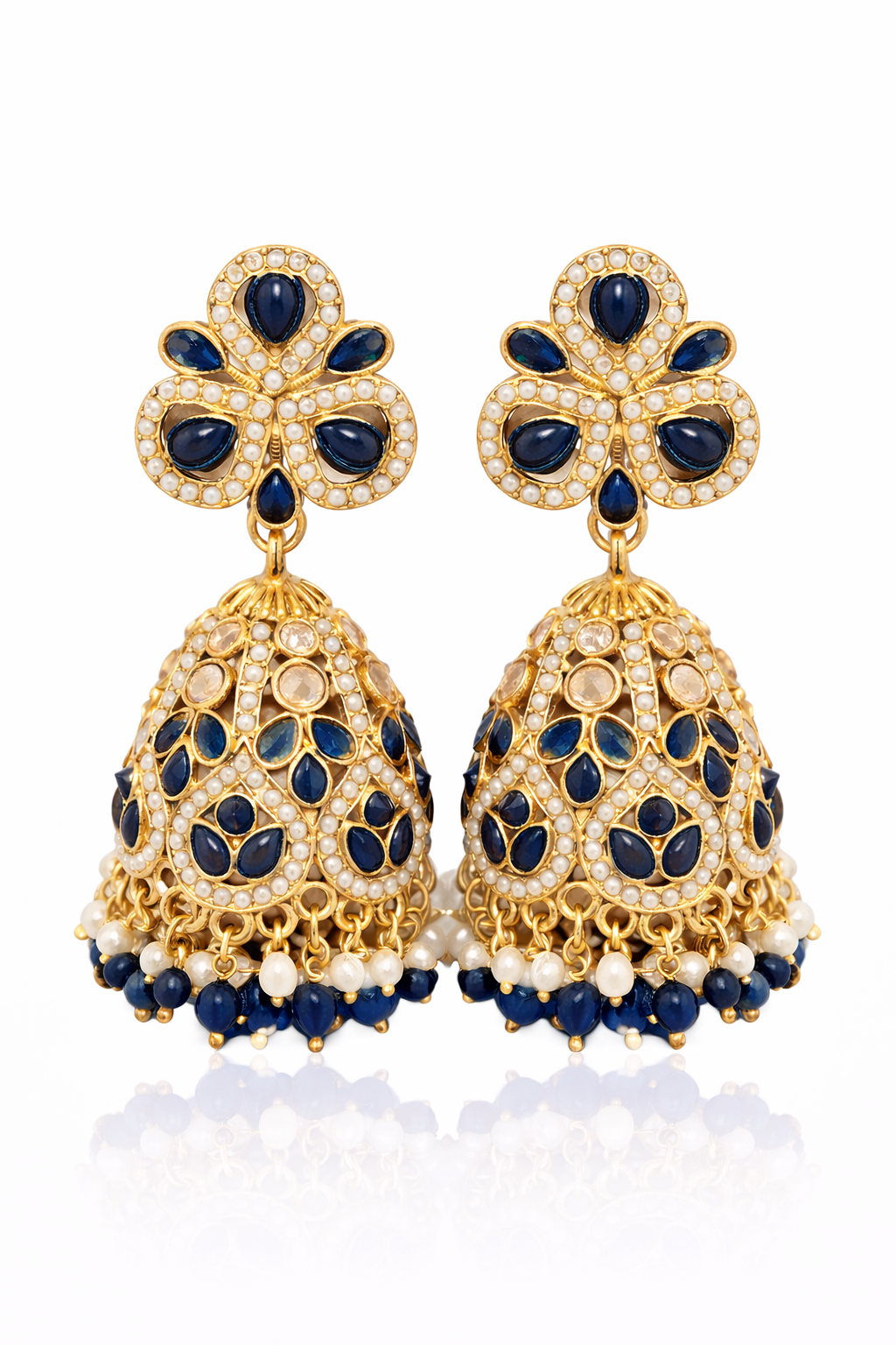 Kundan Pearl Jhumka EarringsAdd a touch of royal elegance to your ethnic jewellery collection with these stunning kundan jhumka earrings in a rich midnight blue tone. The earrings feature a beautifully crafted clover-inspired stud, embellished with teardrop-shaped midnight blue stones and fine pearl detailing. The intricately designed jhumka dome is adorned with matching kundan stones and bordered with delicate pearls, finished with a graceful pearl fringe that adds movement and charm.