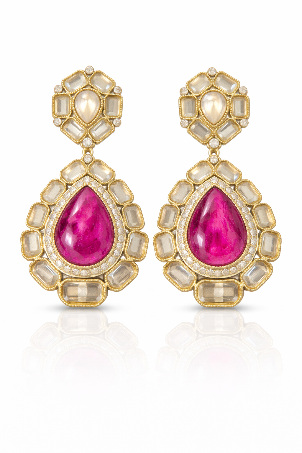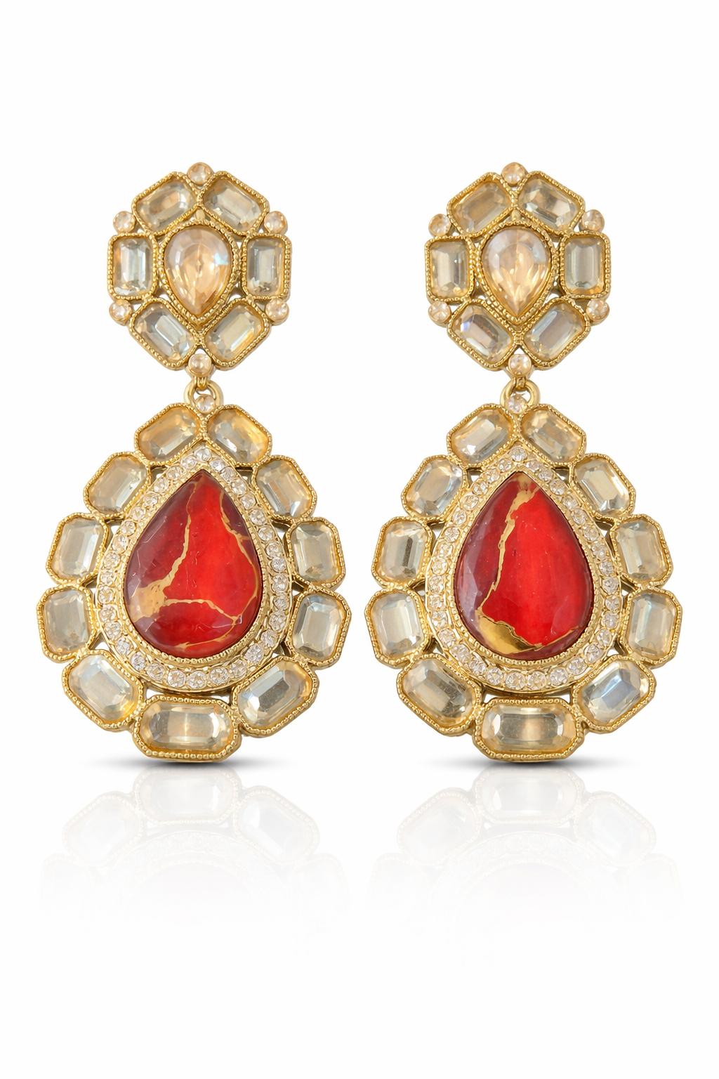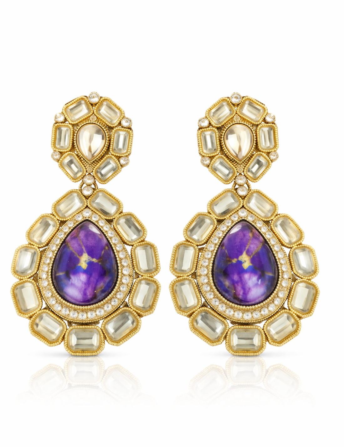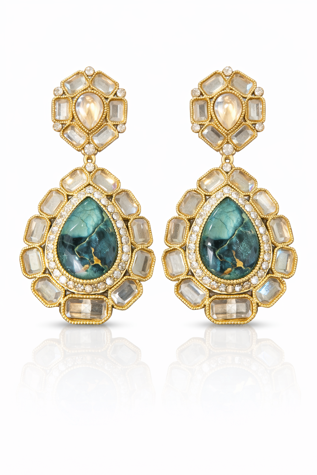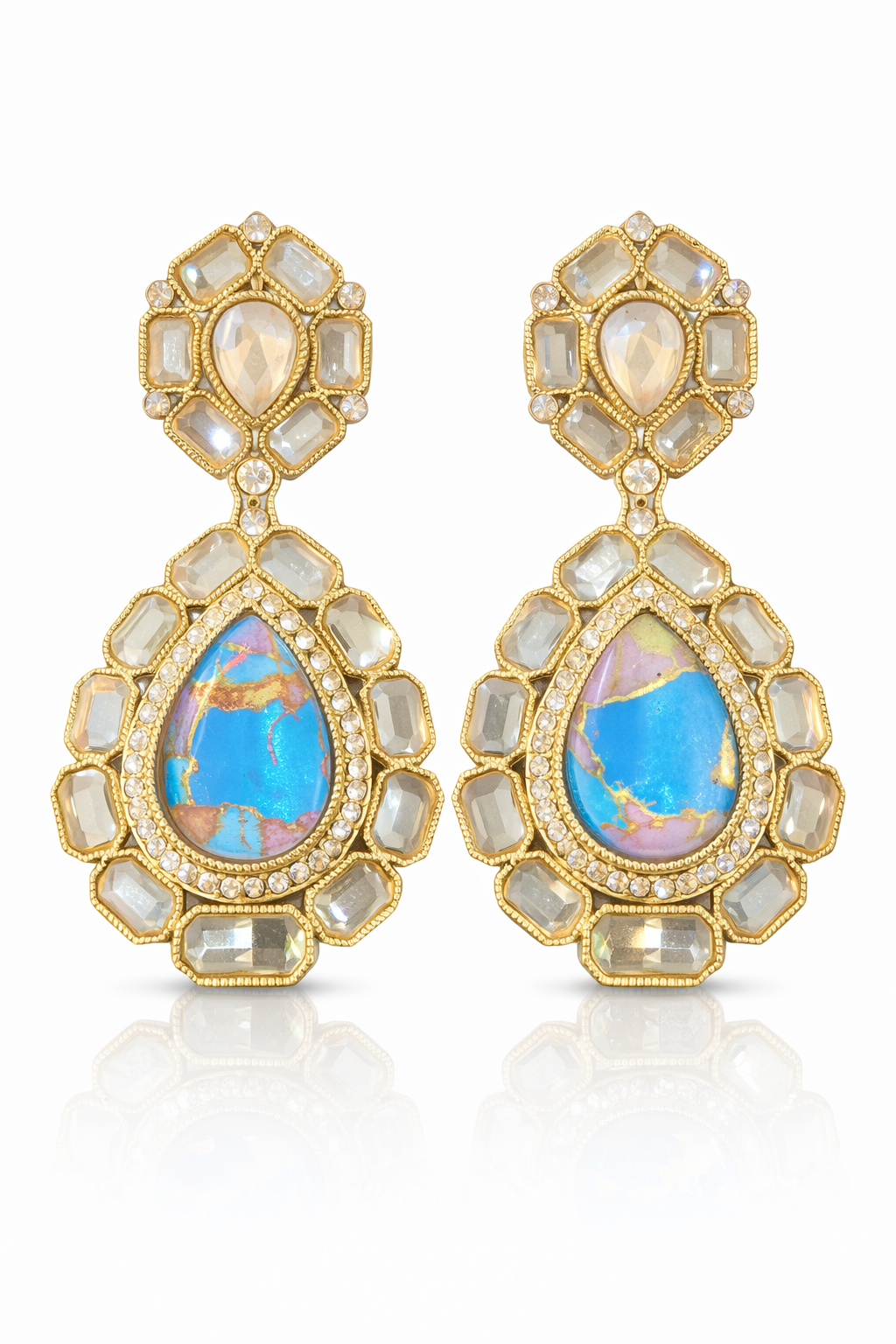 Add a touch of artistic elegance to your look with these stunning gold-tone statement earrings. Designed with a rich blend of modern luxury and traditional detailing, this pair features a beautifully layered structure that exudes sophistication.The highlight of the design is the striking teardrop-shaped center stone in vibrant turquoise blue with natural gold veining, creating a unique marble effect. Surrounding it is a halo of finely cut crystal stones and rectangular accents that enhance the brilliance and depth of the piece. The upper stud showcases a cluster of faceted stones, completing the look with a refined finish.• Premium gold-tone finish• Unique turquoise-blue marbled center stone• Surrounded by high-quality crystal detailing• Intricate multi-layered design• Lightweight and comfortable for extended wear