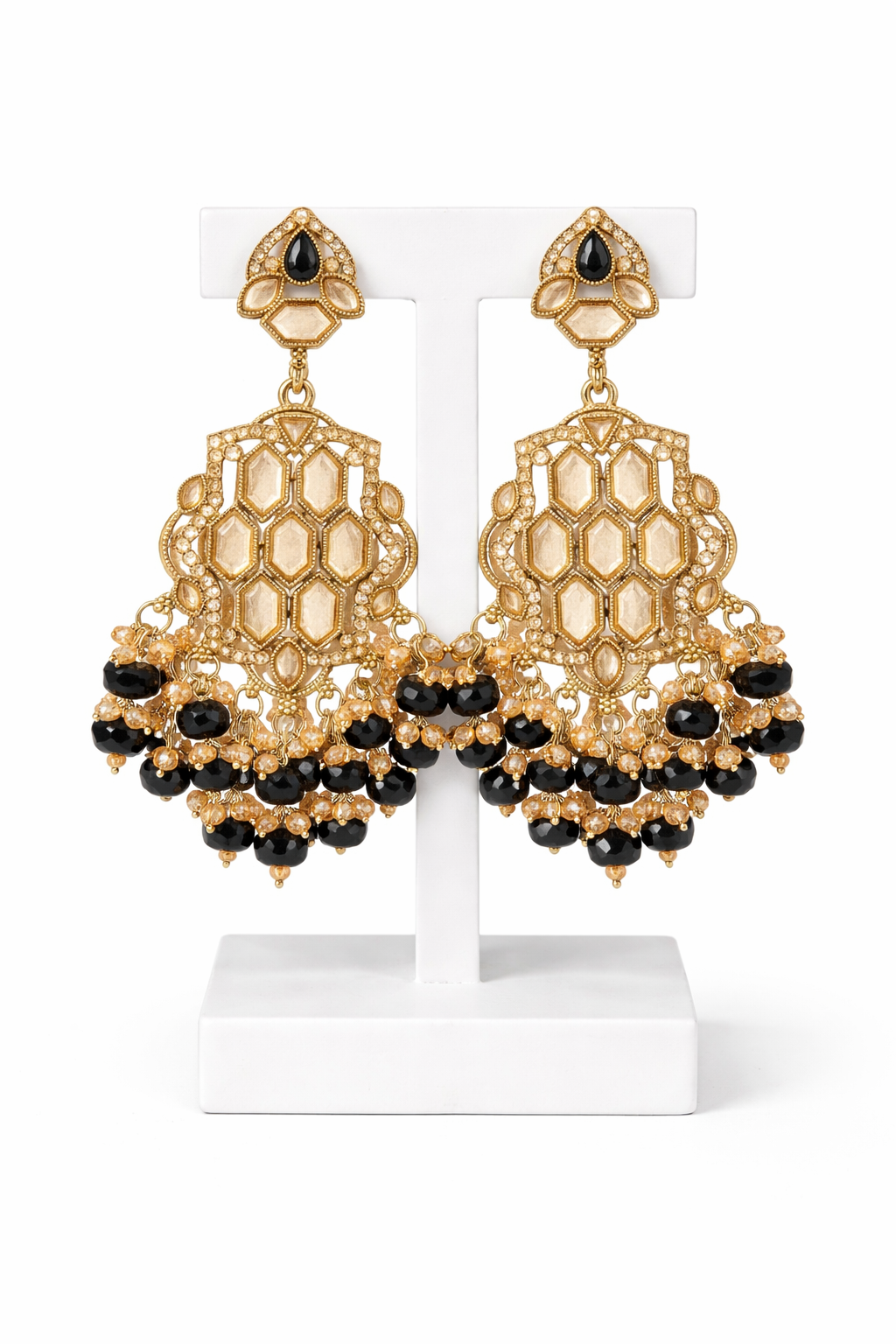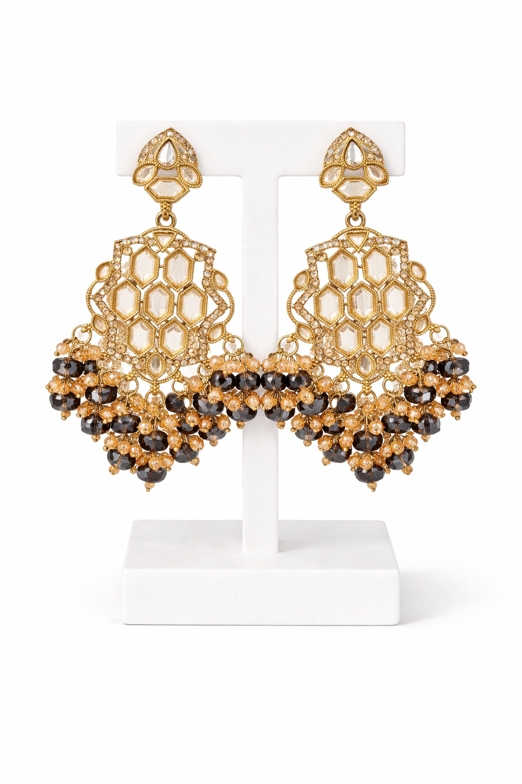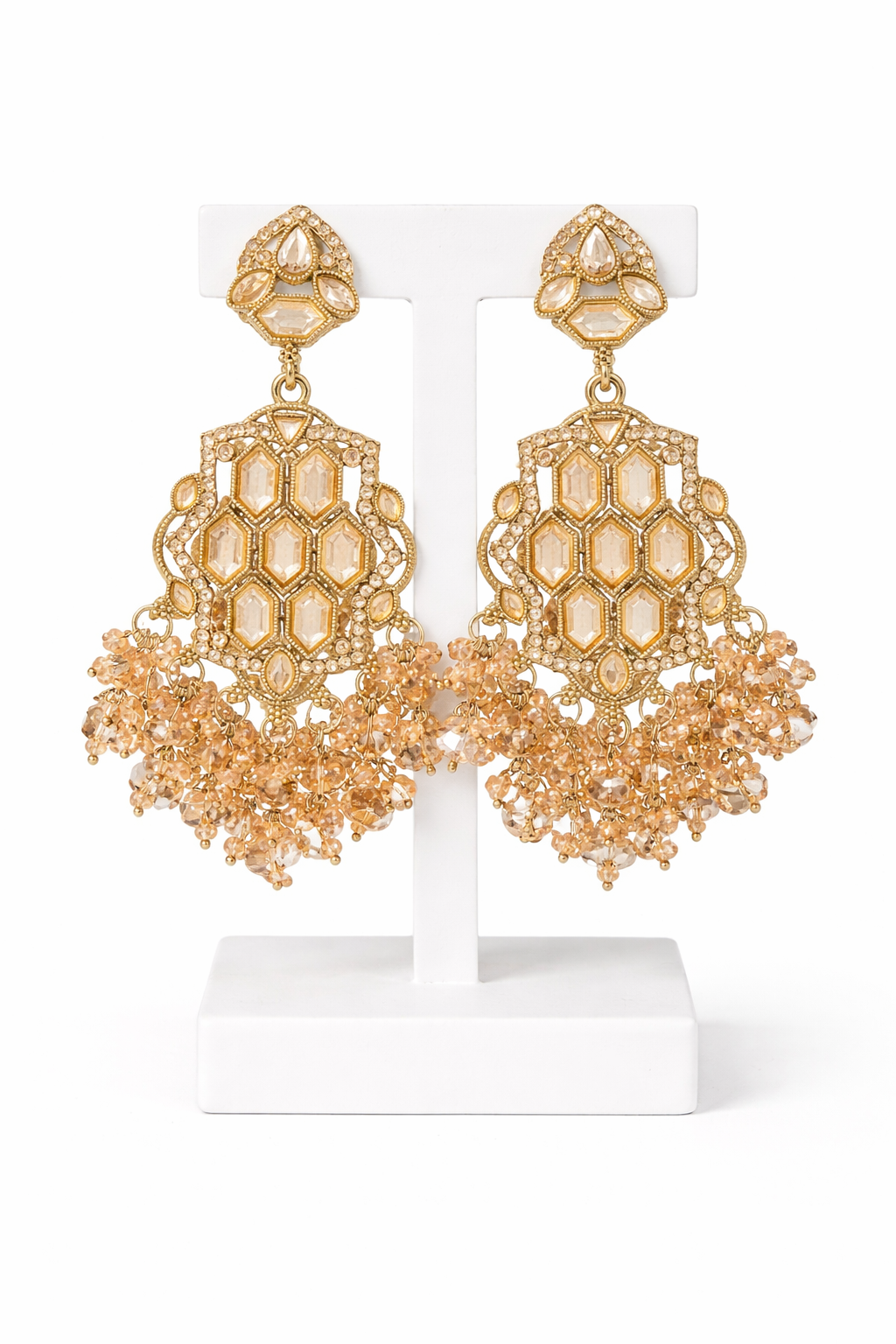 Elevate your festive look with these stunning statement chandelier earrings, crafted in an elegant antique gold finish. Designed with a delicate honeycomb-inspired lattice, these earrings feature finely set champagne-toned stones that create a rich, luminous base.The design is beautifully enhanced with intricate crystal detailing and finished with cascading clusters of deep green and champagne beads, adding graceful movement and sparkle with every step.Perfect for weddings, festive occasions, and evening wear, these earrings bring together traditional charm and contemporary elegance—making them a standout addition to any jewellery collection.