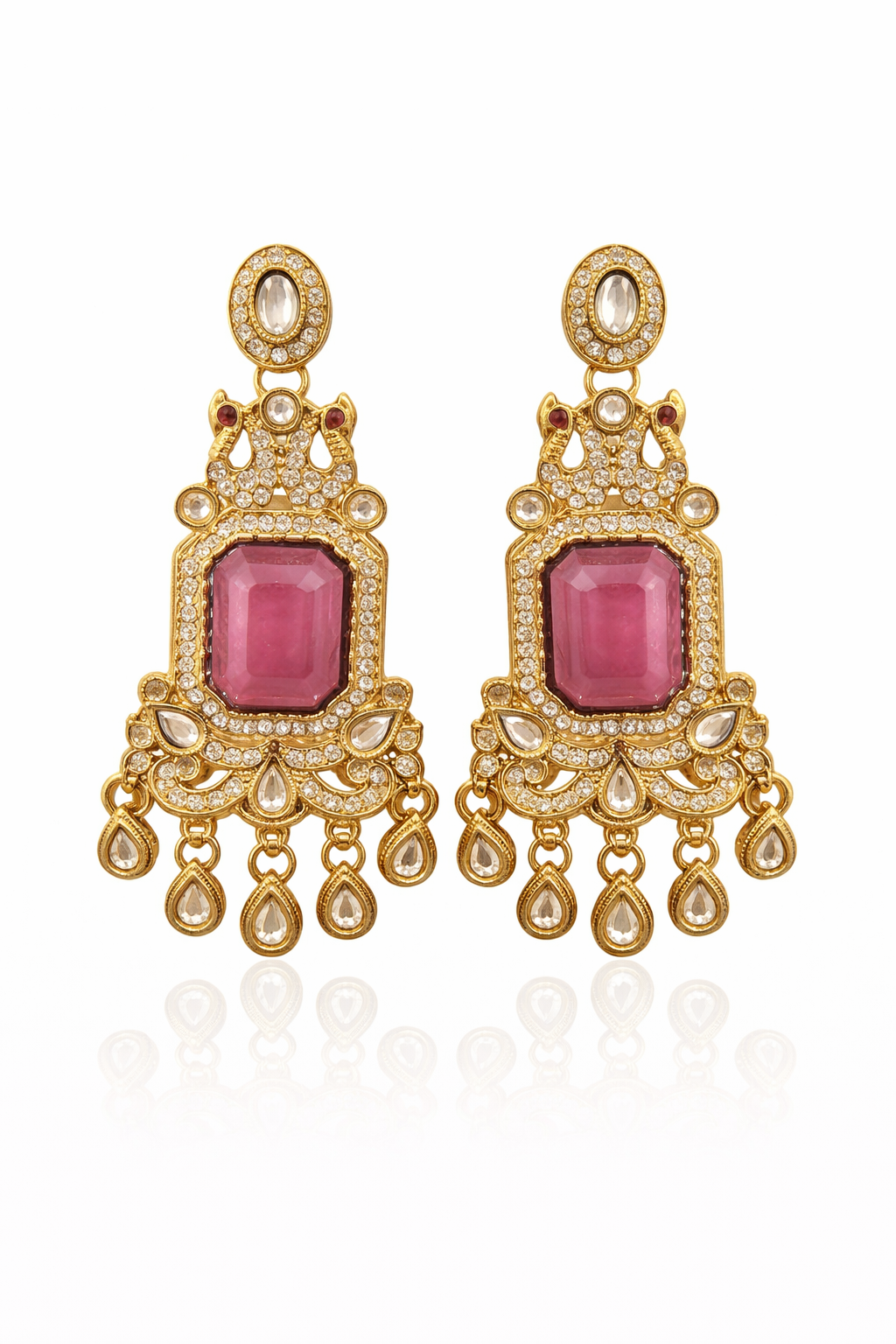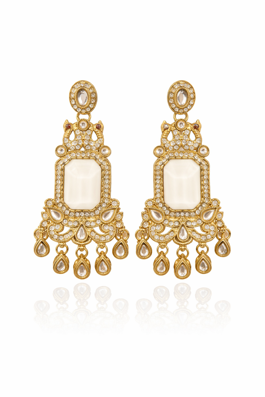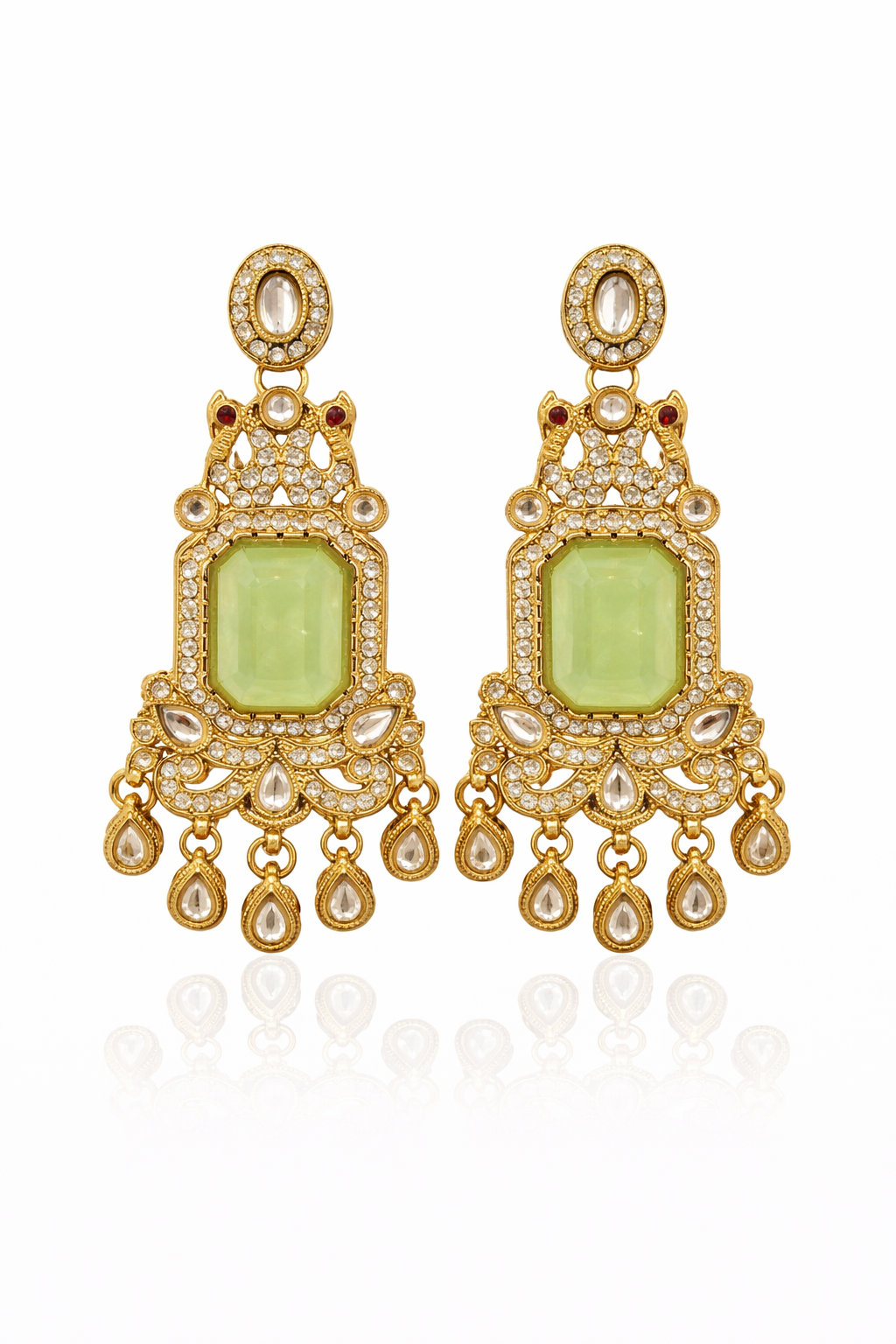 Featuring a soft pista green rectangular stone at the center, each earring is beautifully framed with shimmering kundan-style crystals set in a rich gold-tone base. The top stud is delicately embellished, flowing into an ornate structure with fine detailing and traditional motifs. The lower section is finished with elegant teardrop hangings that add graceful movement and a luxurious touch.Perfect for weddings, festive occasions, and special celebrations, these earrings bring a refined charm to both traditional and fusion outfits.