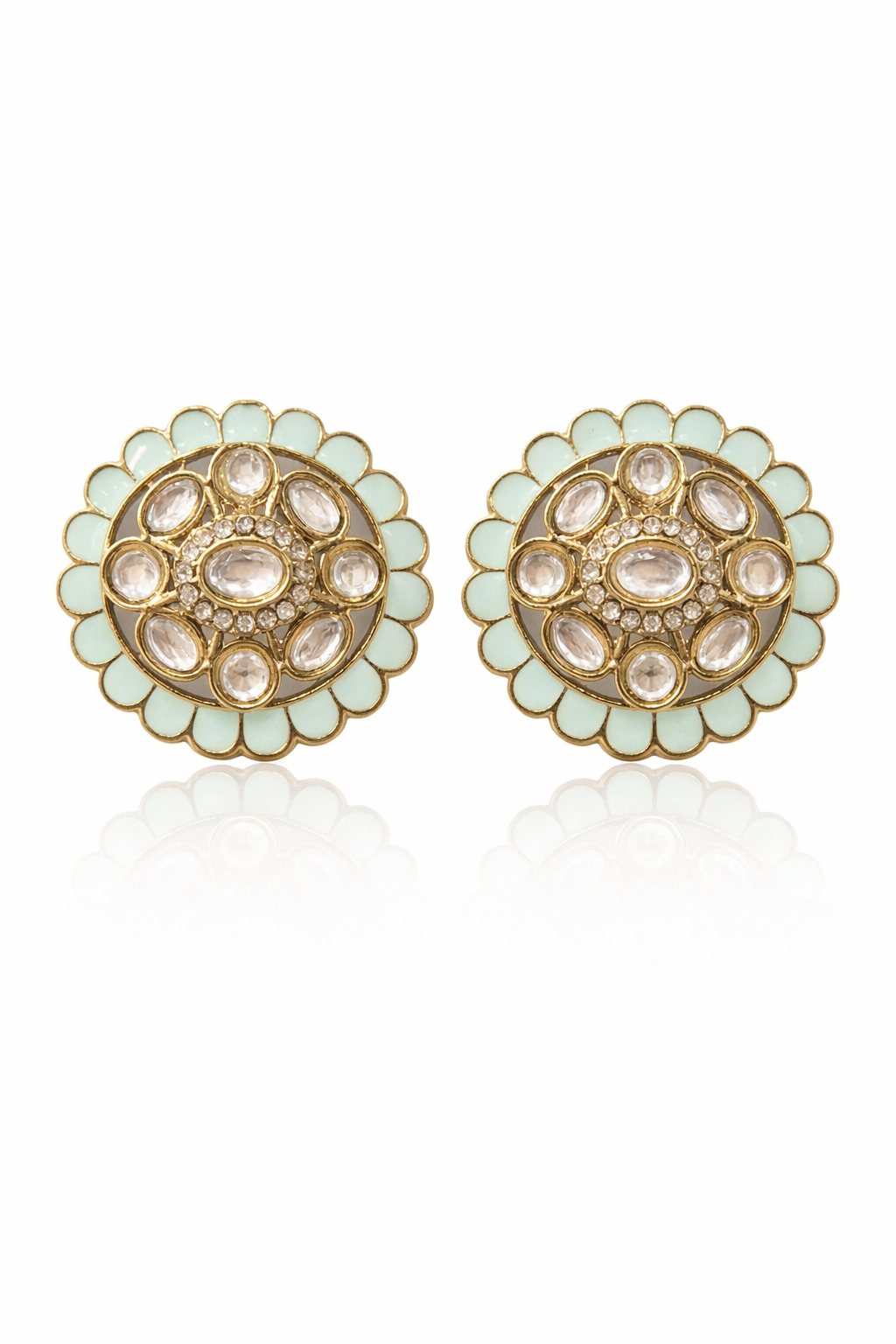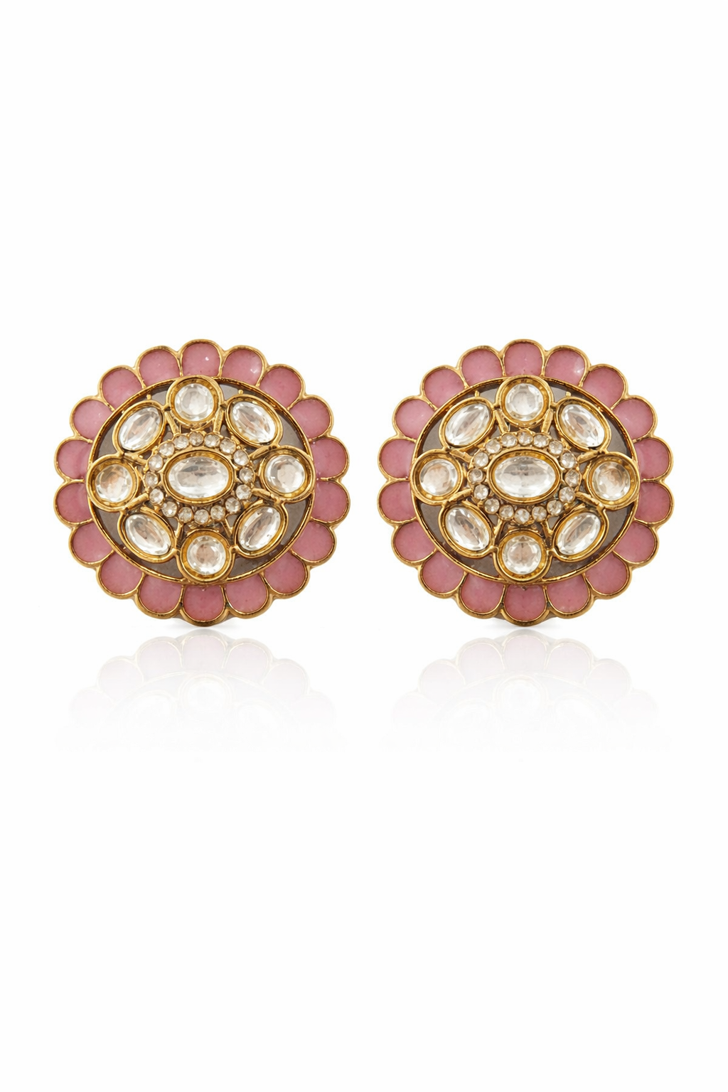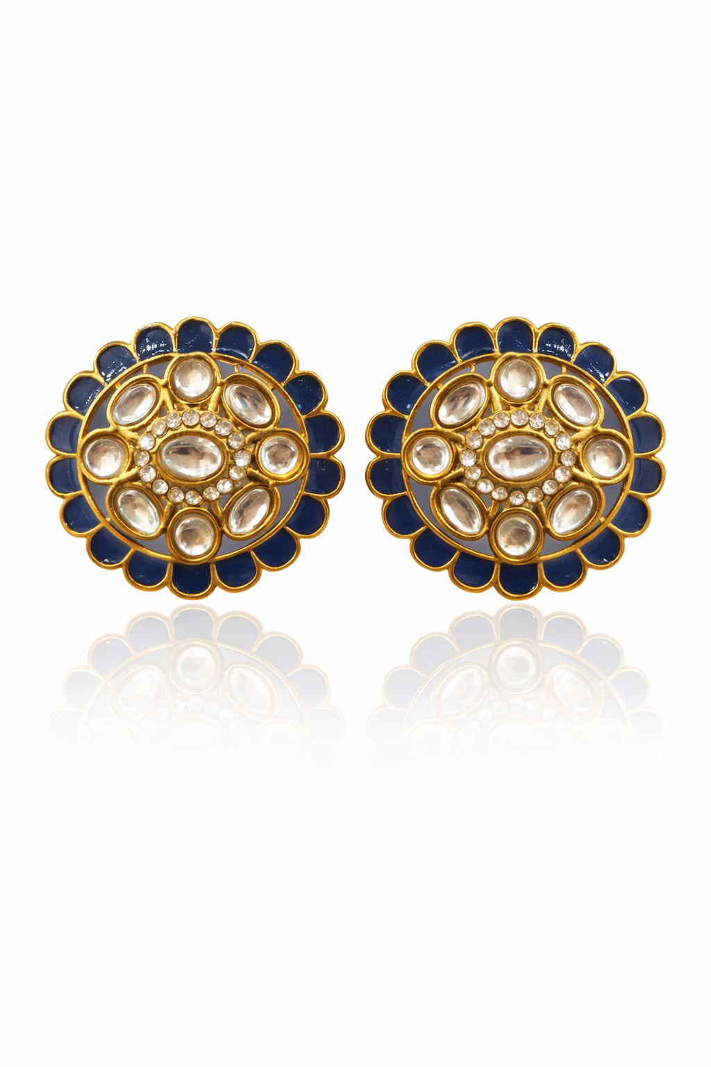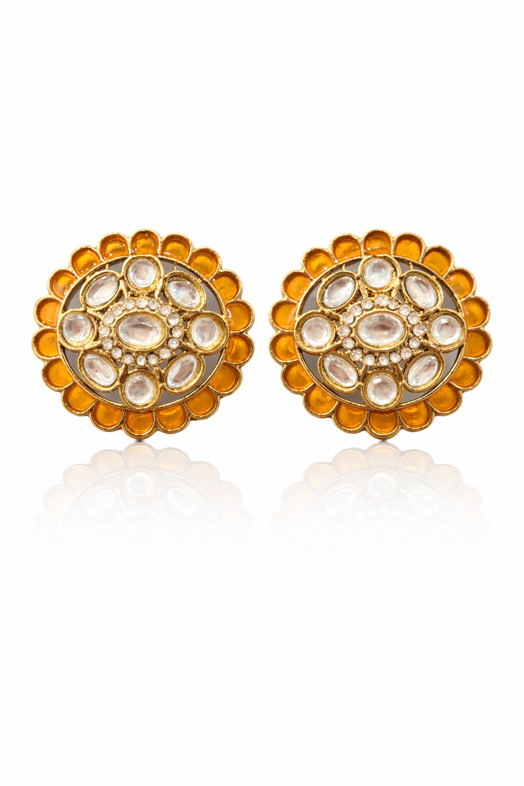 Add a touch of vibrant elegance to your look with these beautifully crafted statement stud earrings.Designed in a classic round floral pattern, these earrings feature a striking amber-yellow enamel border that frames a stunning arrangement of kundan-style stones at the center. The intricate detailing with oval and round crystal accents creates a rich, traditional look while maintaining a refined, modern finish.Perfect for festive occasions, weddings, and ethnic styling, these earrings effortlessly elevate both sarees and contemporary outfits