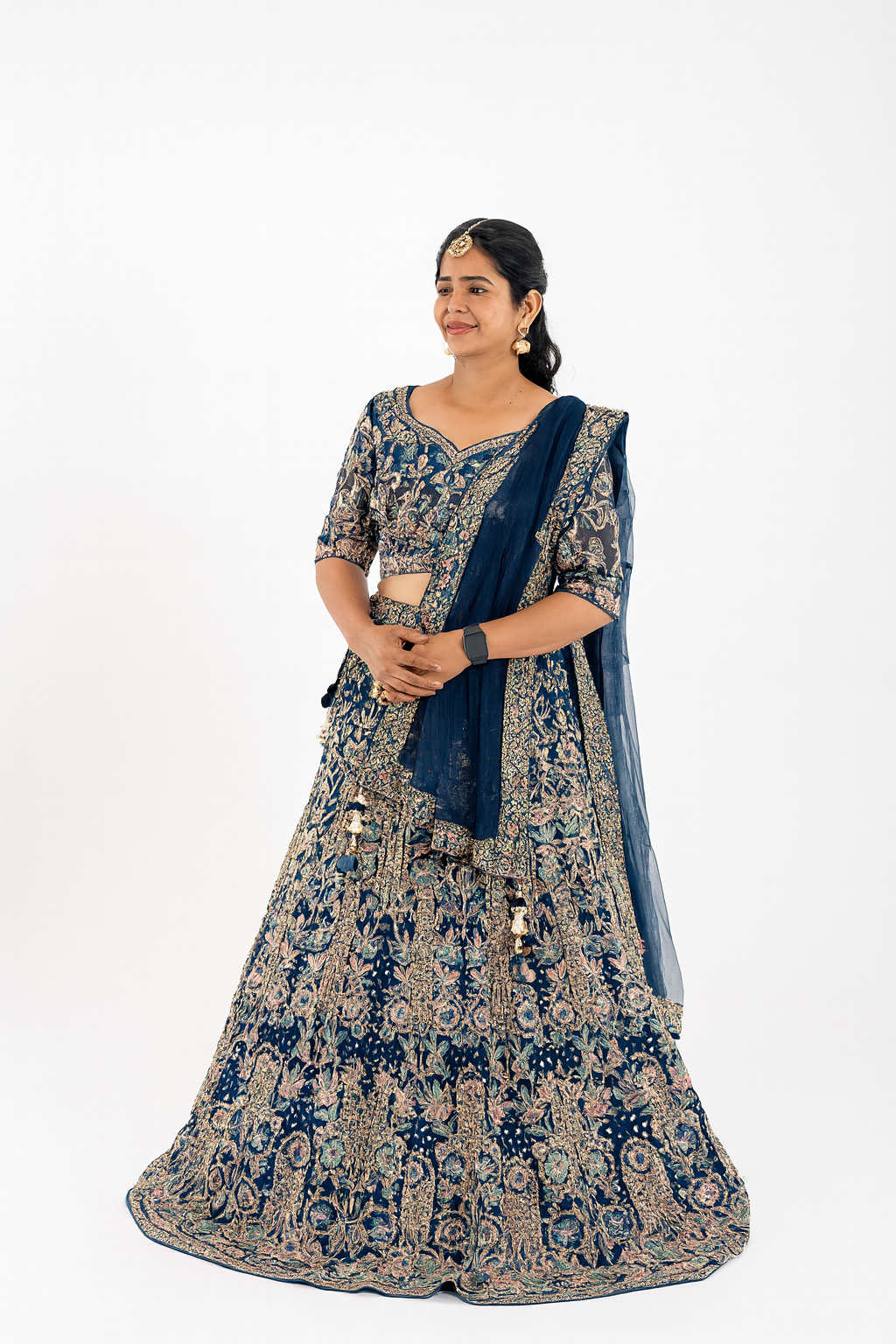 Overall, the heavy lehenga suit in full mirror and full embroidery works is a luxurious, stylish, and elegant choice for formal occasions. With its voluminous and flowy silhouette, intricate mirror and embroidery work, and matching dupatta, it is a timeless and versatile choice for any wardrobe.