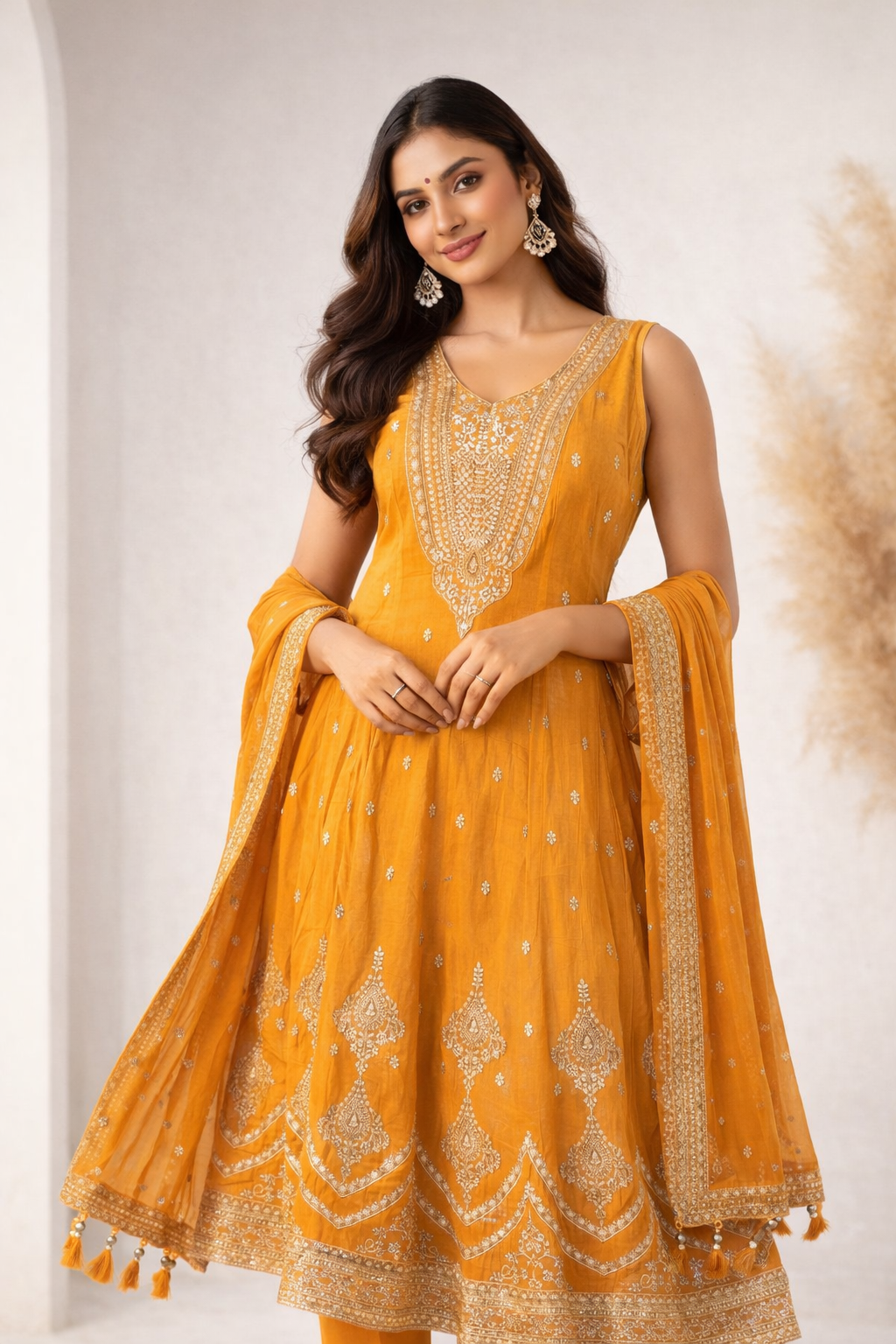 Elevate your ethnic wardrobe with this elegant Mustard Anarkali Gown Set, crafted to make a graceful statement at festive gatherings and special occasions.Designed with a flattering flared silhouette, this gown features intricate gold embroidery on the yoke and hemline, complemented by delicate buti work scattered across the body. The rich mustard hue paired with subtle shimmer gives it a timeless, festive appeal.Styled with matching straight pants and a coordinated dupatta finished with an embroidered border and tassel detailing, this ensemble blends traditional charm with modern elegance. Perfect for weddings, festive celebrations, and evening functions.