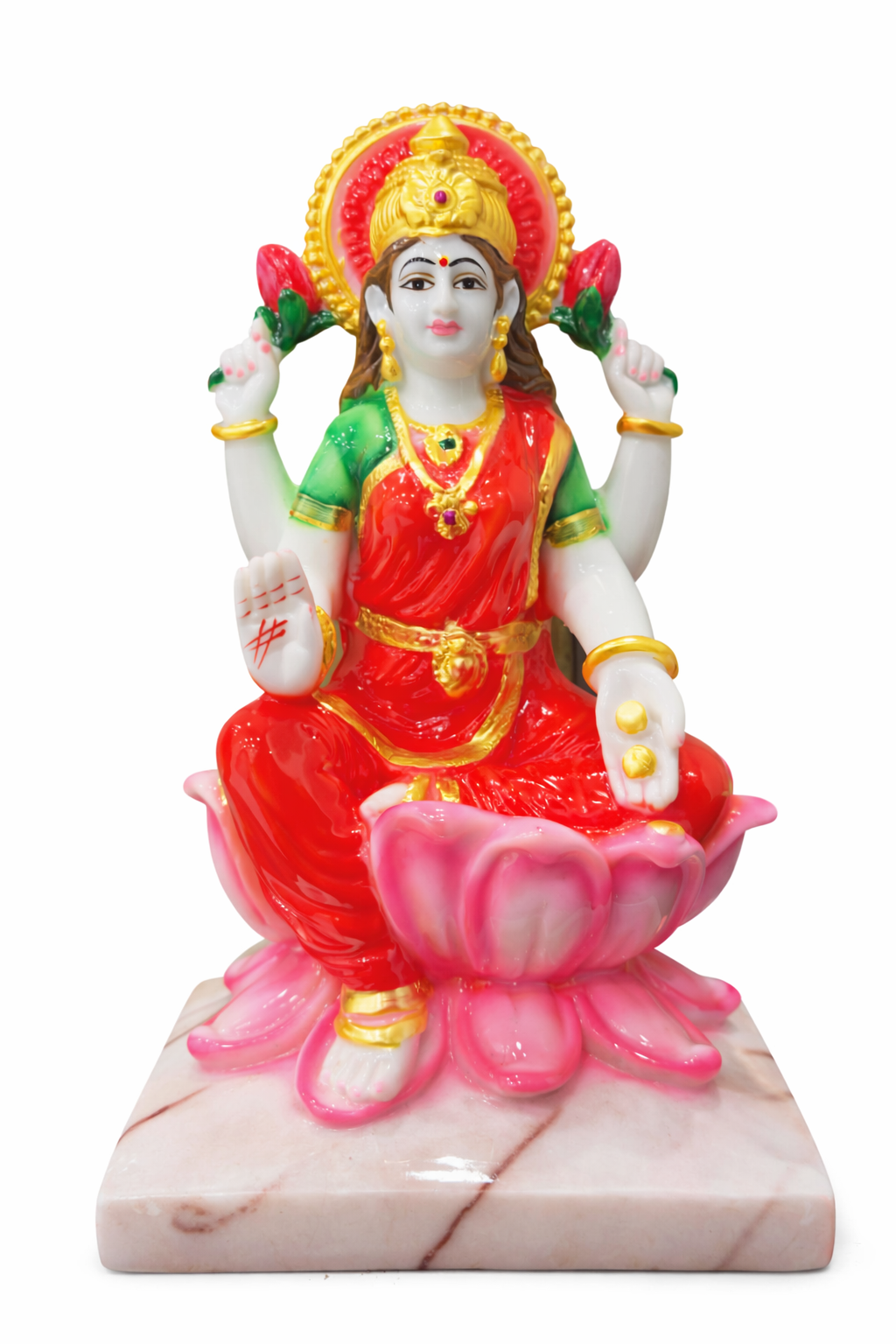 Adorned in a vibrant red saree with green blouse and elegant gold detailing, the statue showcases fine craftsmanship and intricate finishing. The golden crown, lotus flowers in her hands, and flowing coins represent blessings of prosperity and success. The polished marble base enhances its premium and devotional appeal.