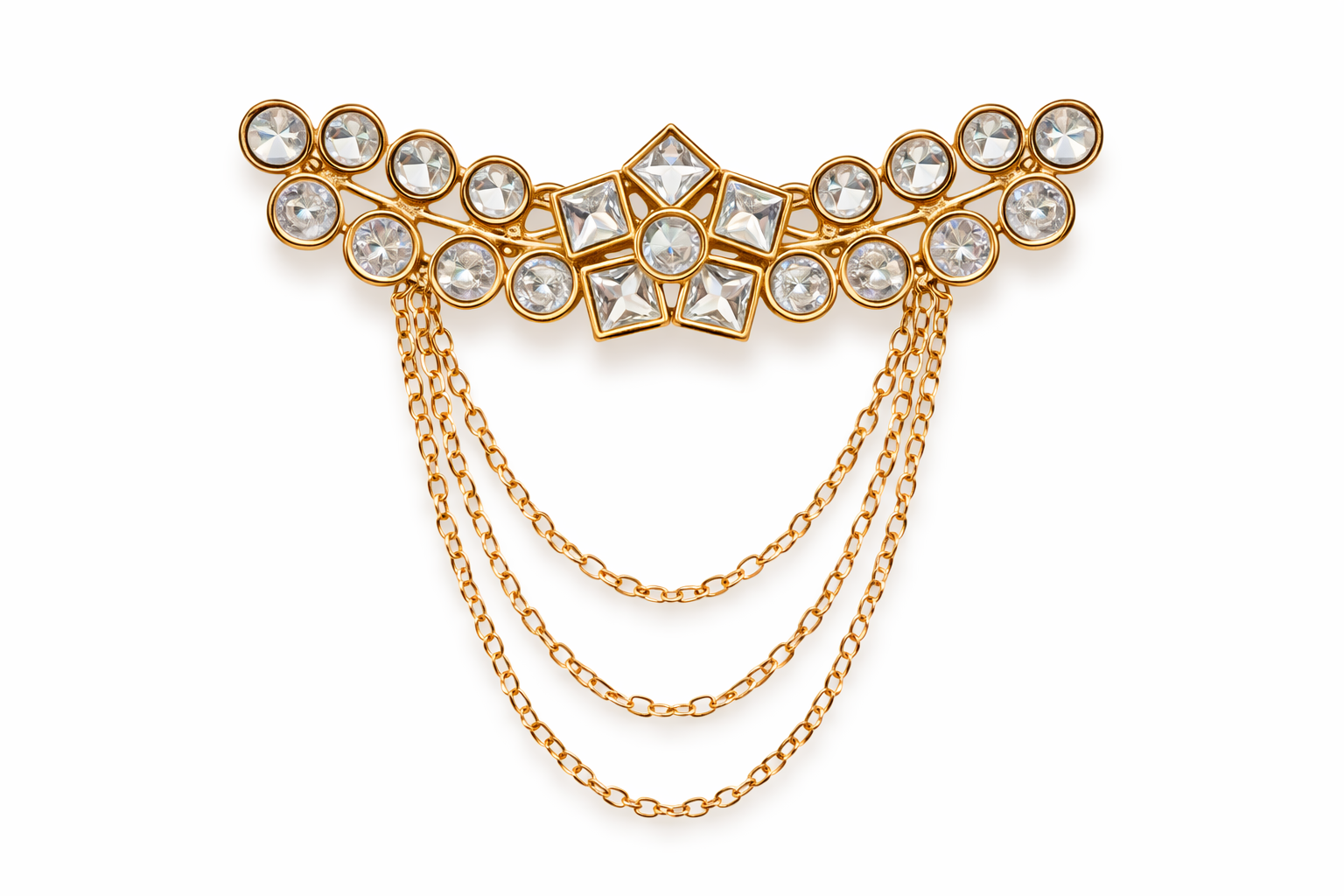 A stunning statement brooch designed to elevate any festive or formal look. This elegant gold-tone brooch features a beautifully balanced arrangement of sparkling round and square-cut crystal stones, forming a striking geometric centerpiece. The design is enhanced with delicate cascading chains that add graceful movement and a luxurious finish.Perfect for styling on sarees, lehengas, dupattas, gowns, blazers, or jackets, this versatile accessory blends traditional elegance with modern charm. Ideal for weddings, parties, and special occasions.