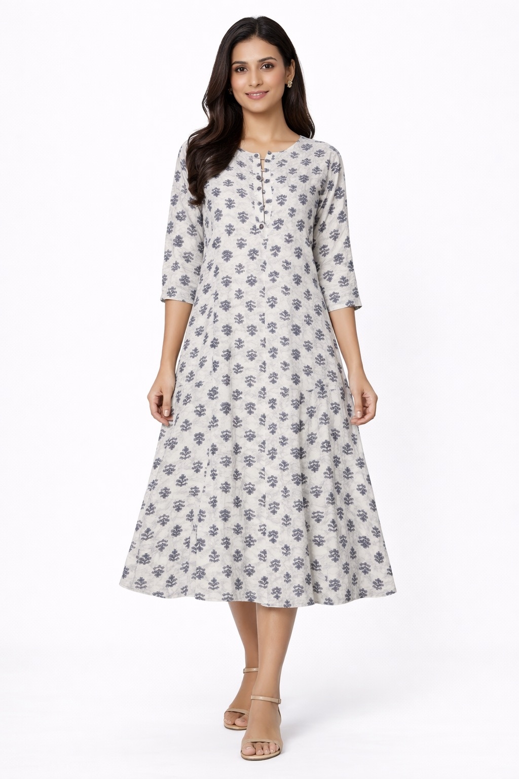 The flattering A-line cut, three-quarter sleeves, and buttoned neckline add a touch of timeless charm, making it ideal for casual outings, work, or festive gatherings.