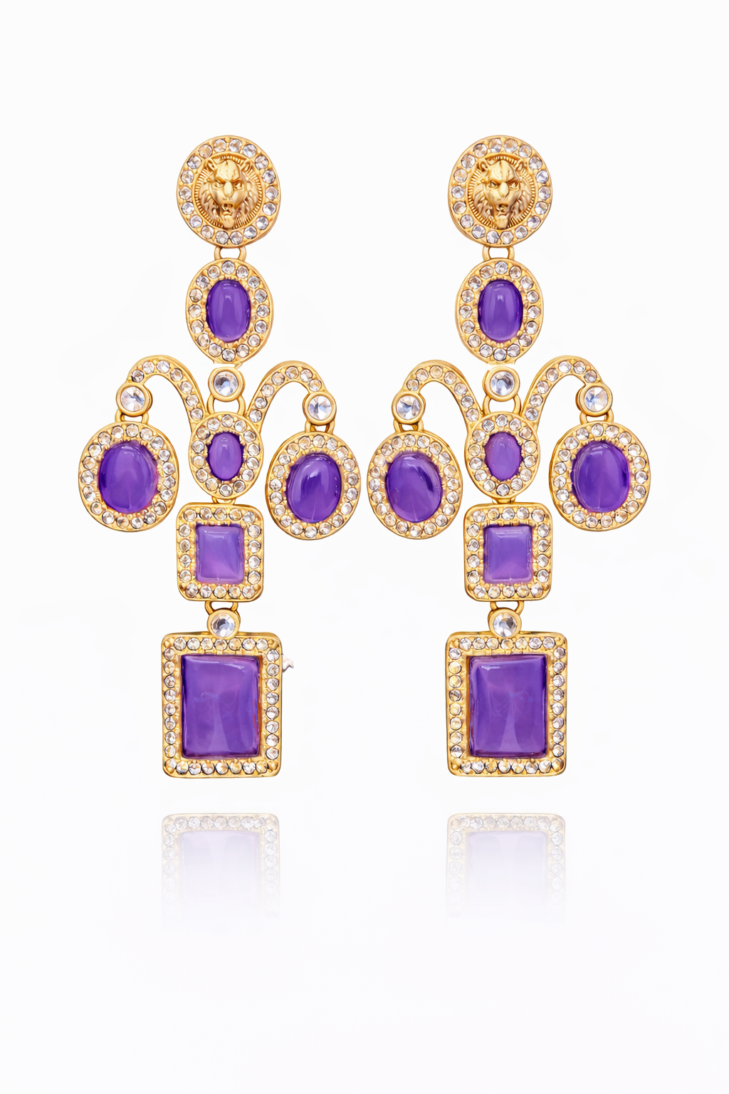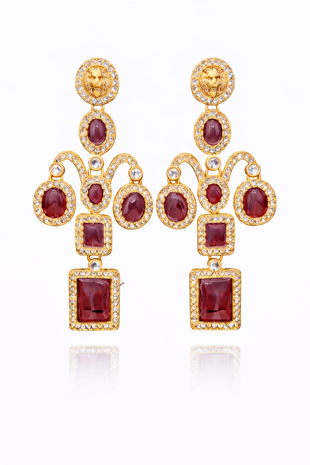 Design: Lion motif stud with multi-tier statement drop