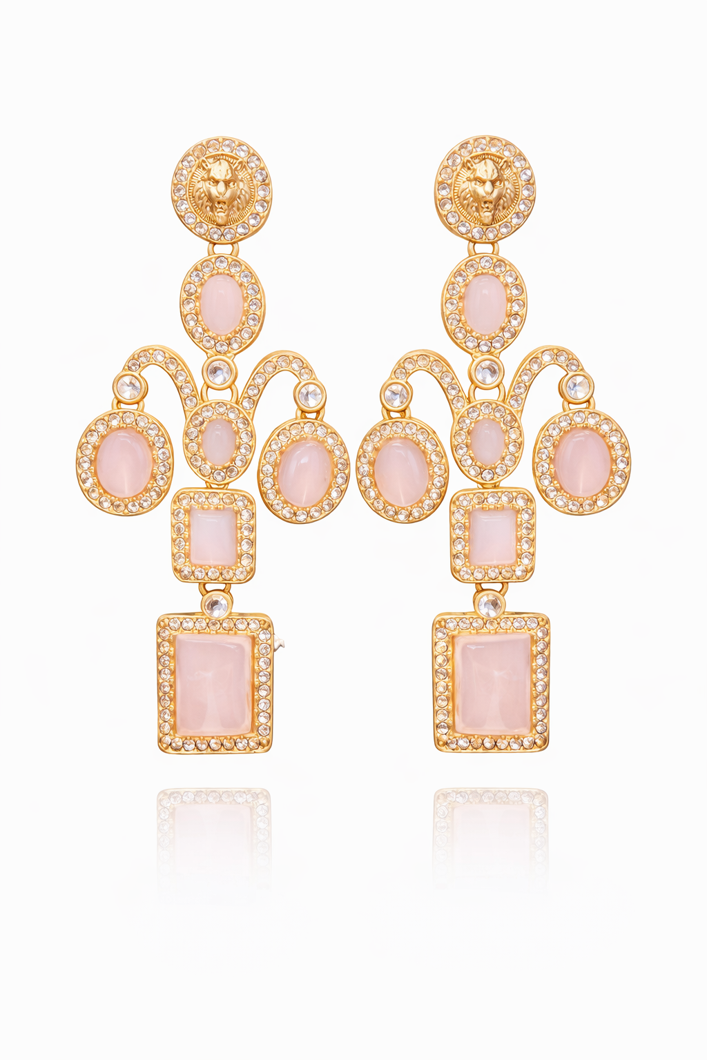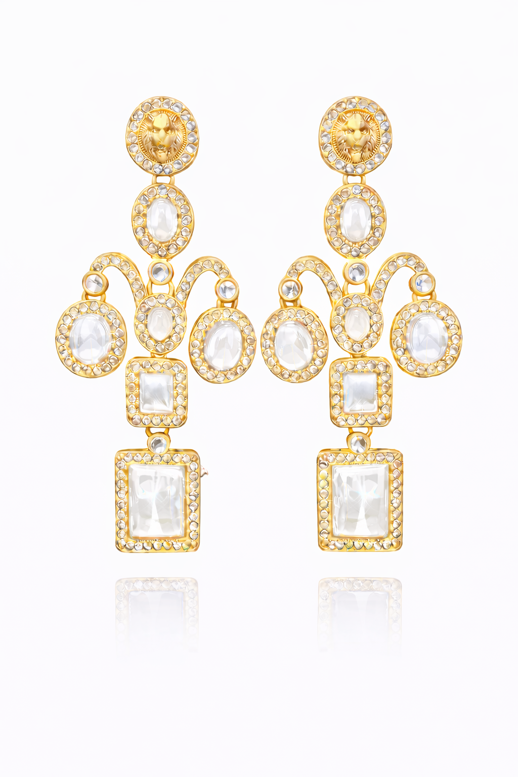Lion Motif Statement Drop Earrings Elevate your festive and bridal styling with these regal statement drop earrings crafted in a luxurious gold-tone finish. The design begins with a bold lion motif stud encircled by sparkling crystals, symbolising strength and elegance. Cascading below are beautifully arranged oval and square white stones, each framed with shimmering crystal borders and connected through graceful gold arches. The layered structure creates a striking chandelier effect with elegant movement and high visual impact.