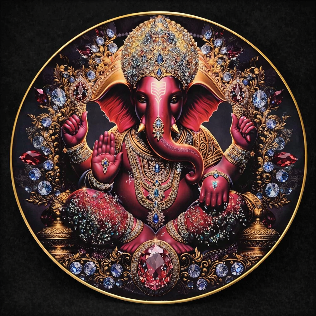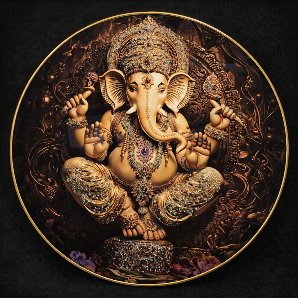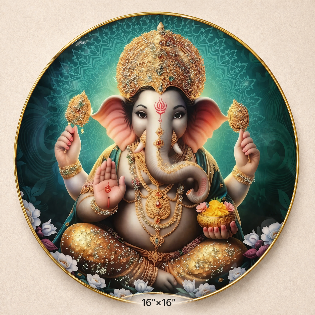 Bring home divine energy and celestial elegance with this beautifully crafted 16×16 Round Lord Ganesha Photo Frame. Featuring Lord Ganesha adorned in rich gold jewelry against a cosmic-inspired backdrop, this artwork blends traditional devotion with a modern, radiant aesthetic.The intricate detailing of the crown, ornaments, and sacred symbols is enhanced by a deep, galaxy-toned background with subtle sparkling elements, creating a powerful visual of divinity and grace. The elegant round gold frame adds a premium finish, making it a perfect statement piece for your home, prayer room, office, or gifting collection.